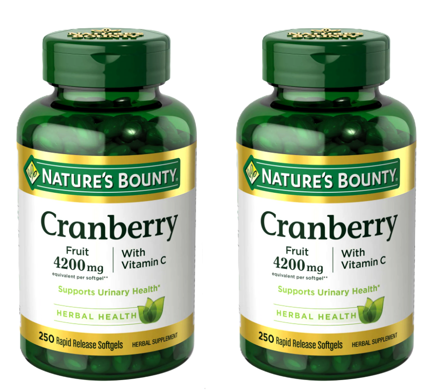 2 Pack - Nature's Bounty Cranberry Plus Vitamin C Softgels 4200mg, 250 CT Cranberries help support the integrity of bladder walls to promote urinary health in both men and women. This product also contains vitamin C that plays a role in supporting immune function. Made from the finest cranberry concentrate available. Supports urinary tract health: Cranberries contain compounds that can help prevent bacteria from sticking to the walls of the urinary tract, which can help reduce the risk of urinary tract infections (UTIs). Provides vitamin C: Vitamin C is an antioxidant that helps the body fight off infection. It is also important for the production of collagen, which is a protein that helps keep the skin, bones, and gums healthy. Easy to swallow: The softgels are small and easy to swallow, making them a convenient way to get your daily dose of cranberry and vitamin C. Gluten-free: The product is gluten-free, so you can be sure that it is made with high-quality ingredients. Non-GMO: The product is non-GMO, so you can be sure that it is made with high-quality ingredients. Made in the USA: The product is made in the USA, so you can be sure that it meets the highest quality standard. Ingredients: Other Ingredients: Gelatin, Soybean Oil, Vegetable Glycerin. Contains 2% of: Soy Lecithin, Yellow Beeswax. Contains Soy Ingredients. Directions: For adults, take two (2) softgels three times daily, preferably after meals. Warnings: If you are pregnant, nursing, taking any medications, planning any medical or surgical procedure or have any medical condition, consult your doctor before use. Discontinue use and consult your doctor if any adverse reactions occur. Keep out of reach of children. Store at room temperature. Do not use if seal under cap is broken or missing.