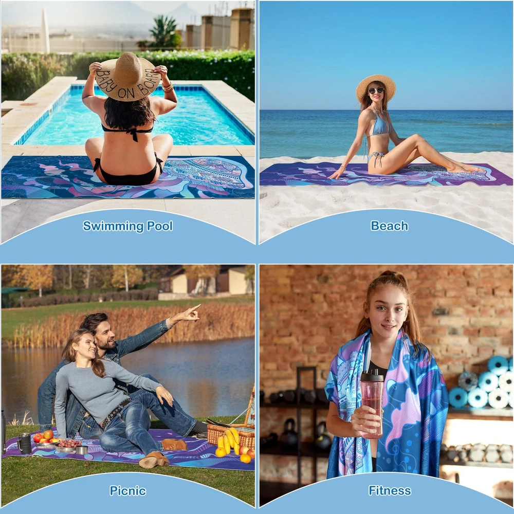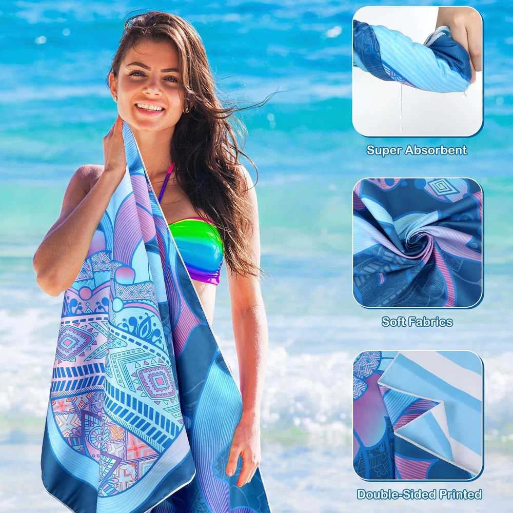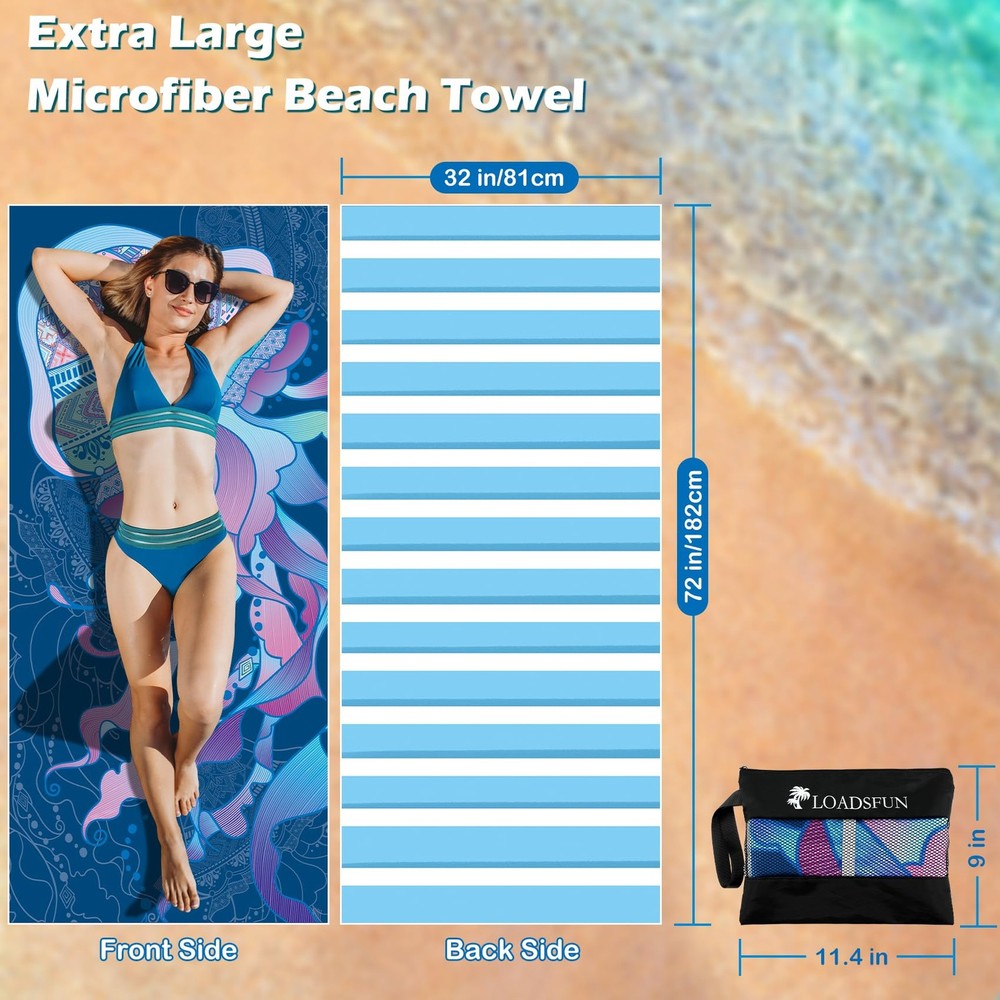Size : This beach towel measures 72 x 32 inch when unfolded. Pack: 2 Pack Beach Towels Oversized & Soft Materail : The 72 x 32 inch oversized beach towels can cover the whole body or ride on a beach chair, suitable for men, women and children. Microfiber beach towels are very soft and comfortable, colorfast, odorless and gentle on your skin. Lightweight and Portable: The beach towels is made of microfiber material, lightweight and compact when folded, easy to put in backpack, pocket or beach bag, won't take up too much space. Perfect for beach, pool, camping, sports, yoga, traveling, bathing. Super Absorbent & Quick Dry: Microfiber beach towels can absorb water quickly, perfect for drying your body after swimming or showering to stay warm and comfortable. When exposed to sunlight, the towel can be quick-drying and easy to use for multiple times. Sand Free : The beach towel is sand proof and can be placed directly on the beach or grass. Just a gentle shake will remove all the sand and keep your items clean and tidy. Double Sided Pattern Design : There are a variety of brightly colored patterns of beach towels to choose from, including cute sea creatures, blue mandala, simple striped design, which is an indispensable fashion item for the beach. The beach towel is machine washable and will not fade, also suitable as a gift for friends and family.