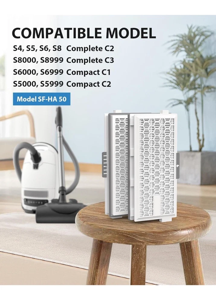 Top highlights Brand CFKREYA Material Plastic Compatible Devices ‎Miele AirClean SF-HA 50 Filter for Model # S4, S5, S6, S8, S8000, S8999, S6000, S6999, S5000, S5999, S4000, S4999, Complete C2 & C3‎Miele AirClean SF-HA 50 Filter for Model # S4, S5, S6, S8, S8000, S8999, S6000, S6999, S5000, S5999, S40… See more Product Dimensions 7.67"L x 1.14"W x 3.74"H Reusability Disposable Number of Pieces 3 Compatible with Miele S4, S5, S6, S8, S8000, S8999, S6000, S6999, S5000, S5999, S4000, S4999, Complete C2, Complete C3, Compact C1, Compact C2. Do not work with Classic C1 model The SF-HA 50 HEPA filter effectively captures 99.95% of particles as small as 0.3 microns, ensuring that the air in your home is fresher when you vacuum 3 Pack of SF-HA 50 HEPA filters, compatible with Miele vacuum cleaners. This complete set provides enough cleaning alternatives to improve indoor air quality while you vacuum. The Premium Vacuum Filter Value Pack helps you change the filter more often The filter is very easy to install without any tools, and we recommend replacing it once every 2-3 months to keep your vacuum cleaner performing at its best Our responsive customer service team is fully committed to ensuring you have the best experience possible! If you have any questions or concerns, please contact us and we will answer ASAP