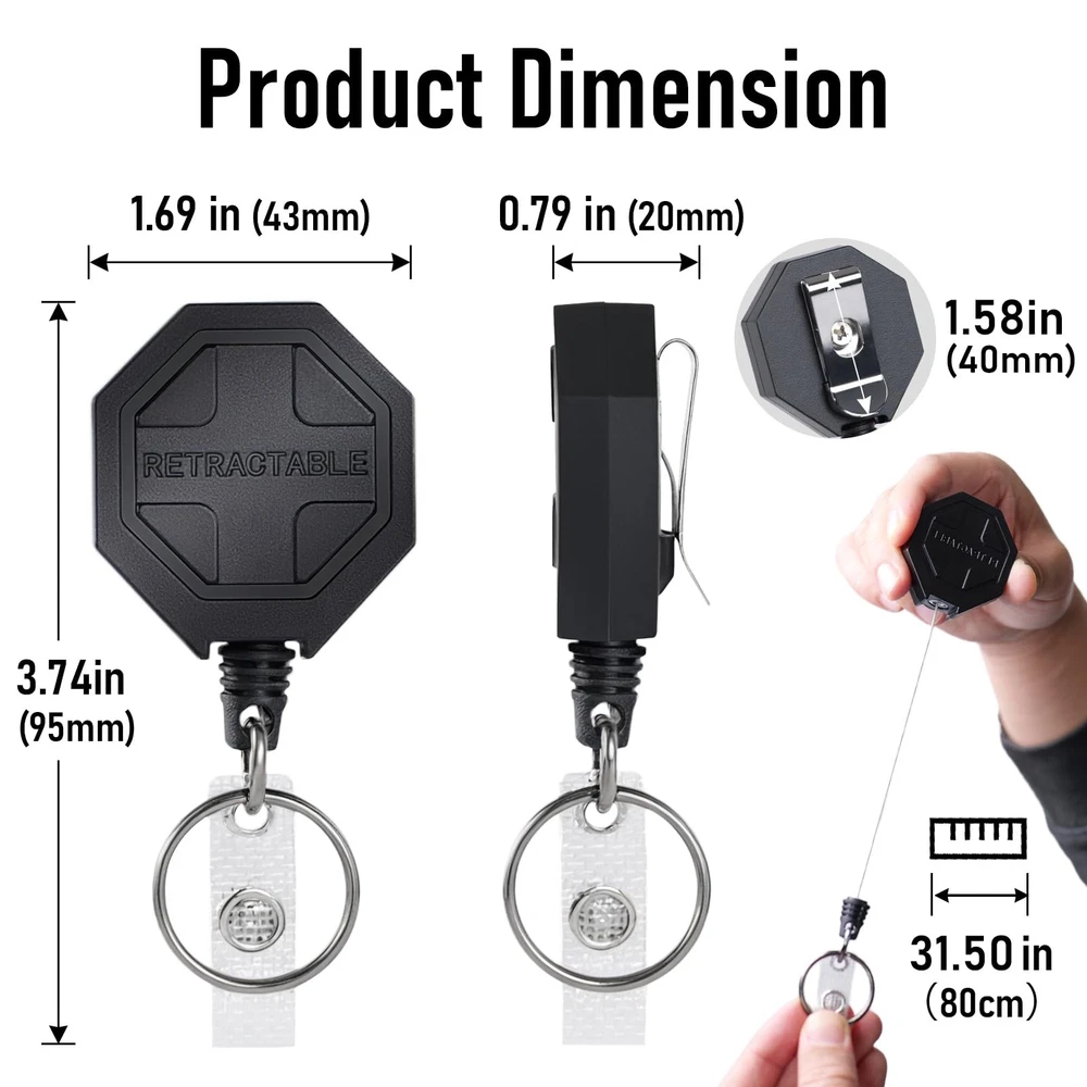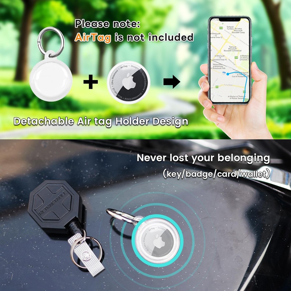 2 pcs Retractable keychain with 2 pcs black airtag holder/case 【Secure & Durable Combo】:retractable keychain and Airtag holder combo offers detachable design - use them together or separately! The steel cord and metal clip securely hold keys, badges without slipping. 【8 oz Retraction】:Engineered with a reinforced spring mechanism, this heavy duty badge reel supports most items (8oz/227g) like badges and most keys. The anti-slip cord stays taut even with frequent pulls. 【31.5" Extended Cord】:With a 31.5" steel cord, easily access doors, lockers, or scanners without removing your keys. The smooth retraction system prevents tangling, ideal for backpacks, belts or lanyards. 【Multi-Use & Versatile】:Attach the Airtag holder to valuables (bags, wallets) for anti-loss tracking, or clip the retractable keychain to belts/backpacks. Both units feature a swivel hook for 360° rotation - adapts to any angle! 【Trusted by Professionals】:2 pack set includes everything for work or travel: 2 retractable keychains + 2 Airtag cases. airTag retractable keychains backed by a 12-month - trusted by hospital staff, teachers, Office workers and outdoor enthusiasts.