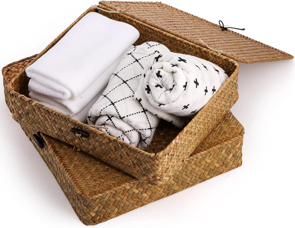 Store New Arrivals Add to Favorite View Feedback Contact 2 Pack Seagrass Baskets with Lid, Wicker Storage Baskets Flat Rattan Storage Bins, Woven Organizer Baskets for Shelf, Closet, Bedroom Description Item model number Seagrass Basket Style Rustic Country of Origin China With Lid Yes Number of Pieces 2 Room Type All Finish Natural Product Dimensions 3"D x 11"W x 3"H Material Sea Grass Handle Material Seagrass Finish Type Natural Closure Type Buckle Batteries Required? No Item Weight 1.28 pounds Special Features Lid, Stackable Special Feature Lid, Stackable Part Number Seagrass Basket Color Natural Shape Rectangular Batteries Included? No Recommended Uses For Product Storage Elsjoy 2 pack seagrass storage baskets come in 2 sizes, Large 12.5"L x 11"W x 3"H, Small 11.5"L x 9.5"W x 2.5"H. Natural seaweed baskets eliminate clutter, also add a touch of elegance and natural scent to your home. ๐๐๐ญ๐ฎ๐ซ๐๐ฅ ๐๐๐๐ ๐ซ๐๐ฌ๐ฌ: Storage basket set is made from 100% natural seagrass, ensuring years of durability and sustainability. Each basket comes with a light grass fragrance and subtle color variations that make it unique. ๐๐จ๐ฅ๐ข๐ ๐๐จ๐ง๐ฌ๐ญ๐ซ๐ฎ๐๐ญ๐ข๐จ๐ง: Wicker basket has a flat rectangular shape which makes it easy to place in any corner or space around your home. It is supported by a metal frame for solid hold and durability. ๐๐๐ฌ๐ฒ ๐ญ๐จ ๐๐ฌ๐: Stackable, portable & lidded. Moves easily from one room to another. The smaller basket can be stacked inside or on top of the big one, or they can be used individually. The lid can be easily opened by untying the knot. ๐๐๐ซ๐ฌ๐๐ญ๐ข๐ฅ๐: Woven basket set is ideal for storing CDs, books, remote controls, snacks, and anything else in the living room. Suitable for keeping clothes, skin care products, magazines in the bedroom, toiletries, towels in the bathroom. ๐๐จ๐ญ๐: ๐๐๐ญ๐ฎ๐ซ๐๐ฅ ๐ฌ๐๐๐ ๐ซ๐๐ฌ๐ฌ ๐ฏ๐๐ซ๐ข๐๐ฌ ๐ข๐ง ๐๐จ๐ฅ๐จ๐ซ ๐ญ๐จ๐ง๐, ๐๐ซ๐จ๐ฆ ๐ฅ๐ข๐ ๐ก๐ญ ๐ญ๐จ ๐๐๐ซ๐ค, ๐ฌ๐จ ๐ญ๐ก๐ ๐๐๐ฌ๐ค๐๐ญ ๐ฆ๐๐ฒ ๐๐ฉ๐ฉ๐๐๐ซ ๐ฌ๐ฅ๐ข๐ ๐ก๐ญ๐ฅ๐ฒ ๐๐ข๐๐๐๐ซ๐๐ง๐ญ ๐๐ซ๐จ๐ฆ ๐ญ๐ก๐ ๐ฉ๐ข๐๐ญ๐ฎ๐ซ๐. Product Description Elsjoy Set of 2 Seagrass Woven Baskets They are handwoven by artisans and make the perfect rustic home decor piece. Woven storage bins are made from 100% seagrass. These woven seaweed baskets not only provide storage functionality, but also offer a natural scent. Seagrass baskets with lids are the perfect way to organize and keep your important items dust-free. You will enjoy the rustic elegance and warmth they bring to your home. Set of large and small baskets for organizing snacks, skin-care products, toys, books, clothes, toiletries, etc. You can easily stack them up and use them in a bedroom, living room, study room, bathroom, office, closets, and cabinets. Easy to Use Toggle Accented with a wood button on the toggle closure, which gives it a natural touch. Stackable Stack them on the counter, inside cabinets, and in closets to maximize storage space. Metal It is supported by a metal bracket inside that prevents it from deforming. Versatile Toiletries Clothes Small Items Get your home organized with seagrass baskets Seagrass baskets are made with fine craftsmanship for easy storage. The container is lightweight and convenient to use every day. Simple wiping down with a damp towel will keep them looking good. You don't have to worry about polluting the environment either, since they quickly biodegrade. ABOUT US We offer the best prices around on high quality products. Our E-store includes media such as books, movies, music and games while offering electronics, toys, sporting apparel, clothing, tools, general home, garden items and more. SHIPPING We are always working hard to ensure your package arrives as soon as possible. Please understand that some factors like weather, high postal traffic, and the performance of shipping companies are outside of our control. We offer free shipping to the lower 48 states and ship within 2 business days of payment, usually sooner. We do not accept P.O. Boxes. Please provide a physical address. For shipping outside of the continental USA, we only use eBay's Global Shipping Program.The item is shipped to KY and then sent to the rest of the world. International customers are responsible for all duties and taxes. Continue to check out in order to calculate costs for shipping the item to your country. Messages regarding eBay's Global Shipping Program MUST be directed at eBay EXCLUSIVELY. RETURNS We offer a 30-Day Return Policy on items which you are not completely satisfied with. You have the option for a full-refund or an exchange of the item. No returns are available on items shipped outside of the USA. PAYMENT We accept PayPal. CONTACT US This page content is yet to come Please ad us to your favorite seller and visit again later Thank You CUSTOMER SATISFACTION We try our very best to make sure every customer is completely satisfied. If there's a problem, message us! We're happy to help. WE ACCEPT Copyright ยฉ 2021 AutoDS. | All Rights Reserved