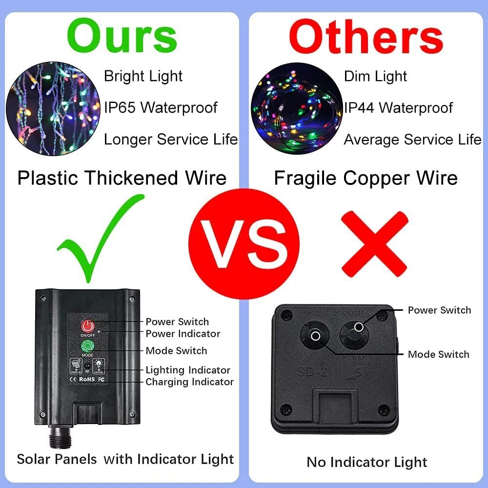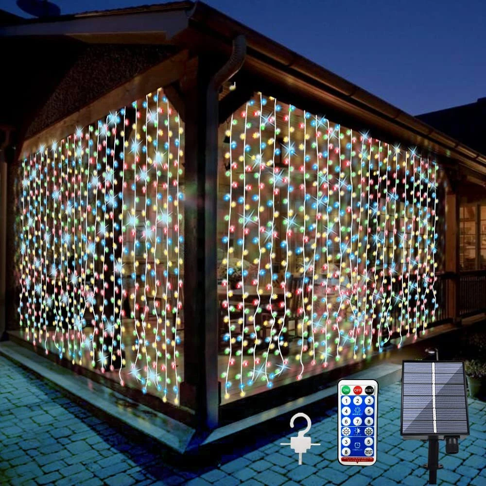 [Durable Solar Panel Curtain Lights] At the bottom of the solar panel, we have set the switch button, switch mode button and reminder indicator. The upgraded solar panels can run at full load for 12-24 hours. On a sunny day, it takes about 6 hours to fully charge the battery, which is safer than other households. [Smart Remote Control] This solar curtain light has many functions, all functions are controlled by the remote control, there are 8 different modes, represented by numbers 1-8, in addition to brightness adjustment and timing functions, full of sense of science and technology, let you at any time Use the remote control to complete the operations you want anytime, anywhere. [8 Lighting Modes] Our outdoor curtain lights have 8 modes lighting effects, namely: combination, wave, sequence, slow light, chase/flash, slow fade, blink/flash, constant light, you can choose the effect of your light according to your own preference and perception needs, this kind of curtain light improves the right of independent choice, after using it, you will feel that it is worthwhile. [High Quality and Toughness] The solar garden light contains 2 pack * 300 3m*3m high-brightness LEDs. The super soft wire can easily surround plants, eaves, roofs, pavilions and pavilions, and can be collected together for next use after use. Bright lights make your entire yard full of life [Weatherproof Design] Due to its IP65 waterproof rating, our outdoor decorative lights can resist rain, snow, dust, extreme heat, etc. The improved solar panel can store electricity for up to 40 hours, so it can be used normally in rainy and cloudy days.