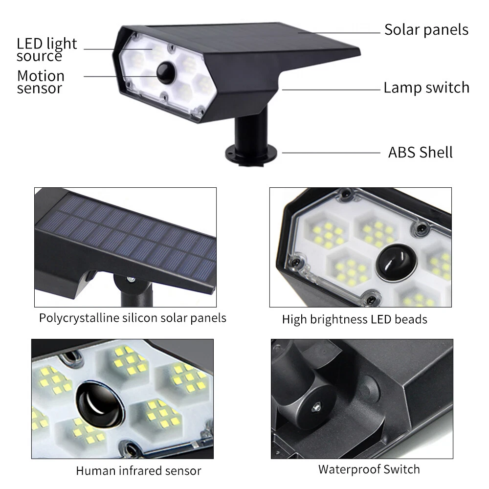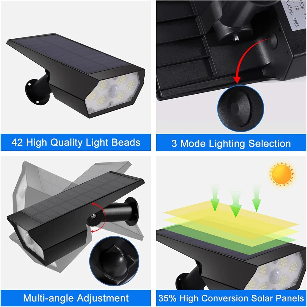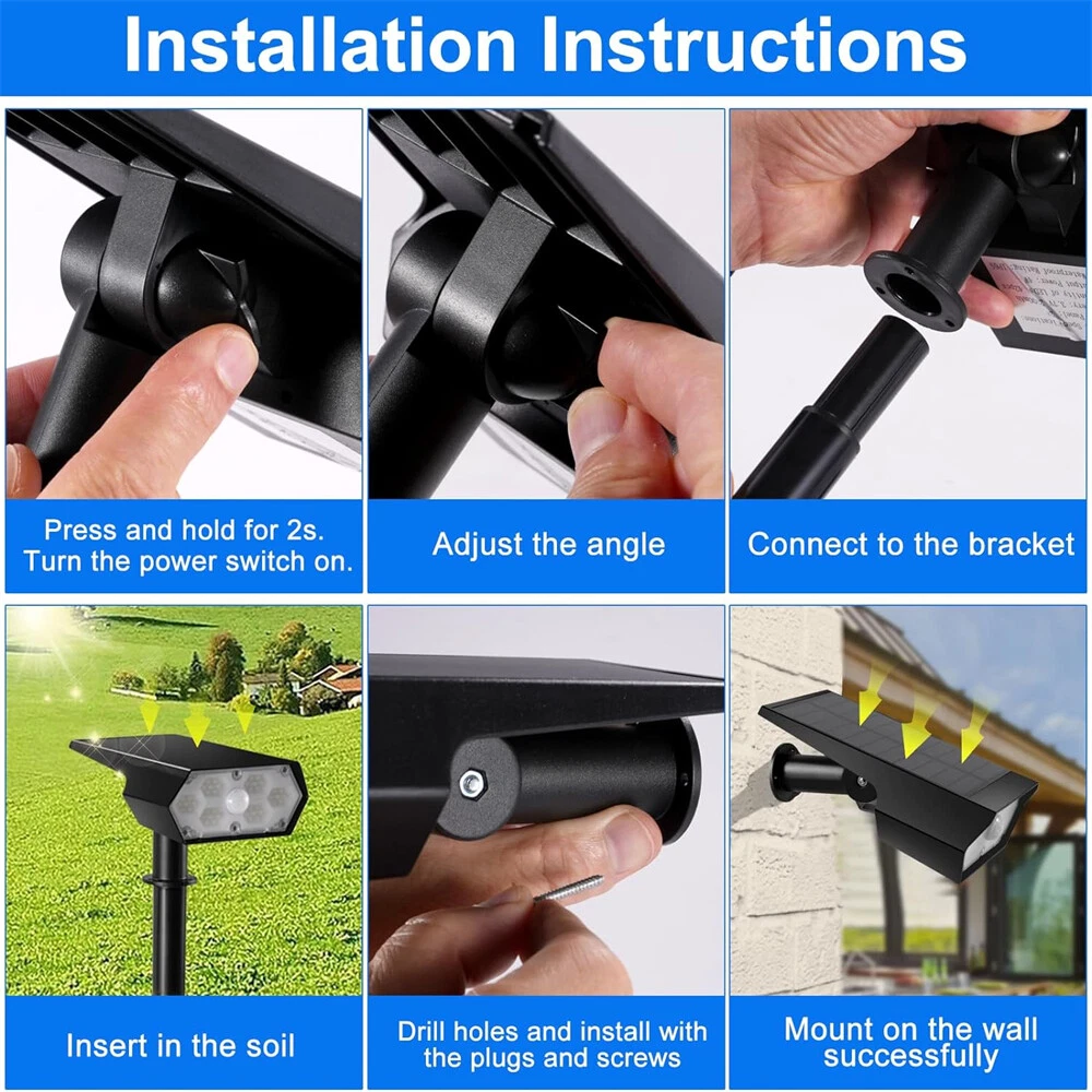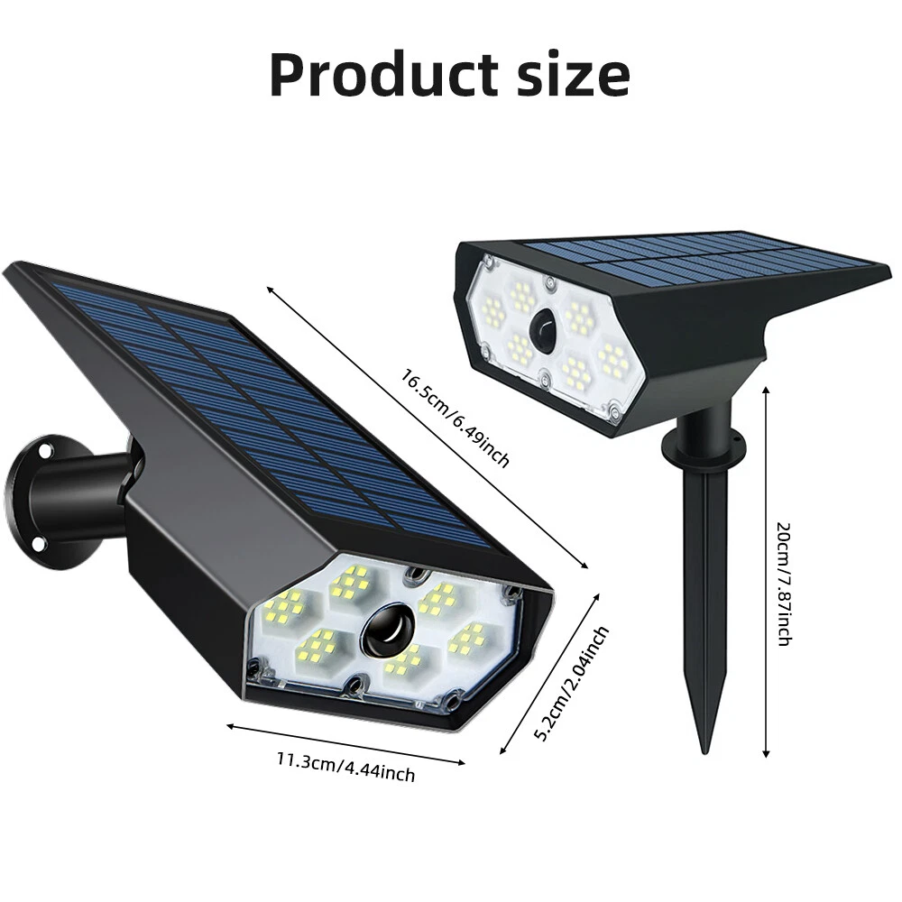 【Upgraded Bright Motion Sensor Spotlights】 : Our Solar Outdoor Spotlights has 42 high-quality LED beads and provide super bright 6500K light, which can increase brightness and illumination range of solar landscape spotlights. Equipped with photosensitive control and PIR sensor, our Solar Motion Lights have 140° detection angle and 8-10 meters sensing distance, which can triggered by human, animals, cars, bicycles, etc. 【High-Efficient & 2200mAh Large Capacity Battery】 : With large high-efficiency polysilicon solar panel, Solar Outdoor Lights can achieve up to about 35% conversion rate, so our outdoor solar spotlights have longer runtime. Built-in rechargeable 2200mAh Large Capacity Battery, it only takes 6-8 hours to charge under sunlight, and can work for 10-12 hours or even longer on the lightest mode. 【3 Lighting Modes】 : The motion sensor spotlights have both light sensing and motion sensing functions. Light Sensing Auto On/Off: The lights will turn off and charge in the daytime and automatically start to work at dusk. 3 Lighting Modes, you can set the mode as you like. 【 Durable and IP65 Waterproof】 : Made of high-quality durable ABS plastic, IP65 waterproof rate, the solar outdoor lights are heat resistant and frost resistant, can not only work in extreme weather, but also reach a a service life of 40000+ hours, perfect for lighting up in various outdoor scenes and landscape. 【 2 installation methods & easy installation 】 :The outdoor light of the motion sensor can be inserted into the ground with wooden stakes or installed on the wall (including screws). You can choose the installation method according to your own needs, which is perfect for yards, patios, garages, passages, gardens, walls and sidewalks.