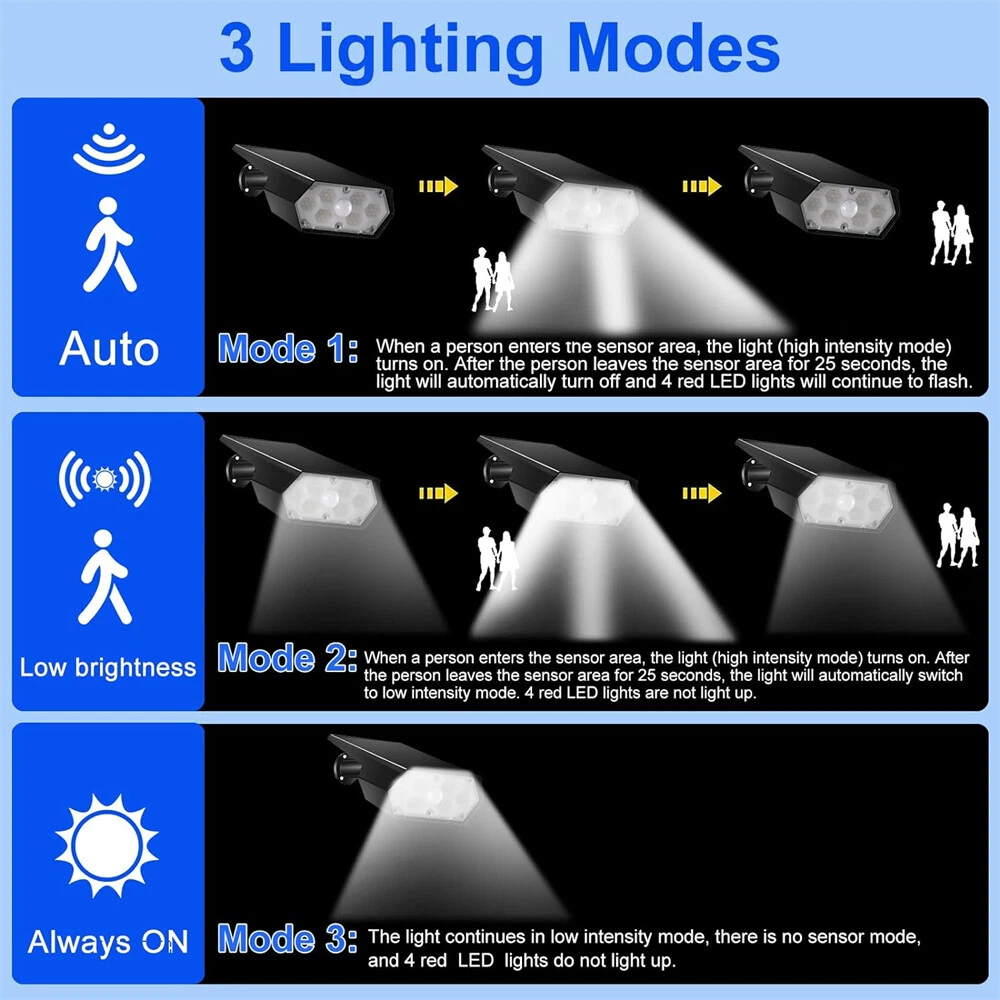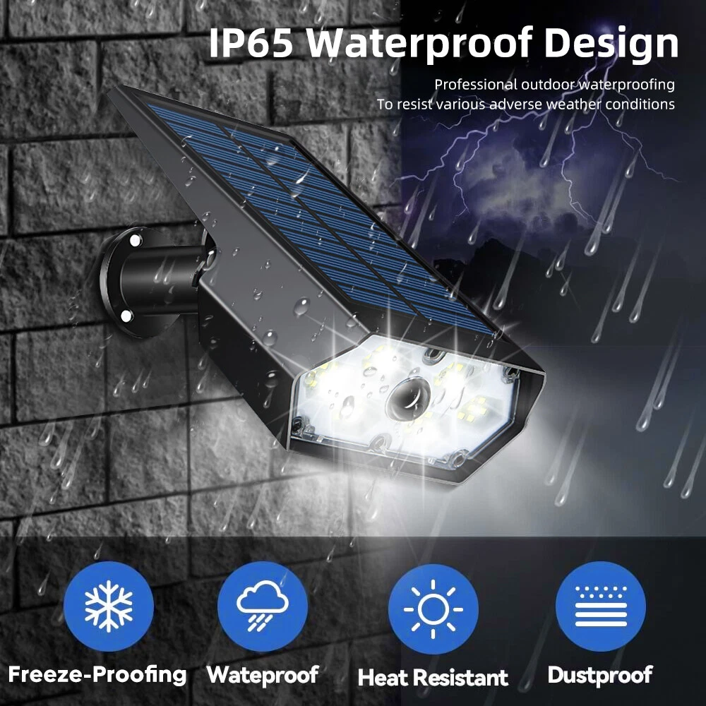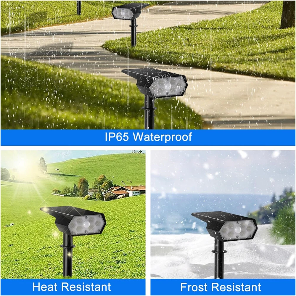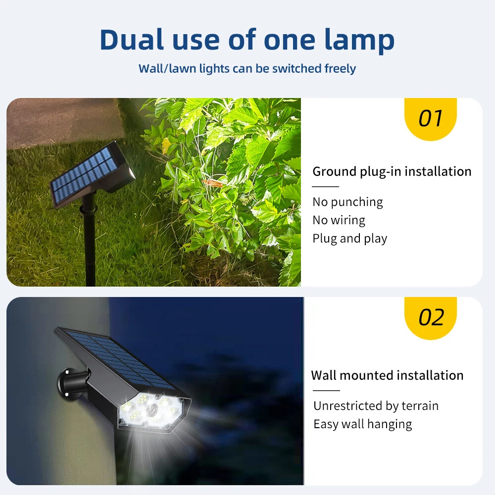 【Upgraded Bright Motion Sensor Spotlights】 : Our Solar Outdoor Spotlights has 42 high-quality LED beads and provide super bright 6500K light, which can increase brightness and illumination range of solar landscape spotlights. Equipped with photosensitive control and PIR sensor, our Solar Motion Lights have 140° detection angle and 8-10 meters sensing distance, which can triggered by human, animals, cars, bicycles, etc. 【High-Efficient & 2200mAh Large Capacity Battery】 : With large high-efficiency polysilicon solar panel, Solar Outdoor Lights can achieve up to about 35% conversion rate, so our outdoor solar spotlights have longer runtime. Built-in rechargeable 2200mAh Large Capacity Battery, it only takes 6-8 hours to charge under sunlight, and can work for 10-12 hours or even longer on the lightest mode. 【3 Lighting Modes】 : The motion sensor spotlights have both light sensing and motion sensing functions. Light Sensing Auto On/Off: The lights will turn off and charge in the daytime and automatically start to work at dusk. 3 Lighting Modes, you can set the mode as you like. 【 Durable and IP65 Waterproof】 : Made of high-quality durable ABS plastic, IP65 waterproof rate, the solar outdoor lights are heat resistant and frost resistant, can not only work in extreme weather, but also reach a a service life of 40000+ hours, perfect for lighting up in various outdoor scenes and landscape. 【 2 installation methods & easy installation 】 :The outdoor light of the motion sensor can be inserted into the ground with wooden stakes or installed on the wall (including screws). You can choose the installation method according to your own needs, which is perfect for yards, patios, garages, passages, gardens, walls and sidewalks.