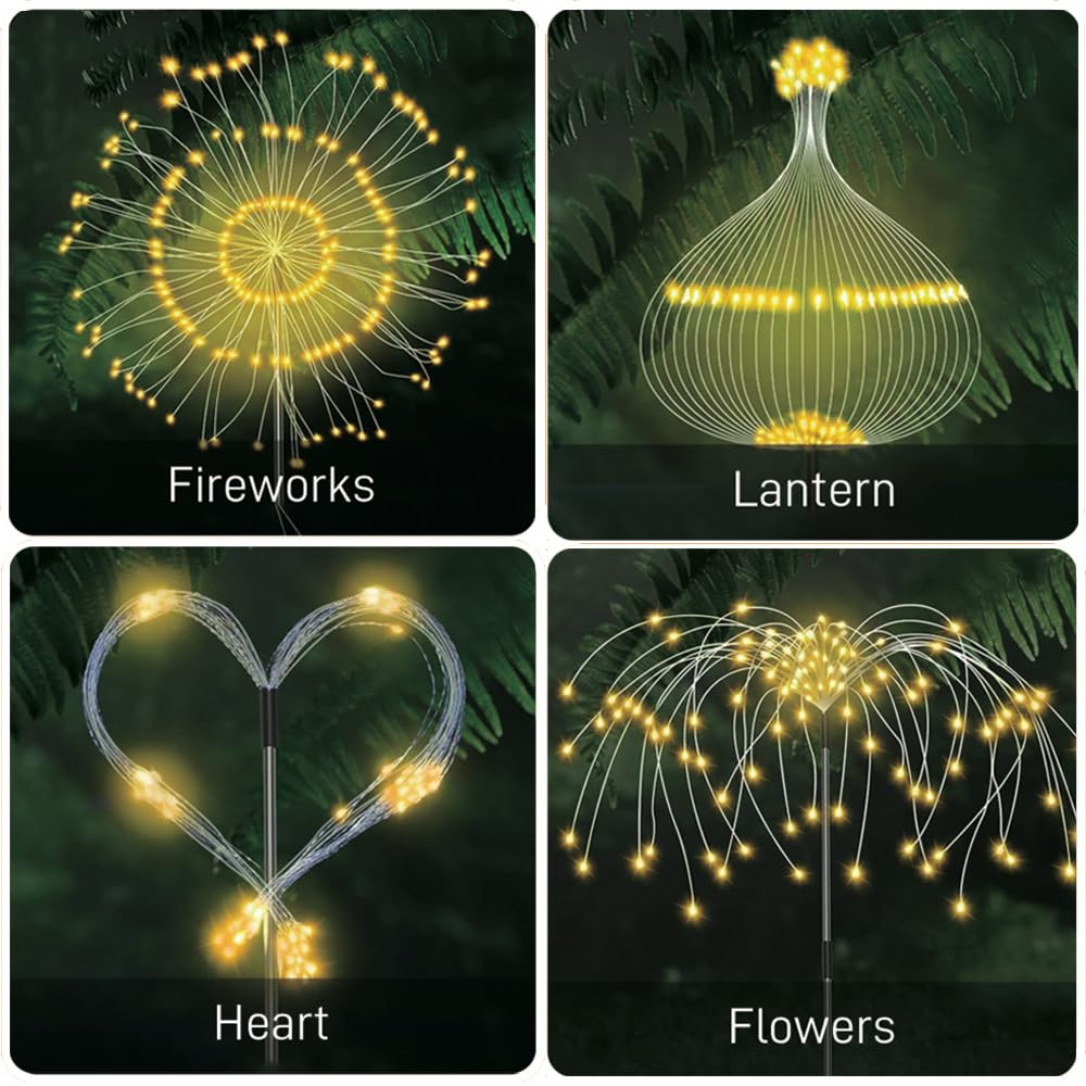 【Solar Firework Lights: 8 Modes, 150 LED Starburst】Each pack contains 2 lights with eight easily operated modes via a button. These solar-powered firework lights feature a dazzling starburst design with 150 energy-efficient LED lights, creating a captivating and radiant display. Decorate your playhouse, balcony, patio, or planters as you like. It is an ideal choice with high quality and durability. 【Effortless Installation & DIY Any Shape】 Simply stake the light into the ground and let the solar panel charge during the day for automatic illumination at night. Made of flexible copper wire and bright LED beads, these lights allow you to DIY any shape you desire. Whether it's a starburst, flower, heart, spiral, or spherical design, the possibilities are endless. These lights are perfect for gardening enthusiasts and make great decorations for various holidays such as Halloween, Christmas, Thanksgiving, and New Year's Day. 【Long Working Hours】Equipped with 150 durable low-heat LED lights and an upgraded solar panel (2V 250mAh), these lights feature a built-in 1.2V/600mAh high-capacity AA battery. They charge for 6-8 hours under standard sunlight during the day and provide 10-12 hours of illumination at night when fully charged. 【Waterproof Solar Lights Outdoor】 These lights are IP65 waterproof, making them suitable for outdoor use and able to withstand any bad weather. They are corrosion-resistant and highly transparent, featuring sturdy aluminum poles and premium waterproof capabilities to ensure they continue to charge normally even after exposure to wind and rain. 【Note】 When you receive the solar lights, please remove the insulation strip from the solar panel. Cover the solar panel with your hand to simulate darkness and check if the lights turn on. If the lights illuminate, place them in a sunny area without any shadows to absorb full direct sunlight. If the lights do not turn on, please reset the battery or allow at least 3 days and nights of charging and discharging for the battery to reach its full capacity. If you have any questions about the solar lights, please contact us and we will resolve the issue as soon as possible.