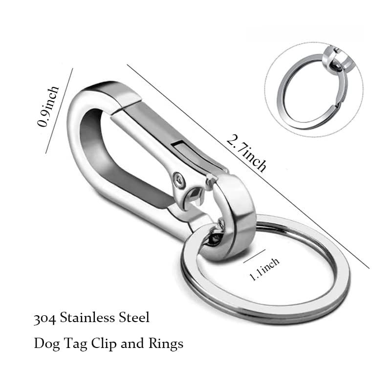Material: 100% stainless steel. Size: Suitable for small to large dogs. Package Included: 2 dog tag clips, come With Split Ring Attachments Many Other Uses: quickly add or remove keys, camera straps, etc. Features: 1: Made of surgical-grade stainless steel (excellent wear and corrosion resistance) 2: Besides premium material, the pet tag clips also have a compact structure, are SUPER secure, and heavy-duty. A Pet tag holder is not only very tight and light but also can bear the attack or crazy movement. 3: Easy to switch dog id tags and attach the collar or harness. 【High Quality】: Both tag clips and split rings are made of 100% stainless steel, sturdy, and rust resistant. Design for long-time use. 【Easy To Use】: Quick clips and easy change pet ID tag holder make it simple to attach your dog's collars or harnesses. 【Super Secure】: Fit small medium to large size dogs. Dog tag clips were tested by dog rolling, running, jumping, or fetching, their ID tag will always remain securely in place. 【Perfect ID Tags & Collar Accessories】: Set of 2 dog tag clips, come With Split Ring Attachment that can work perfectly with many standard thickness tags in any shape. 【Satisfaction Guarantee】: We believe that you will love our highly polished dog clips. We will replace or refund it if it is defective or if you are not satisfied with this dog ID tag clip.