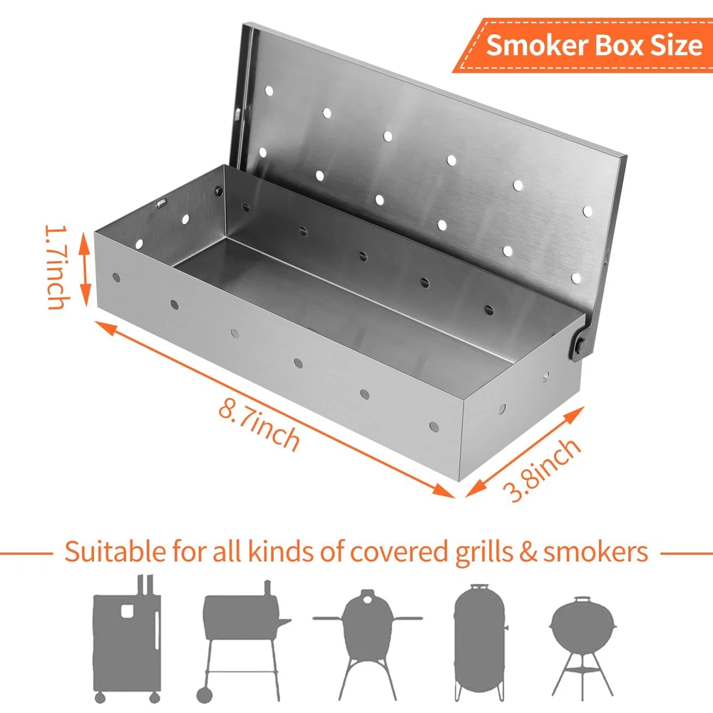 Functional Use: Our smoker box leaves 28 dense circular vents that provide ample smoke to evenly smoke your food and infuse your barbecue with just the right amount of smoky flavor Unique Design: Our smoker box features a unique hinged lid design with a 90-degree opening so you can easily and safely add or remove wood chips High Quality Material: Our smoker box is made of thick stainless steel material to ensure absolute safety when in contact with food. Rustproof and easy to clean. The corners of the smoker box are rounded and will not cut your hands Widely Used: Whether you have a gas grill or a charcoal grill, our smoker box is a perfect fit. Give your meat, seafood, vegetables and other delicious foods a mouthwatering smoky flavor BBQ Accessory: As a practical tool, you can give this smoker box as a nice gift to your friends, neighbors or others, and the recipients will be glad to get it