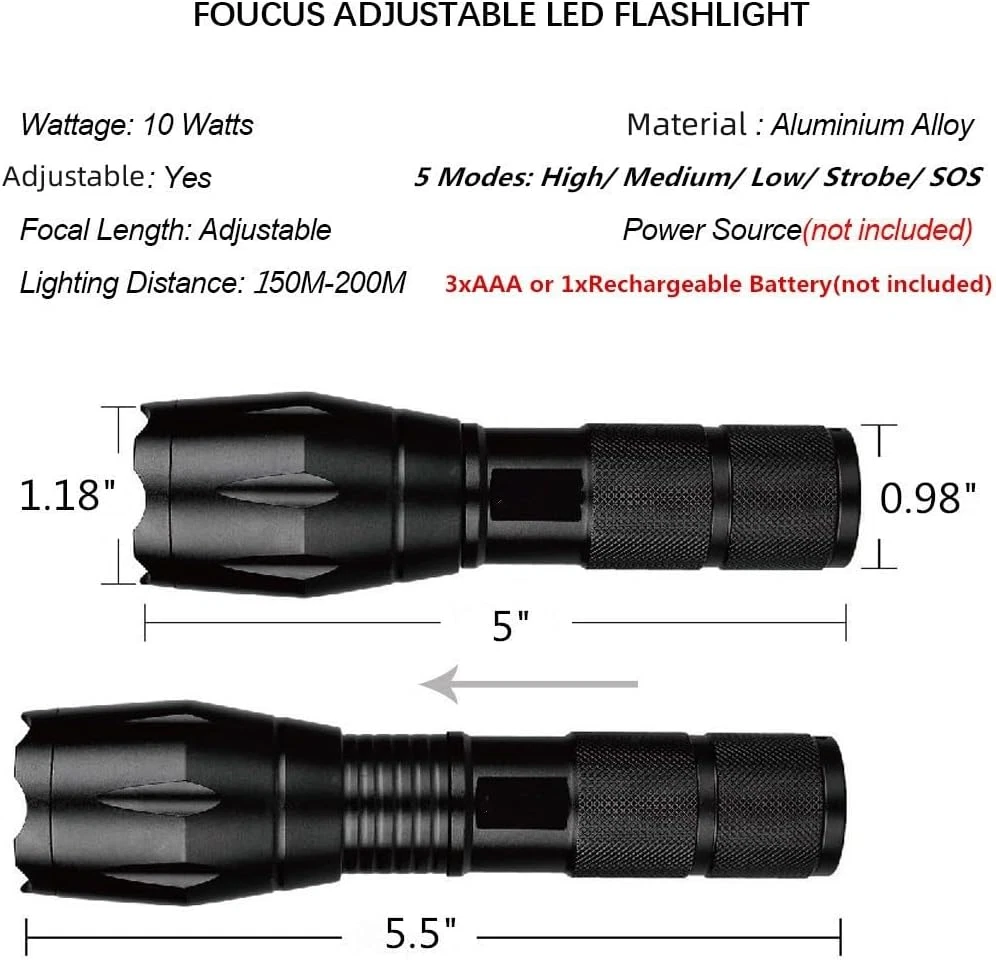 Store New Arrivals Add to Favorite View Feedback Contact 2 Pack Tactical Flashlights Torch, Military Grade 5 Modes 3000 High Lumens Led Waterproof Handheld Flashlight for Camping Biking Hiking Outdoor Home Emergency Description Light Source Type LED Item model number 2 Pack Tactical Flashlight Torch, Warranty Description No. Power Source Battery Powered Battery Cell Composition Lithium Ion Light Path Distance 200 Meters Country of Origin China Batteries Included? No Special Features Long Range Batteries Required? Yes Bulb Shape Size T Product Dimensions 6"D x 4"W x 1.7"H Material Aluminum, Rubber Number of Batteries 3 AAA batteries required. Is Discontinued By Manufacturer No Manufacturer ThuZW Item Package Quantity 1 White Brightness 3000 Lumens Brightness 3000 Lumen Water Resistance Level Waterproof Item Weight 6.5 ounces Battery Description / Special Feature Long Range Description Pile / Bulb Base Wedge Color Black Part Number NAV_LEF_A100_3000_2 Batteries 3 AAA batteries required. Recommended Uses For Product camping, biking, hiking, outdoor, home emergency Included Components 发带 Brand BESTSUN Size Pocket Size Super Bright with 5 Modes - Powerful high Lumen LED generates a brilliant large area floodlight or a perfectly focused spotlight over a beam distance of 656ft/200m. Adjustable focus with 5 modes: (High, Medium, Low, Strobe, SOS/Emergency). Adjustable Focus - Adjustable focus for use in different situations (just rotate the flashlight head to adjust). The LED flashlight allows you to select focus between spot and flood beams. Waterproof & High Quality - The flashlight is waterproof and is made of aluminum alloy and rubber. Durable aluminum alloy crust, abrasion resistance. Widely Used - Easy to carry with you as a backup and is small enough to fit in your pocket, handbag, drawer, or car compartment. Takes 3 standard AAA or a single rechargeable. No Lithium Batteries are included. What You Will Get: 2 x LED Flashlights, 2 x Battery Tubes, 2 x AAA Battery Holders (Batteries are not Included), and 2 x Lanyards (Hand Straps). Features: - Body material: aluminum alloy - Light source: LED bulb - Mode arrangement: high>medium>low>strobe>SOS - Reflector: aluminum reflector - Switch position: on the tail cover - Switch type: push button switch - Needed battery type: 3*AAA battery (Not included) or 1*single rechargeable battery (Not included) - Water-resistant design, small size, and easy to carry - especially suitable for outdoor activities such as camping and hiking. How to change the flashlight mode? There are 5 operating modes: high/medium/low/strobe/SOS. At the first click, the light is on the full brightness- high mode, lightly press down the rear button and release it to change modes, and fully press it to turn off the light. What You Get: 2 x LED flashlights; 2 x Battery Tubes; 2 x AAA Battery Holders (Batteries are Not included); 2 x Lanyards (Hand Straps) Description of the Issue - can desribe the product exactly ABOUT US We offer the best prices around on high quality products. Our E-store includes media such as books, movies, music and games while offering electronics, toys, sporting apparel, clothing, tools, general home, garden items and more. SHIPPING We are always working hard to ensure your package arrives as soon as possible. Please understand that some factors like weather, high postal traffic, and the performance of shipping companies are outside of our control. We offer free shipping to the lower 48 states and ship within 2 business days of payment, usually sooner. We do not accept P.O. Boxes. Please provide a physical address. RETURNS We offer a 30-Day Return Policy on items which you are not completely satisfied with. You have the option for a full-refund or an exchange of the item. No returns are available on items shipped outside of the USA. PAYMENT We accept PayPal. CONTACT US This page content is yet to come Please ad us to your favorite seller and visit again later Thank You CUSTOMER SATISFACTION We try our very best to make sure every customer is completely satisfied. If there's a problem, message us! We're happy to help.