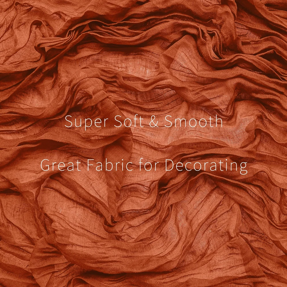---Super Soft Touch--- 1. Made of high-quality cotton gauze,with wrinkled 2. Our cotton gauze tablecloth has reduced the linear density of the fabric to get higher light transmittance than other fabrics,with a sewn finish edges, not easy to loose thread ---Rustic Boho Farmhouse Style--- 1. Soft material with wrinkle can bring a casual style and add a pure and elegant style to wedding 2. Fits in Boho farmhouse wedding or theme party, beach ceremony, Valentine's Day , birthday party, Thanksgiving, bridal shower and baby shower ---Care Instructions--- 1. You can choose machine wash or hand washing. Do not dry clean and do not bleach 2. The fabric is delicate and can be prone to tearing. Please be careful to use! --- Product Detail --- 1. Dimensions: 35inch×120inch 2. Colors: Terracotta 3. Package Includes : 2 Pieces Cheese Table Runners 🎀Extra Long Table Runners: Package includes 2 pieces terracotta table runners with wrinkled texture , 35” width and 120” length, each 10 feet long enough to fit most occasions decorations. 🎀Premium Material: Our cheesecloth table runners are made of 100% natural cotton gauze and the fabric is soft and as light as a butterfly wing. 🎀Stylish Table Decor: Give your tables a rustic and gorgeous look with our cheese cloth table runner. Display romantic atmosphere by adding flowers, plants, candles to create enjoyable dining table vibes. 🎀Wide Applications: These versatile high quality table runners brighten up table and add vintage style for home and wedding decor, such as wedding backdrops and reception, arches drapery, baby and bridal shower, centerpiece, Thanksgiving, fall, family gathering and so on. 🎀Care Instructions: Hand wash or machine wash. Edges are designed with a sewn finish, not easily loose thread and no shrinkage after washing. Do not dry clean and do not bleach.