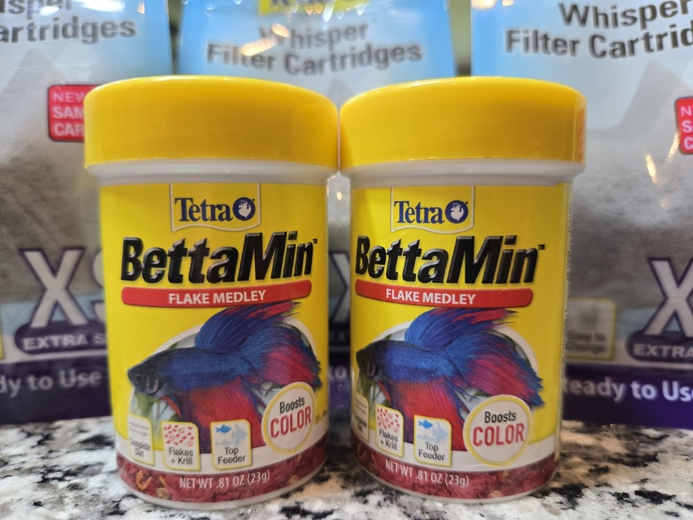 The product is a set of 2 Tetra BettaMin Flake Medley Betta Fish Flakes with an expiration date of 05/2027. These flakes are specifically designed for Betta fish and are suitable for regular feeding. Additionally, the set includes 3 Whisper Filter Cartridges for maintaining water quality in the aquarium. With the Tétra brand known for quality pet supplies, this product offers a reliable and long-lasting solution for caring for your Betta fish.
