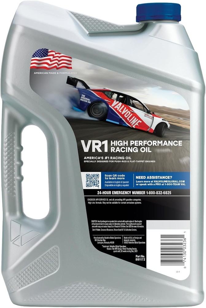 Valvoline VR1 Racing SAE 20W-50 Motor Oil 5 QT AMERICA’S RACING OIL is recommended for high-performance gasoline engines as well as those burning full or partial alcohol fuels SPECIAL FRICTION MODIFIERS help minimize friction, keeping heat at bay for maximum power and torque at high RPMs. 2X MORE ZINC FOR EXTREME WEAR PROTECTION for even greater film strength and anti-wear protection on critical engine components such as pistons, cams and bearings ENHANCED ANTI-FOAM AGENTS SAFEGUARD CRITICAL PARTS in high speeds and extreme conditions PHOSPHORUS FORMULA is engineered specifically for modern and classic high-performance engines both on and off the track, which includes flat-tappet and performance cam motors. AMERICAN MADE & FORMULATED to maximize your engine’s life and improve it’s performance Shipping We offer FREE shipping on all orders! We ship within Three business days of payment, usually sooner. We use a selection of shipping services such as UPS, FedEx, USPS etc. We only ship to the lower 48 states, no APO/FPO addresses or PO Boxes allowed. Local pickups and combined shipping options are not provided at this time. Return You can return a product for up to 30 days from the date you purchased it. Any product you return must be in the same condition you received it and in the original packaging. Please keep the receipt. Payment We accept payment by any of the following methods: PayPal Please pay as soon as possible after winning an auction, as that will allow us to post your item to you sooner! Feedback Customer satisfaction is very important to us. If you have any problem with your order, please contact us and we will do our best to make you satisfied. Contact Us If you have any queries, please contact us via ebay. We usually respond within 24 hours on weekdays. Please visit our eBay store to check out other items for sale! Thank you for shopping at our store.