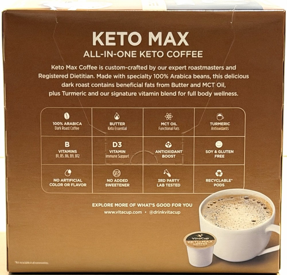 All keto ingredients mixed in, skip the measuring. Sustained energy and focus from one morning cup. Creamy, satisfying taste keeps you full longer. ALL IN ONE KETO: Don’t waste time and money buying individual ingredients to make your keto coffee. KetoMax takes the work out of it for you with butter + coconut MCT oil + vitamins, in a ready to drink formula. DARK ROAST COFFEE: Sip on premium 100% Arabica beans from Chiapas, Mexico for a super clean energy boost. We put in the hard work so your coffee can work hard for you. DIETITIAN FORMULATED: Each VitaCup blend is dietitian-formulated and packed with the nutrients your body needs to function at its best. KetoMax is made with functional ingredients and is free from gluten & soy! DAILY DOSE OF VITAMINS: Each cup of coffee contains an essential blend of vitamins and nutrients, allowing you to simplify your morning routine with one less step. KetoMax contains vitamins B1, B5, B6, B9, B12 & D3.