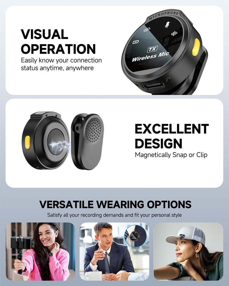 Plug and Play: No Bluetooth or APP needed. The wireless lavalier microphone can be clipped to the collar for hands-free audio and video recording. Just need to plug the receiver into your device, and power on the microphone, it will start working for you soon Design for Professional: The J6 microphone boasts a 48kHz/24bit audio format for accurate sound capture. With a 60dB signal-to-noise ratio, it delivers excellent audio with minimal background noise. Plus, it can handle up to 95dB Sound Pressure Level, perfect for recording high-pitched sounds. Visual dials have been designed to provide clear insight into the microphone's usage status, including connection, noise reduction function, mute, battery usage, and more 165FT Wireless Transmission & Rechargeable: This lavalier microphone boasts a consistent audio signal, capable of reaching a remarkable wireless transmission distance of up to 165 feet. Equipped with a high-quality DSP chip, it ensures even more stable transmission. The wireless microphone transmitter features a built-in rechargeable battery, offering up to 6 hours of operation on a single charge, or an impressive 42 hours with the charging case Omnidirectional Mic with Noise Reduction: Supports one-click on the yellow button to turn on/off the noise cancellation on TX and RX. The built-in intelligent active noise Cancellation chip and advanced 2.4GHz transmission technology, which allows you to record clearly in noisy environments, which can provides more vivid, soft, natural and stereo sound around for recording or real time video Compatible with Most Devices: Compatible with iPhone, iPad, PC, Android, Camera etc. Work with IOS 6.0 system or above (with Lightning), Android 3.0 system or above, can be use with iPhone, Android etc. The handheld mic is suitable for interviewing, online conferencing, podcasting, vlogging, live streaming What You Get: 2*TX (2 Transmitters) + 1*RX(1 Receiver ) +2*Adapter+2*Windscreen+ Charging Case + 2*Charging cable + Instruction. Our worry-free 18-month warranty, and friendly customer service
