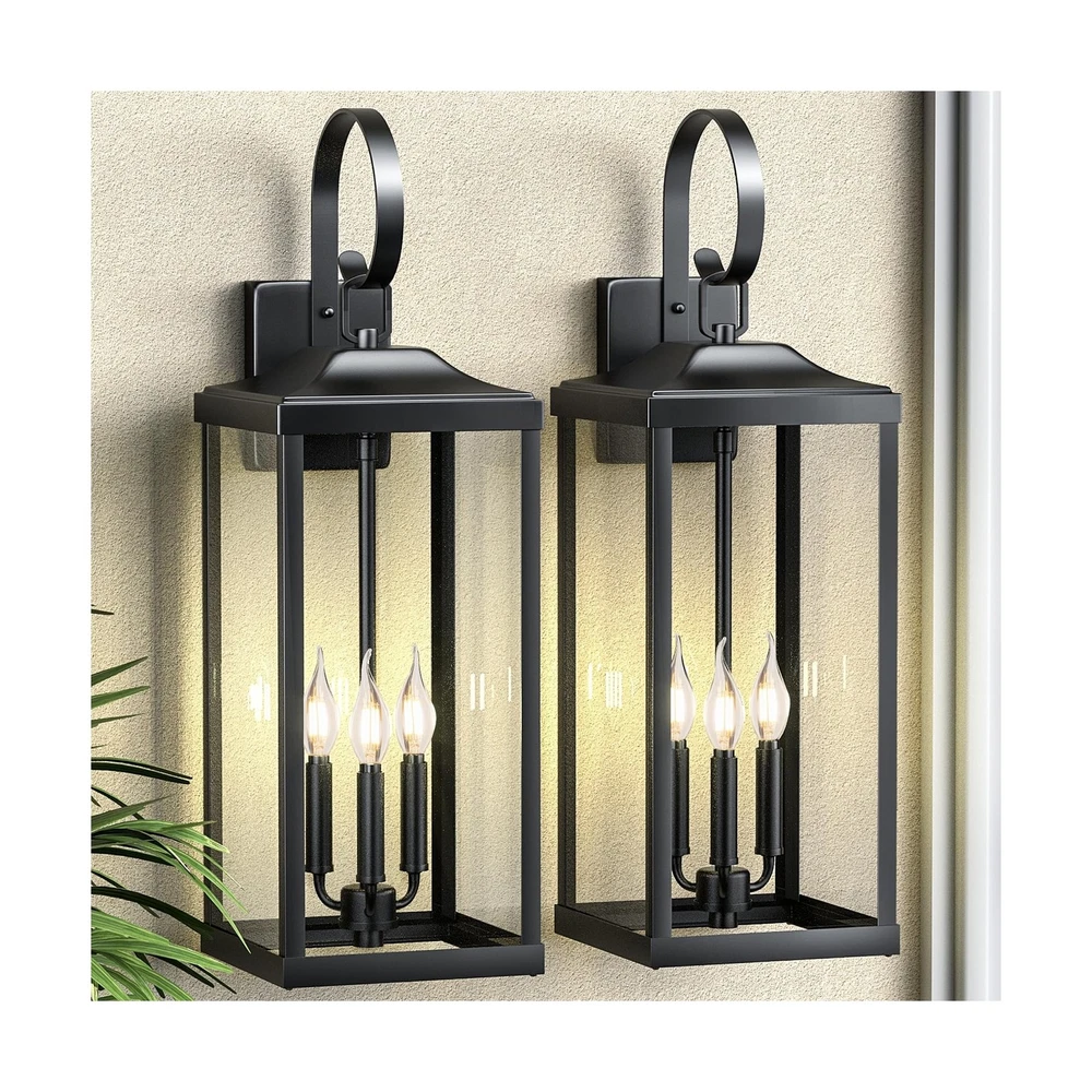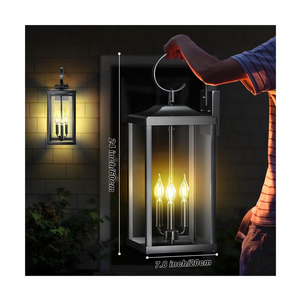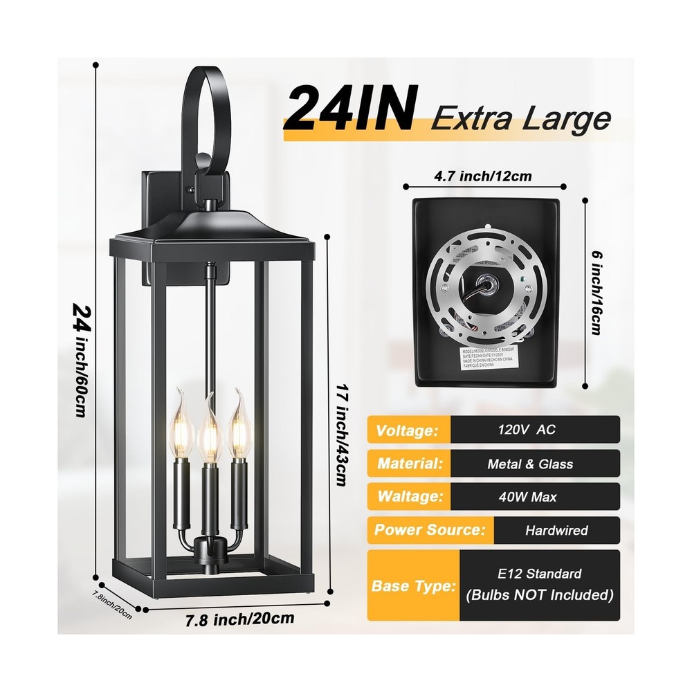2 Packs 24" Extra Large Outside Wall Light Fixture 3-Light, Black Outdoor Porch Lantern Wall Mounted, Waterproof Modern Outside Wall Sconce Coach Lamp for House, E12 Description Features: Extra Large 24" Outdoor Light for Maximum ImpactThe 2-pack porch mount light fixture is about 24"*17"*7.8" inch. Its oversized design makes a bold statement while providing ample lighting for front doors, gardens, and carriage houses. The sleek black finish and modern silhouette complement both farmhouse and contemporary styles, enhancing your home's curb appeal with elegance and functionality. Choose this as your superior porch sconce, garage lantern, or patio lamp! 3-Light Design for Twice the BrightnessEquipped with three E12 bulb sockets, these large outside light for houses deliver double the brightness compared to standard light fixtures. The clear glass panels allow for maximum light output, creating a warm and inviting ambiance for your colonial, entryway, or yard. Whether used for security or aesthetics, these metal exterior lanterns ensure your home stays well-lit and welcoming. (Bulbs not included.) Weather-Resistant Build for Year-Round DurabilityDesigned to withstand the elements, these black outdoor lamps feature a heavy-duty metal frame and thickened glass panels that resist rust, corrosion, and wear. Whether it's heavy rain, snow, or extreme heat, these waterproof sconce lights maintain their beauty and performance, making it a reliable lighting choice for any climate. Timeless Classic Design for Any SpaceWith its elegant black finish, clear glass, and minimalist frame, these modern farmhouse wall lights set of 2blend seamlessly with various decor styles. Whether installed by the balcony, garden, or driveway, these exterior wall sconces enhance both traditional and contemporary homes, providing a stylish yet functional lighting solution. Upgrade your outside house with Yolsunes large 24-inch exterior wall lanterns. Easy Installation & Dedicated After-Sales SupportThe open-bottom design allows for effortless bulb changes and cleaning, while the included mounting hardware ensures a quick and hassle-free installation. If you have any questions or concerns, our 24-hour customer support team is here to assist, guaranteeing a smooth and worry-free experience with your new outdoor lighting. PS: If you prefer smaller sizes, we also have 16" and 19". Welcome to shop our store. Product Details: Brand: Yolsunes Color: Black (No sensor) Material: Glass, Metal Style: Black (No sensor) Light fixture form: Wall Room Type: Outdoor Specific Uses For Product: Balcony, Driveway, Home, Patio, Walkway Indoor Outdoor Usage: Outdoor Power Source: AC Other Special Features of the Product: 24IN Extra Large, 3-Light Ample Brightness, Anti-Rust, Hardwired, Waterproof Control Method: Touch Light Source: LED Number of Light Sources: 3 Voltage: 110 Volts (AC) Light Color: warm white Lighting Method: LED Wattage: 40 watts Bulb Base: E12 Switch Type: Touch Water Resistance Level: Waterproof Efficiency: efficient Mounting Type: Wall Mount Fixture Type: Non Removable Installation Type: Wall Mount Warranty Type: Limited Specification Met: ETL, UL Required Assembly: Yes Color: Black (No sensor) Style Name: Black (No sensor) Light Fixture Form: Wall Shade Color: clear Material Type: Glass, Metal Finish Types: Polished Shade Material: Glass Item Dimensions L x W x H: 7.88"L x 8.75"W x 23.88"H Item Weight: 8.75 Kilograms Number of Items: 2 Unit Count: 2.0 Count Brand Name: Yolsunes Included Components: Instruction Manual, Mounting Hardware, Shade Model Number: e46da73e-26bb-41f8-ac1b-e3ea9268deb2 Manufacturer Warranty Description: 2 year manufacturer. Delivery We Do Not Ship Outside of the Continental US. Return Policy All items qualify for returns within 30 days of receipt. Seller is responsible for return shipping on any item that is not damaged. Feedback We take our reputation seriously, we buy and sell online, so we understand the value of trust. If you are unsatisfied with your order, please contact us and we will work with you to resolve it to your satisfaction.