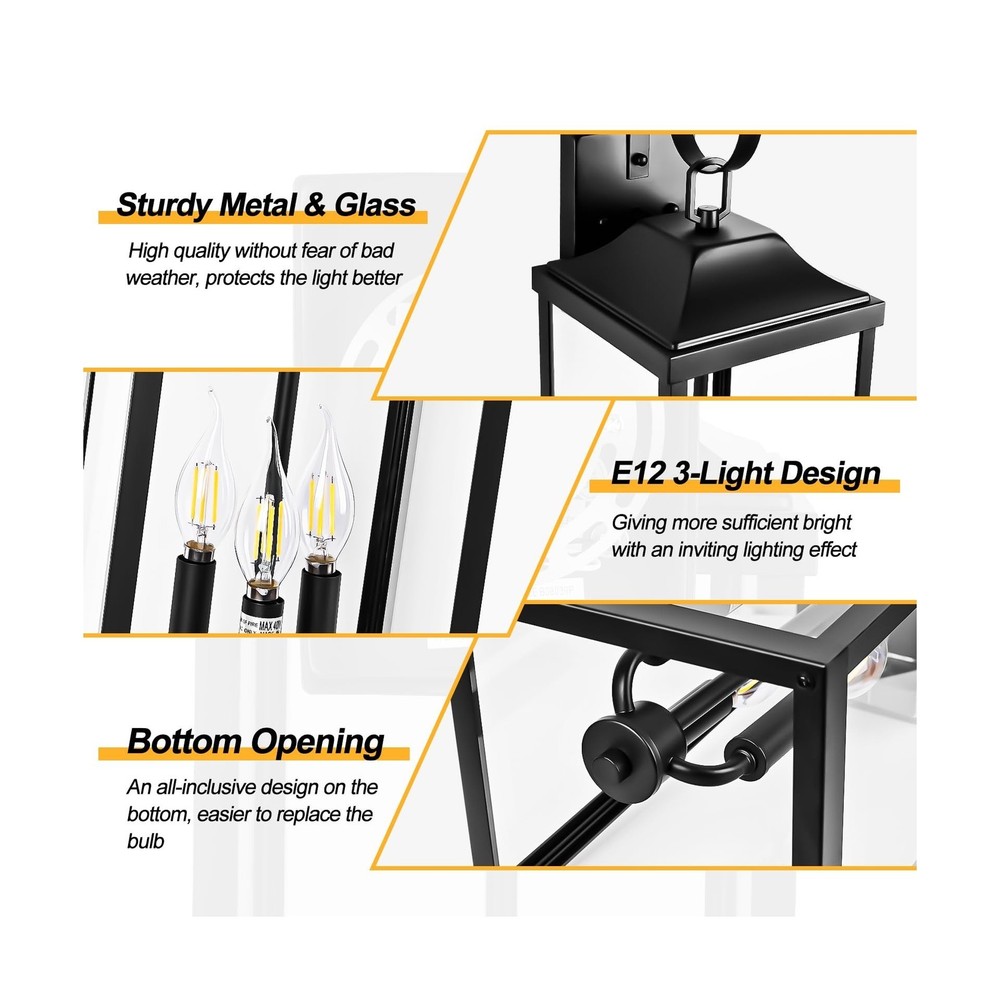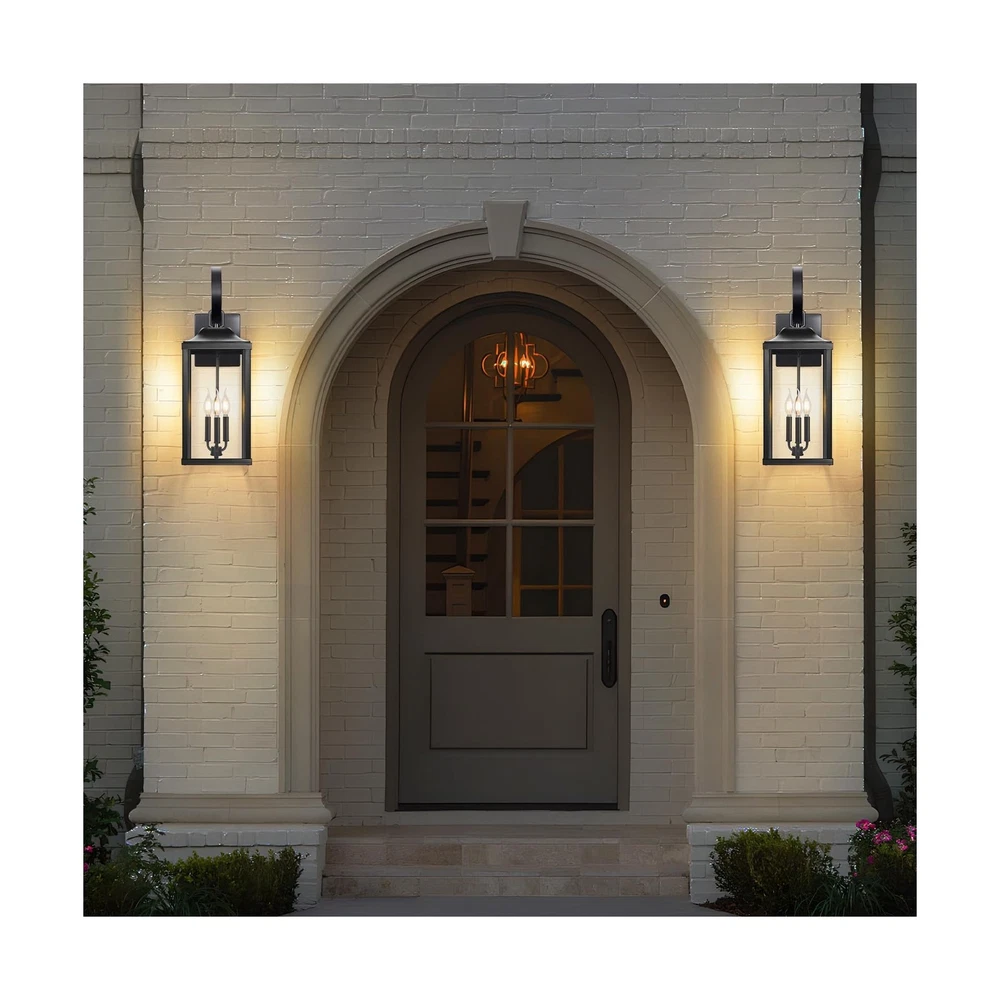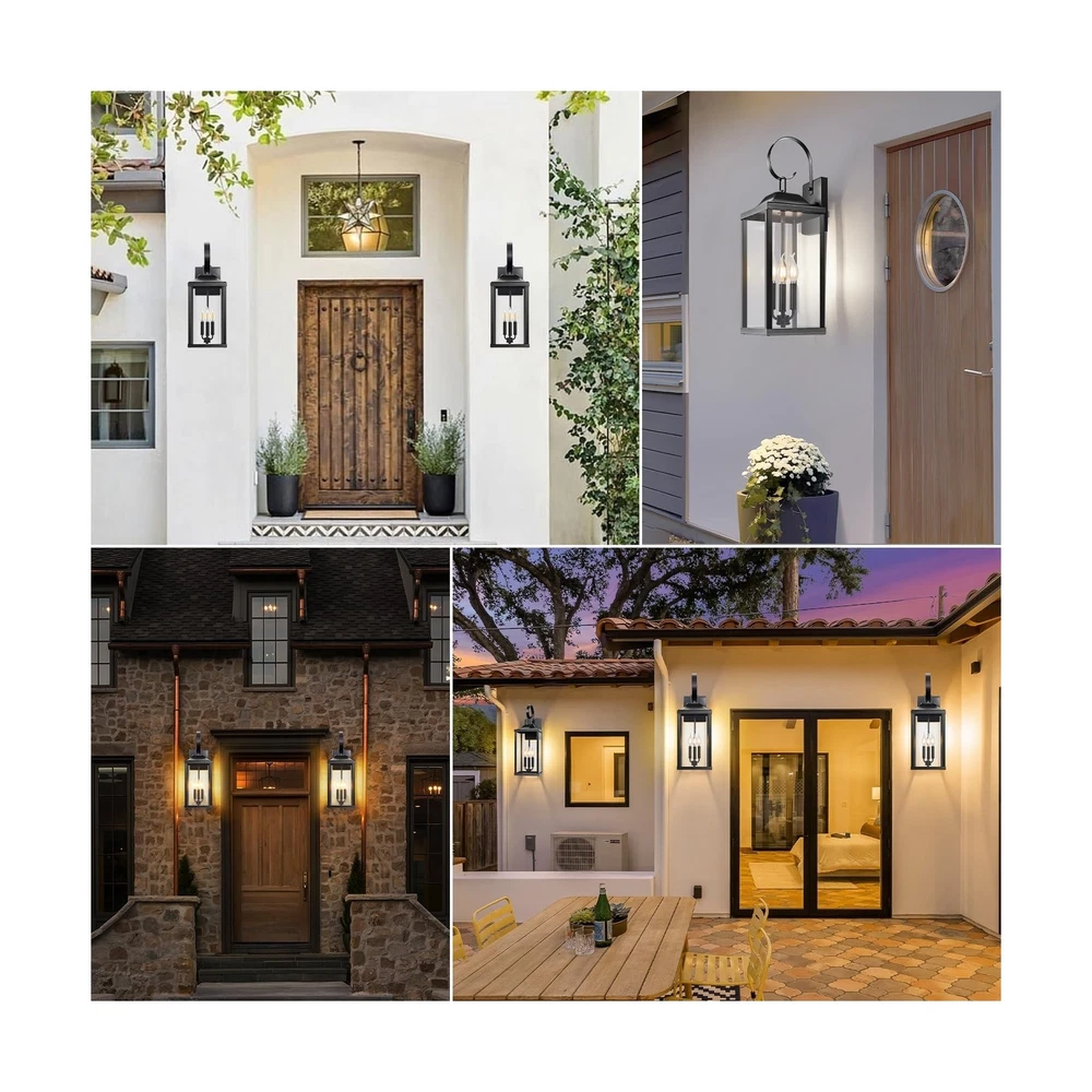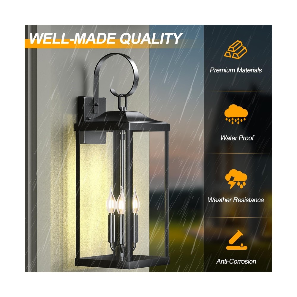 2 Packs 24" Extra Large Outside Wall Light Fixture 3-Light, Black Outdoor Porch Lantern Wall Mounted, Waterproof Modern Outside Wall Sconce Coach Lamp for House, E12 Description Features: Extra Large 24" Outdoor Light for Maximum ImpactThe 2-pack porch mount light fixture is about 24"*17"*7.8" inch. Its oversized design makes a bold statement while providing ample lighting for front doors, gardens, and carriage houses. The sleek black finish and modern silhouette complement both farmhouse and contemporary styles, enhancing your home's curb appeal with elegance and functionality. Choose this as your superior porch sconce, garage lantern, or patio lamp! 3-Light Design for Twice the BrightnessEquipped with three E12 bulb sockets, these large outside light for houses deliver double the brightness compared to standard light fixtures. The clear glass panels allow for maximum light output, creating a warm and inviting ambiance for your colonial, entryway, or yard. Whether used for security or aesthetics, these metal exterior lanterns ensure your home stays well-lit and welcoming. (Bulbs not included.) Weather-Resistant Build for Year-Round DurabilityDesigned to withstand the elements, these black outdoor lamps feature a heavy-duty metal frame and thickened glass panels that resist rust, corrosion, and wear. Whether it's heavy rain, snow, or extreme heat, these waterproof sconce lights maintain their beauty and performance, making it a reliable lighting choice for any climate. Timeless Classic Design for Any SpaceWith its elegant black finish, clear glass, and minimalist frame, these modern farmhouse wall lights set of 2blend seamlessly with various decor styles. Whether installed by the balcony, garden, or driveway, these exterior wall sconces enhance both traditional and contemporary homes, providing a stylish yet functional lighting solution. Upgrade your outside house with Yolsunes large 24-inch exterior wall lanterns. Easy Installation & Dedicated After-Sales SupportThe open-bottom design allows for effortless bulb changes and cleaning, while the included mounting hardware ensures a quick and hassle-free installation. If you have any questions or concerns, our 24-hour customer support team is here to assist, guaranteeing a smooth and worry-free experience with your new outdoor lighting. PS: If you prefer smaller sizes, we also have 16" and 19". Welcome to shop our store. Product Details: Brand: Yolsunes Color: Black (No sensor) Material: Glass, Metal Style: Black (No sensor) Light fixture form: Wall Room Type: Outdoor Specific Uses For Product: Balcony, Driveway, Home, Patio, Walkway Indoor Outdoor Usage: Outdoor Power Source: AC Other Special Features of the Product: 24IN Extra Large, 3-Light Ample Brightness, Anti-Rust, Hardwired, Waterproof Control Method: Touch Light Source: LED Number of Light Sources: 3 Voltage: 110 Volts (AC) Light Color: warm white Lighting Method: LED Wattage: 40 watts Bulb Base: E12 Switch Type: Touch Water Resistance Level: Waterproof Efficiency: efficient Mounting Type: Wall Mount Fixture Type: Non Removable Installation Type: Wall Mount Warranty Type: Limited Specification Met: ETL, UL Required Assembly: Yes Color: Black (No sensor) Style Name: Black (No sensor) Light Fixture Form: Wall Shade Color: clear Material Type: Glass, Metal Finish Types: Polished Shade Material: Glass Item Dimensions L x W x H: 7.88"L x 8.75"W x 23.88"H Item Weight: 8.75 Kilograms Number of Items: 2 Unit Count: 2.0 Count Brand Name: Yolsunes Included Components: Instruction Manual, Mounting Hardware, Shade Model Number: e46da73e-26bb-41f8-ac1b-e3ea9268deb2 Manufacturer Warranty Description: 2 year manufacturer. Delivery We Do Not Ship Outside of the Continental US. Return Policy All items qualify for returns within 30 days of receipt. Seller is responsible for return shipping on any item that is not damaged. Feedback We take our reputation seriously, we buy and sell online, so we understand the value of trust. If you are unsatisfied with your order, please contact us and we will work with you to resolve it to your satisfaction.
