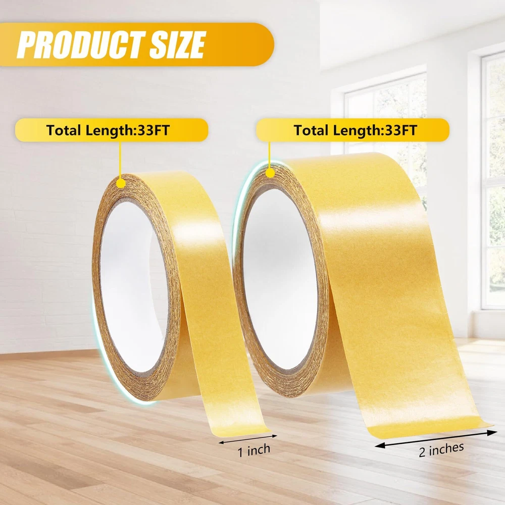 [Superior Quality]: Our fiberglass grip tape is made of a high-quality fiberglass weave that is uniquely lightweight and less dense than other tapes, enhancing both adhesion and flexibility [Versatile Application]: Our double sided duck tape sticks firmly to various surfaces like carpets, refrigerators, picture frames, and home accessories. Very suitable for use on different surfaces such as hardwood, tile, plastic, and concrete. Additionally, it's ideal for adjusting women's garments and securely attaching clothes to the skin or underwear [Easy to Use]: The universal double sided tape is designed for easy application, allowing for fast and efficient bonding without the mess of traditional adhesives. It can be easily cut to the desired length with scissors [Professional Grade]: Professionally trusted, our fiberglass double sided mesh tape is engineered for strength and reliability. This fabric heavy duty tape is the preferred solution for contractors, builders, and DIY enthusiasts alike [Package Includes]: You'll get 2 rolls of double sided fiberglass tape set (1 inch * 33 ft + 2 inch * 33 ft). This enables you to securely attach items without harming walls or surfaces, making it suitable for both home and office applications