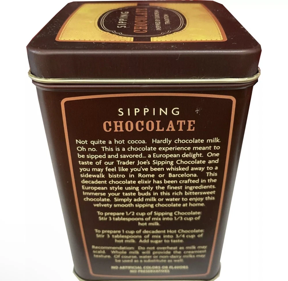 Trader Joe's Sipping Chocolate was inspired by memories of relaxing in an outdoor European café, sipping velvety-smooth warm chocolate from a demitasse. It was created with sipping in mind (in case you were wondering). The chocolate flavors are so deep and rich that it really does invite you to savor every drop. You can make it with water or milk. We think whole milk is best for the creamiest texture and greatest chocolate depths. It’s the holidays, so indulge a little! Trader Joe’s Sipping Chocolate contains just four, simple ingredients: sugar, cocoa, natural flavor, and a bit of salt. Simple, yet decadent. Flavorful, yet refined. This is grown-up hot chocolate. Indulge in a cup any time, or enjoy with a croissant or pastry. Share a cup or gift the tin as an expression of friendship and fondness—it’s really lovely, really rich, wondrous chocolate. You are purchasing two containers Fast free shipping Seasonal item stock up