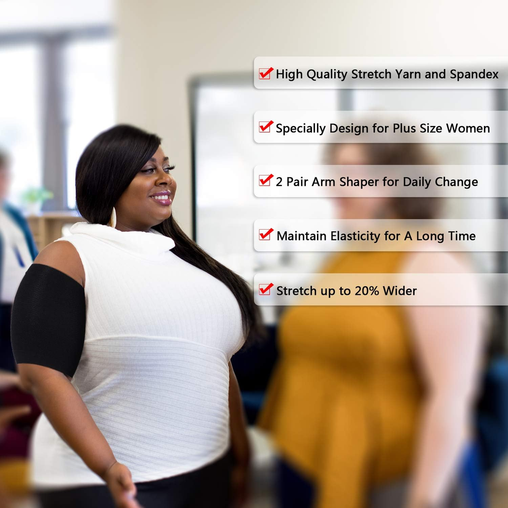Nylon Plus size arm shaper for women: the arm shapers are in plus size, designed to help fight the jiggle; Compare to other regular arm shapers, our arm sleeves can stretch up to 20% wider, larger and more comfortable to use (suitable for arm circumference 7 - 16 inches) What you will get: you will receive 1 pair of beige arm compression sleeves, 1 pair of black arm compression sleeves and 1 pair of black calf compression sleeves; Each arm compression sleeve measures 21.5 cm/ 8.5 inch in length; Each calf compression sleeve measures 16.5 cm/ 6.5 inch in length Say goodbye to flabby arms: these slimming arm wraps are designed for people with saggy arms, you can easily shape your arms over time by compressing arms while fighting the jiggle away; No saggy arms any more after wearing these upper arm compression sleeves Quality calf and arms shapers: these plus size arm wrap and calf compression sleeve are made with the quality nylon and spandex materials that can grip your arm and calf, helping burn calories and shaping them Wear them at any occasion: whether you are at home, at work, attending a party or anywhere else, you can use the arm shaper sleeves and calf shapers because you can wear them underneath clothing; The plus size arm shapers help to give you a slimmer appearance you desire