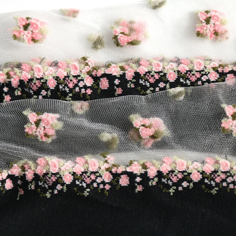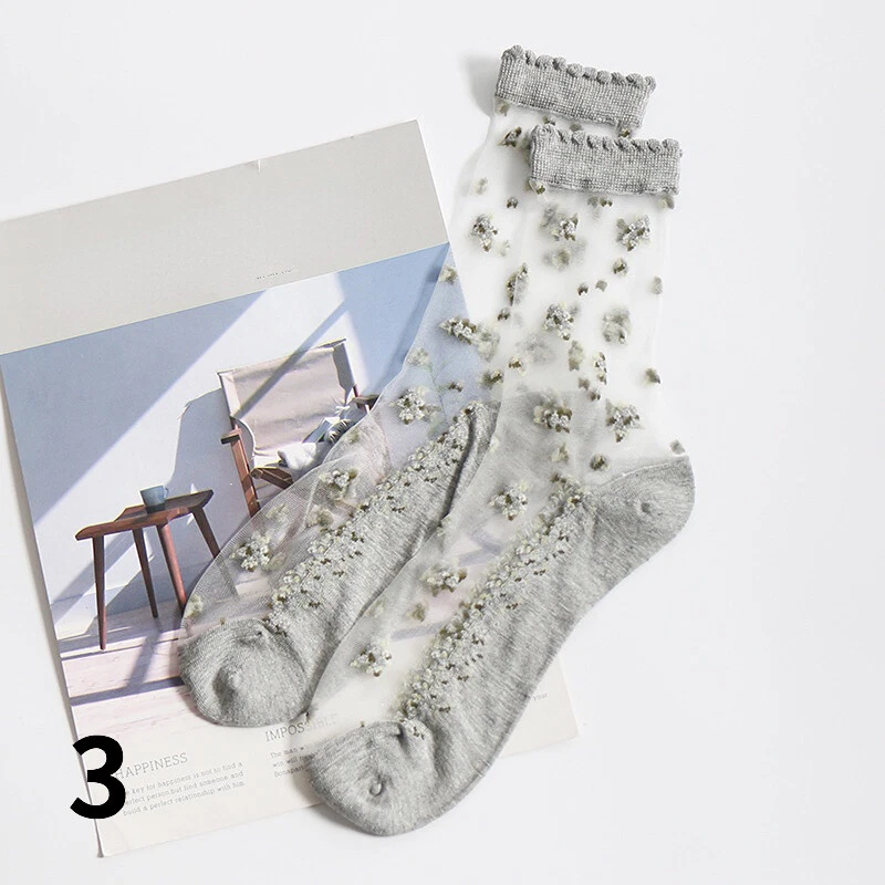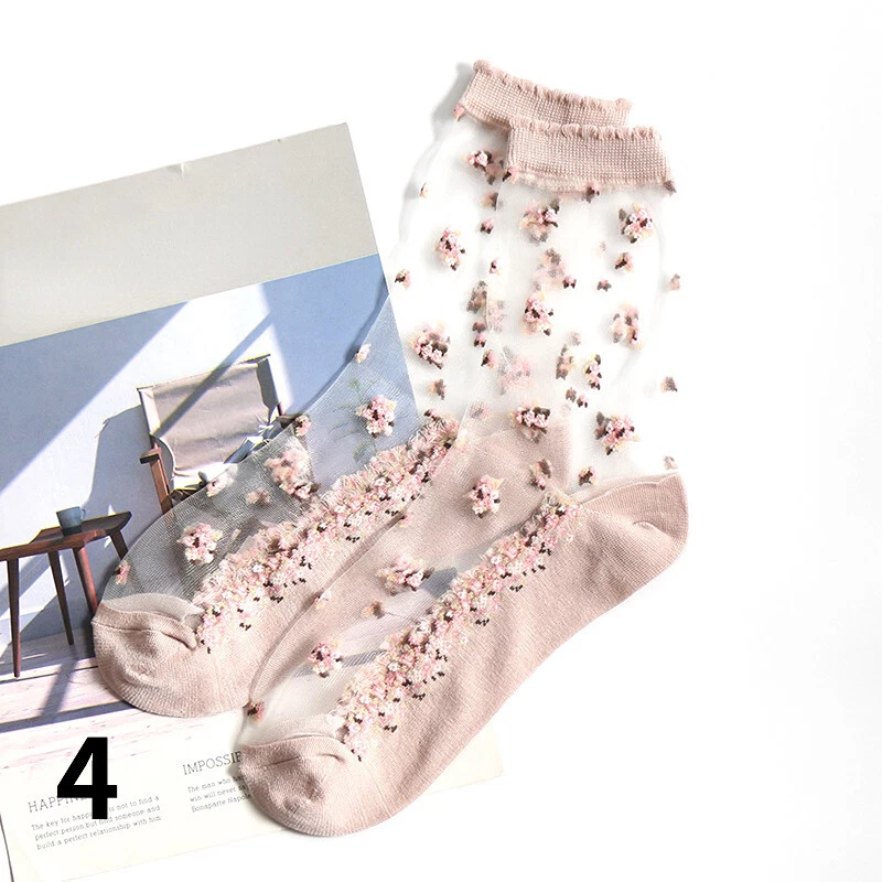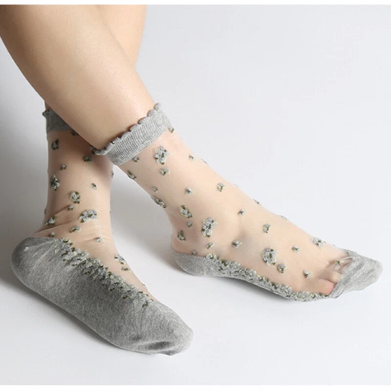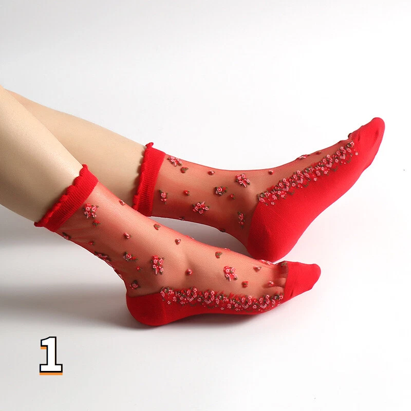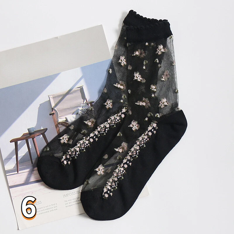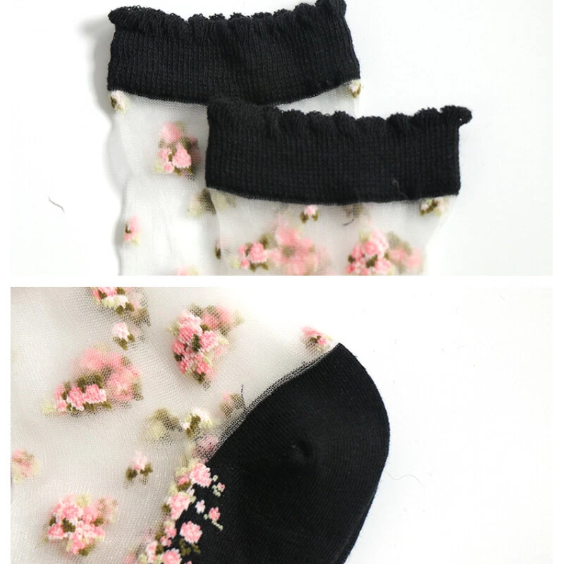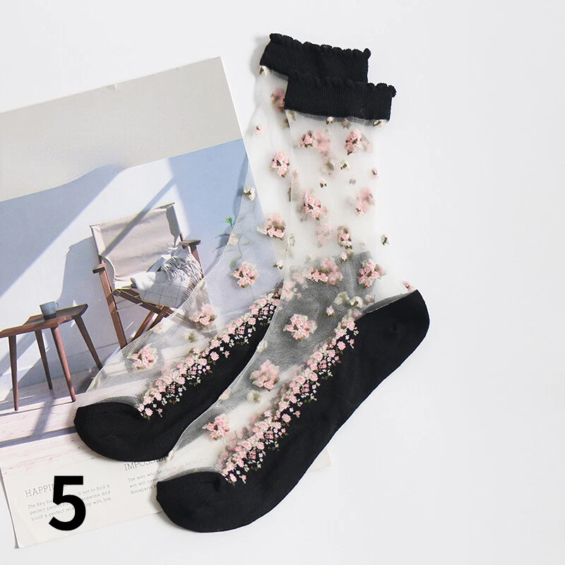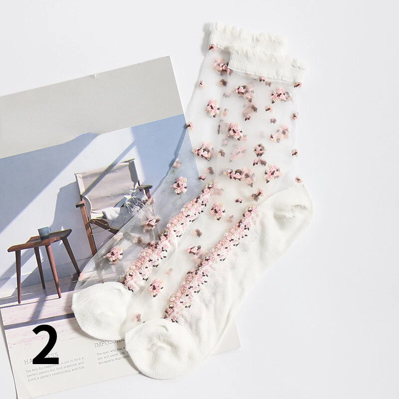 2 Pairs Ladies Sheer Ankle Crew Socks Lace Transparent Mesh Embroidery Floral