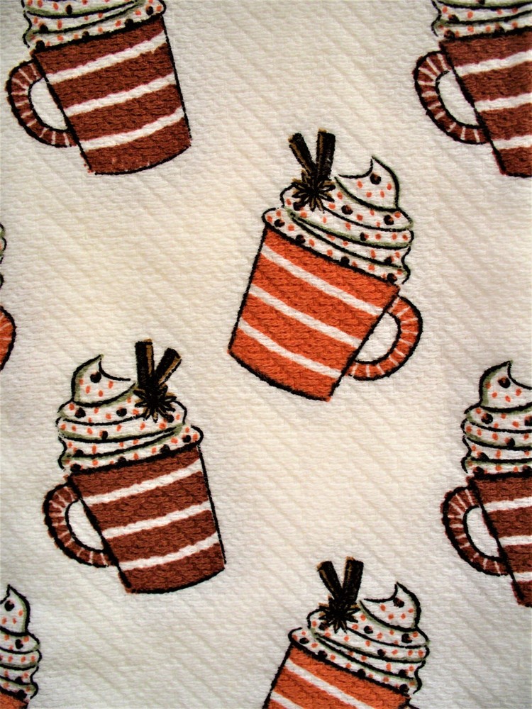 Set of 2 soft absorbent kitchen dish towels with a coffee latte mugs pumpkin spice cinnamon or hot chocolate design. Dominant colors are white, brown and orange. Set contains two (2) identical towels. Each towel measures 18" x 28" 100% Cotton Terry