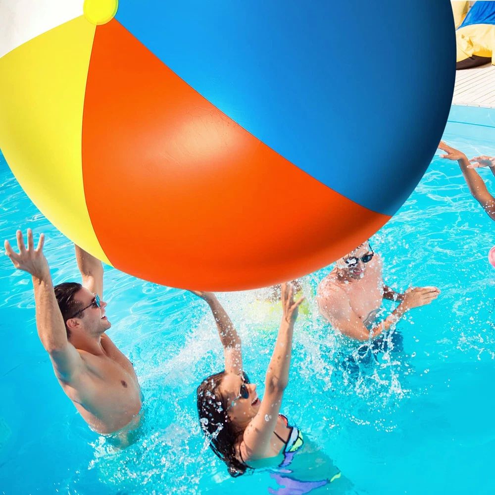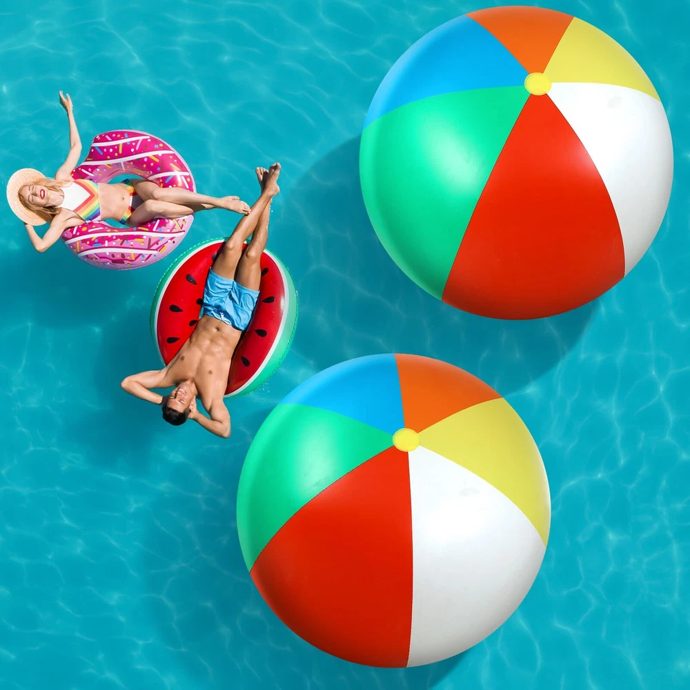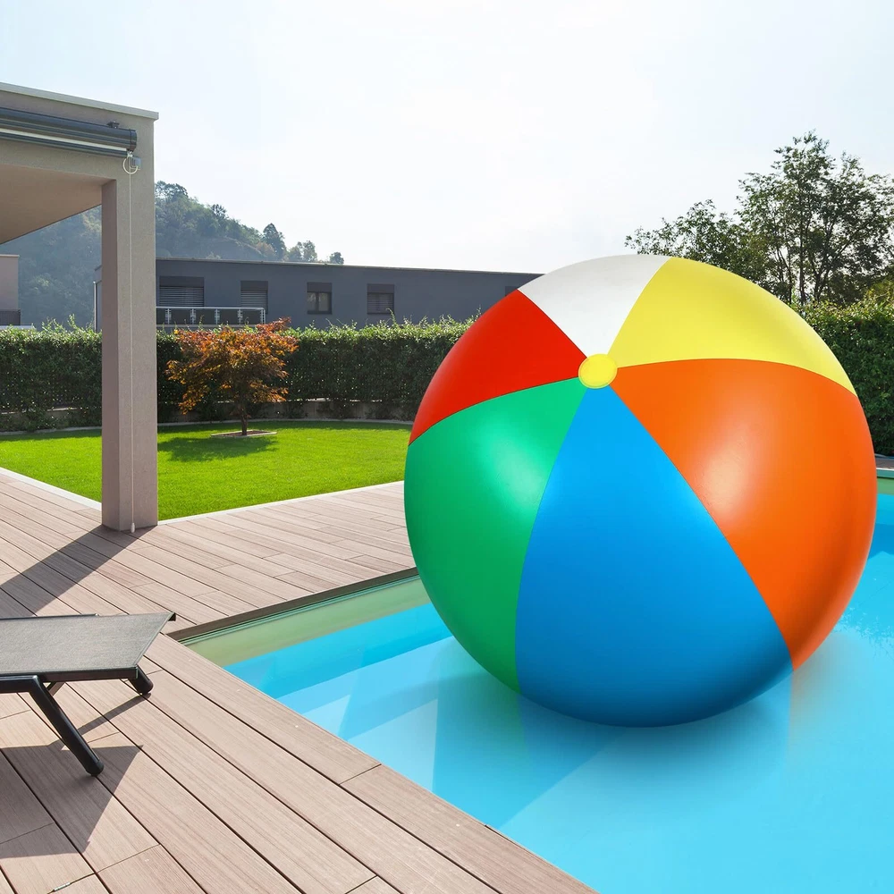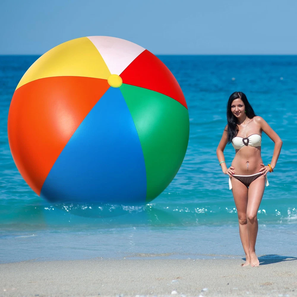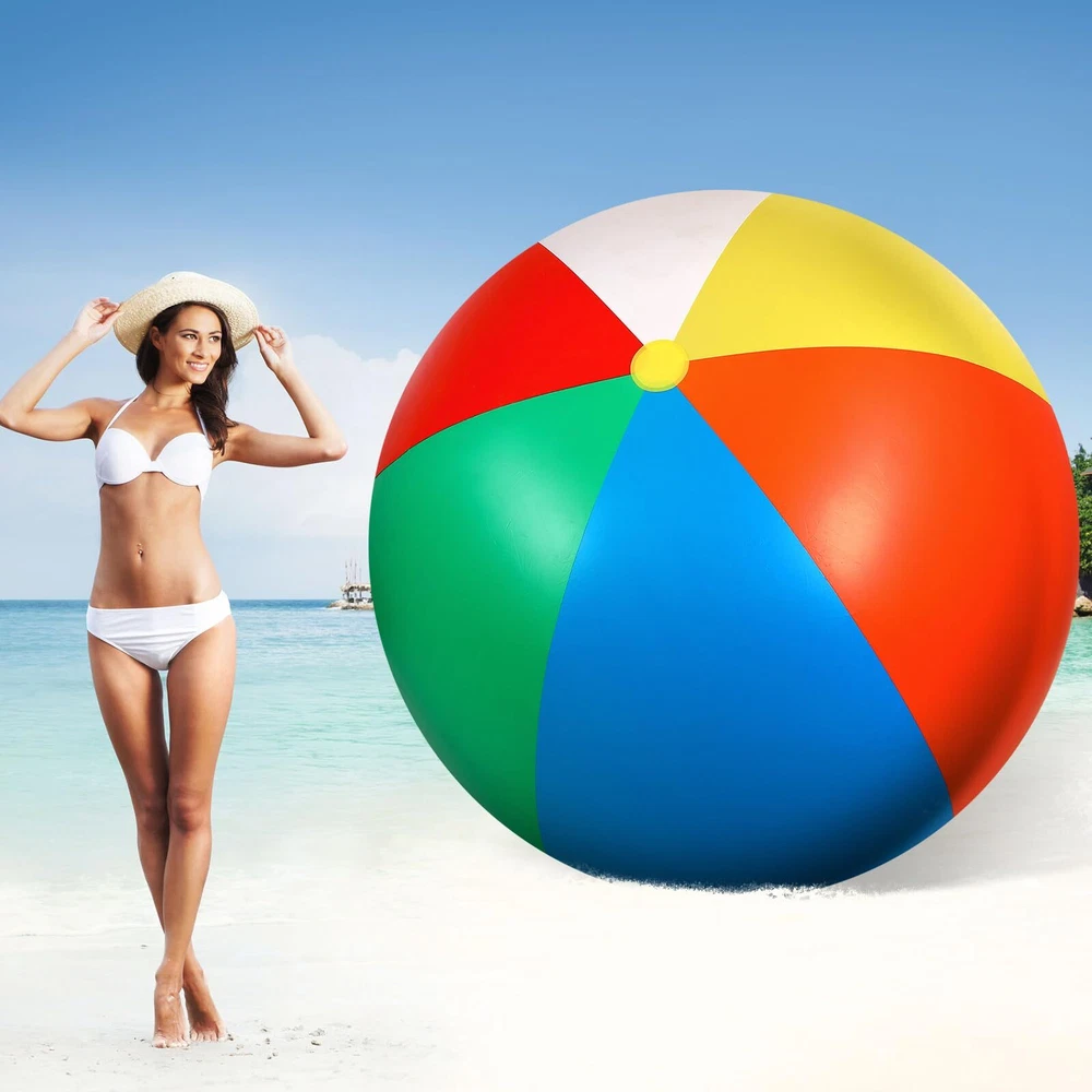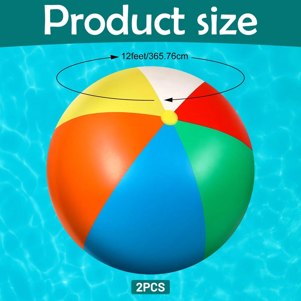 Features: Our 12 feet beach ball adopts classic red, blue, yellow, orange, green and white colors, these bright colors are eye catching and appealing, will be favored by most people. The big ball will bring you and your friend a wonderful game experience. The giant inflatable ball is ideal decoration for parties, pool and beach, large dimension and colorful appearance allow it to be an iconic decor and an unmissable photo prop, which creates a joyful and sportive mood. Specifications: Material: vinyl Color: red, yellow, orange, green, blue and white Size: approx. 12 feet of the diameter Package includes: 2 x Giant beach balls Notes: Manual measurement, please allow slight errors on size. The color may exist a slight difference due to different screen displays. Please do not inflate by hand or blow through the mouth, recommend using the electric pump to inflate. Please check carefully the big size before ordering. Please don't over inflate the ball, and keep it away from heat, fire, or anything pointed. Huge Balls Set: you will receive 2 pieces of inflatable balls, with a very big size of about 12 feet in circumference; We prepare 2 pieces for you to have fun and replace, the big size and enough quantity allow you can enjoy a cheerful playtime with many family members Quality Material: the giant inflatable beach ball is made of thick and sturdy vinyl with reinforced seams to keep the ball filled with air without leaking easily, however, please avoid touching pointed objects to scratch the ball Inflate with an Electric Pump: this inflatable beach ball measures about 12 feet in circumference when fully inflated; Because of the giant size of the beach ball, it is recommended to use the electric pump to inflate, please don't inflate by hand or blow through the mouth, it will take a long, long time Stay Inflated for a Long Time: it may take a lot of time to fully inflate this ball, but at the same time, it won't run out of the air in a short time; Our anti deflation valve of the large inflatable ball is specially designed to hold air tightly, won't tear or separate suddenly, providing you long lasting fun Wide Application: the beach pool toys are good addition to your beach parties, pool parties, sports theme parties and summer parties and more, and can also allow you to have fun at the beach, backyard and school events, bring you endless fun