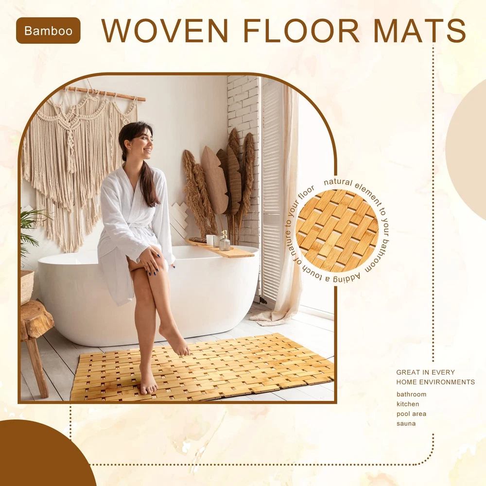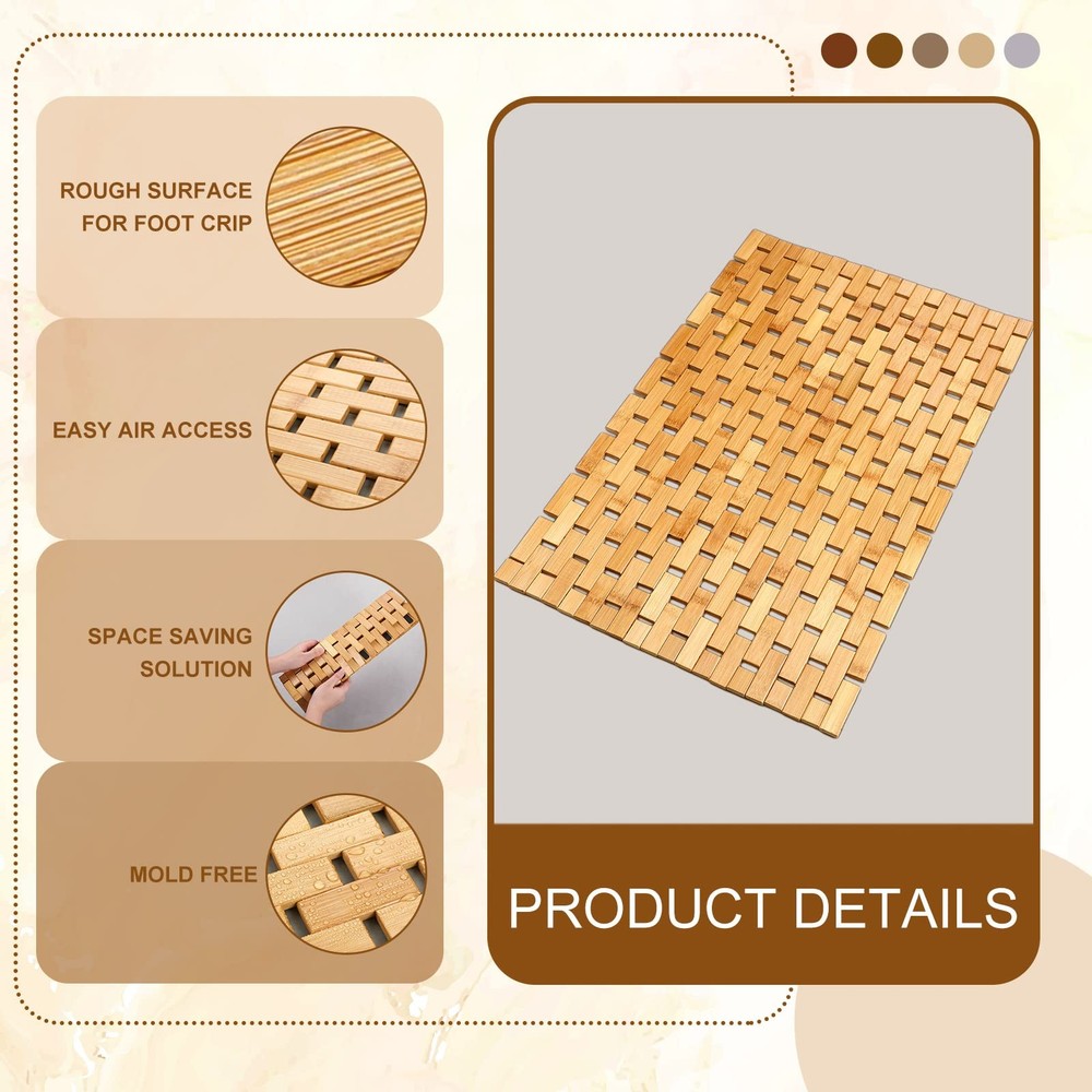 Features: You will be provided with 2 pieces of non skid bamboo bathroom mats in the package, sufficient in quantities and distinctive in design, which are enough for your daily use and replacement needs in daily life. Bamboo bath tub mat can be a practical and decorative addition to your home and suitable for indoor and outdoor use, it will be a suitable gift option for most occasions for your friends, family, neighbors, coworkers and so on. Specifications: Material: bamboo and silicone Color: carbonized color Size: about 24 x 16 inches/ 60 x 40 cm Package includes: 2 x Shower mats for bathroom Notes: Manual measurement, please allow slight errors on size. The color may exist a slight difference due to different screen displays. Foldable Design: our bamboo bathtub mat is measured about 24 x 16 inches/ 60 x 40 cm, which is proper in size and light in weight, and can be folded to carry and store, so you can put it in a bag or car, without taking up too much space Long Time Service: our non slip bath mats for bathroom are mainly made of quality bamboo material, which is safe and reliable, strong in hardness and sturdy, not easy to break, deform, fade or wear, can be applied for a long time Nice Accessories for Fabric Rugs: you can place a fabric rug on top of our bamboo floor mat to keep your rug dry and prevent bad odors from developing due to its multiple lattice openings allowing airflow and water to escape Non Slip Silicone Mat: waterproof bathroom floor mat has a quality silicone material on the bottom, which can grip various floors, including tile and wood, etc., preventing the bath mat from shifting and slipping, protecting you and your family from safety and comfort Wide Range of Uses: wooden bath mats are suitable for placing on bathroom, kitchen, living room, bedroom, doorway, deck, poolside, outdoor camping, beach, under the grill, patio, deck, garages, entryways, office and so on, will easy to draw people's attention