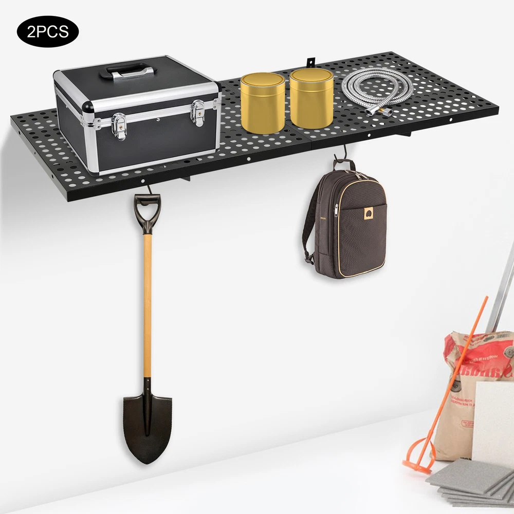2 Pcs Garage Support Shelf Heavy Duty Floating Storage Wall Shelving 20x48 Inch Description This set of garage wall shelves is made of high-quality carbon steel, which boasts strong load-bearing capacity, stable structure, rust resistance , and durability. The perforated surface makes it strong and non-slip at the same time, which ensures safety when storing items. Meanwhile, it is able to store a wide range of items with a load capacity of up to 560 lbs, which can help you effectively utilize your garage space and improve storage efficiency, providing you with efficient, safe, and convenient storage solutions. Key Features Sturdy&Durable: It is made of high-quality carbon steel with a plastic spraying surface, which features high hardness, high strength, and high resistance to corrosion and rust, making our products can be used for a long time. Strong Structure: The stable triangular brackets and sturdy perforated panels with welding process allow our products to carry up to 560 lbs(two boards), which can meet your various storage needs. Large Capacity: The wall-mounted storage rack is 20*48 inches and the removable storage hooks can be moved to any position, allowing you to store various sizes of items and tools on it and meet your actual storage needs while saving space. Flexible Installation: It can be installed vertically or horizontally, allowing you to use the appropriate installation method depending on the size of the installation space and the items to be stored. Money Saving: The package includes enough mounting accessories such as expansion screws and nails to save you time and money. Easy to Clean: It is simple and easy to disassemble making cleaning effortlessly . You can wipe it with a damp rag or disassemble it and rinse it with water for a complete cleaning. Space Saving: Its compact design takes up small wall space and is capable of carrying quite a lot of items. It organizes floor clutter into wall space, expanding more space to use and making your garage and storage room neater. Ideal Gift: With a strong structure and premium material, it is a nice gift for your friends, colleagues, and families for organizing their garages or warehouses. Customer Service: We aim to provide quality products and services. If you have any problems, please feel free to contact us. We will reply and solve the problem for you as soon as possible. Details Hanging Hooks: Four hooks can help you easily store or take frequently-used tools like hammers or drills, or your clothes, making your work more convenient and highly efficient. Perforated Plates: They are not just strong and durable but also boast good ventilation, keeping your items dry and allowing the odor to dissipate in a timely manner. Application It can be installed on wooden and cement walls for storing tools and items in your warehouse or garage. How to Install Measure the installation distance of the bracket. Place the installation template against the wall and place it at the proper height by using a level. Mark the center of the circle by positioning holes of appropriate width. Remove the installation template and then punch holes in the marked positions. Install the bracket. Secure the perforated plate to the bracket. Installation complete. Specifications Color: Black Material: Carbon Steel Shelf Type: Bracket Shelf, Floating Shelf Shape: Rectangular Surface Treatment: Plastic Spray Process: Welding Mount Type: Wall Mounted Assembly Required: Yes Each Product Size(Two Boards): 50.8*121.92cm/20*48inch Each Bracket Height: 20cm/7.87inch Distance Between Center Points of Wall Studs: 60.96cm/24inch Load Bearing of Two Boards: 254kg/560lbs Packaging Size: 52*62*12cm/20.47*24.4*4.72inch Gross Weight: 11kg/24.25lbs Package Included 2*Garage Wall Shelves 4*Hooks All Accessories for Assembly Notes Please check the size carefully before ordering. It is normal that the expansion screw will blow up after the force is applied. It cannot be installed on metal walls. When installing it on cement walls, you need to drill holes in advance. When installing it on thin wood walls or hollow walls, you need to install a certain thickness of solid wood struts(not included) laid on the front or back of the wall to provide support. Before purchasing, please check the product information carefully to make sure the load bearing of your wall and the installation environment are suitable! Please check the screw hole spacing carefully if it is installed on the studs! Please allow the slight color difference caused by the shooting light and 1-3cm error due to manual measurement, and make sure you do not mind before you order. Payment Delivery details Terms of sales About us Contact us Payment We accept ebay payment 。 Fees such as import duties, taxes are not included in the item price or shipping costs. These charges are the buyer's responsibility. Delivery details Shipping: 2-9 working days to: USA Terms of sales We maintain high standards of excellence and strive for hundred percent customer satisfaction. Feedback is very important to us. We hope that you contact us immediately before you give neutral or negative feedback, so that we can address your concerns. It is impossible to address issues if we do not know about them! About us Your satis faction is our ultimate goal. We work hard to earn your trust and future business. Our certified technicians have tested each item before shipping. The unit comes with 1 year limited warranty on all manufacturing defects. a) If you receive a defective item, you may return it or ask for a discount. Please contact us within 14 days after you receive the package. b) What you returned must be intact and in its original packaging as re? u. Customer is responsible for shipping costs of the returned item. c) We will cover the cost of shipping back t with the shipping rate indicated in the registration page. We will send you a new unit or refund the full payment you paid. Thank you. Contact us Business Hour Business Hour