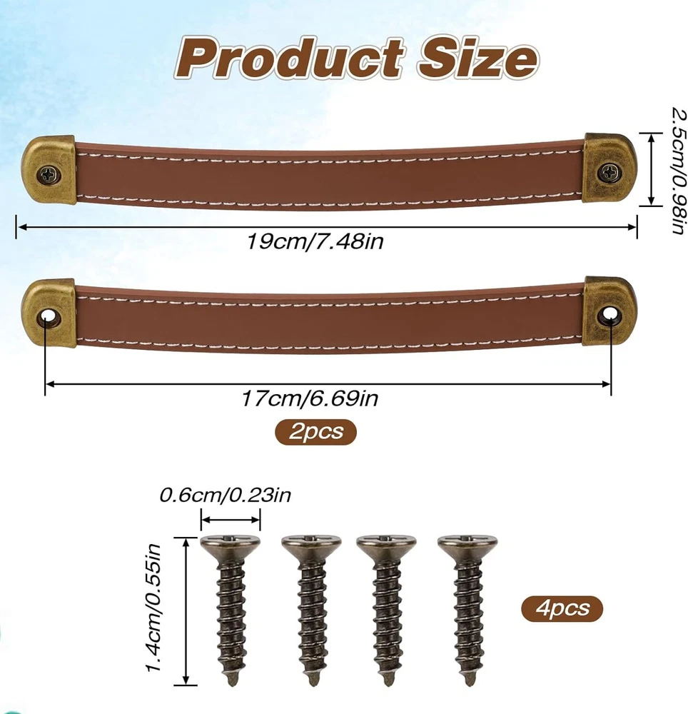 2 Pcs Leather Handles for Drawers Trunk khaki brown Packing List:You will receive 2 pcs leather drawer pulls and 4 pcs screws. They can meet your replacement needs. Quality Material:Our leather trunk handles for drawers are made of PU material. Soft to the touch, wear-resistant, highly breathable, not easily deformed, and has a long service life. Easy to Install:You do not need to drill holes. There are two small holes on both ends of our cabinet door pulls. You can use the matching screws to place it in the right position and tighten it. About Size:The length of this adjustable pull handles is 17.7cm/6.96 inches and the width is 2.1cm/0.82 inches. Can be applied to most items. Shipping We offer FREE shipping on all orders! We ship within Three business days of payment, usually sooner. We use a selection of shipping services such as UPS, FedEx, USPS etc. We only ship to the lower 48 states, no APO/FPO addresses or PO Boxes allowed. Local pickups and combined shipping options are not provided at this time. Return You can return a product for up to 30 days from the date you purchased it. Any product you return must be in the same condition you received it and in the original packaging. Please keep the receipt. Customer satisfaction is very important to us. If you have any problem with your order, please contact us and we will do our best to make you satisfied. Contact Us If you have any queries, please contact us via ebay. We usually respond within 24 hours on weekdays. Please visit our eBay store to check out other items for sale! Thank you for shopping at our store.