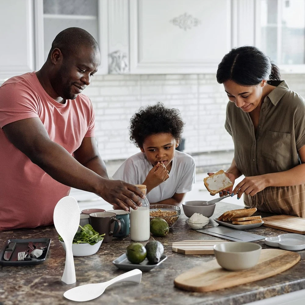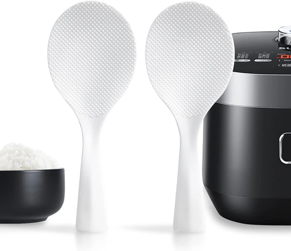2 Pcs Plastic Rice Paddle,Non Stick Standing Rice Spoon Scooper Spatula,Heat Resistant Rice Cooker Spoon White REASSURING QUALITY: The rice spoon is made of food grade silicone material, high quality with 100% BPA a durable PET core. Not easy to melt, environmentally friendly, can withstand temperatures up to 482°F/250°C. HUMANIZED DESIGN: The rice paddle adopt vertical design which not only greatly saving space for placement but also effectively solve the problem that the rice spatula surface is dirty due to contact with other objects. The slightly larger semi-circular design base can be easily and firmly placed while adding a sense of sophistication to the kitchen. COMPACT AND DURABLE: This heavy-duty rice spoon with soft silicone edges will protect the non-stick coating of your rice cooker and pans, while the ample materials will ensure that this product will last for a long time. MULTIPURPOSE: Japanese Shamoji rice spoon Very suitable for rice, sushi rice and super sticky sweet rice,cheese other sticky foods. Easily can be stir & mix, will not scratch other tableware. CAUTIONS: Do not use microwave ovens or place them near high temperatures over 250℃; It is forbidden to damage the silicone caused by wiping with hard objects such as iron wires; Prohibit the use of bleach and dishwashing liquid for long-term soaking. Product includes 3-s & 1 !Specifications:Name: Rice SpoonSize: As PictureMaterial:SiliconePackage Content:2 X Rice SpoonNote: Dear buyer, due to lighting effect, manual measurement, etc., there could be some slight differences between the photo and the actual item. Sincerely hope that you can understand! Thank you!