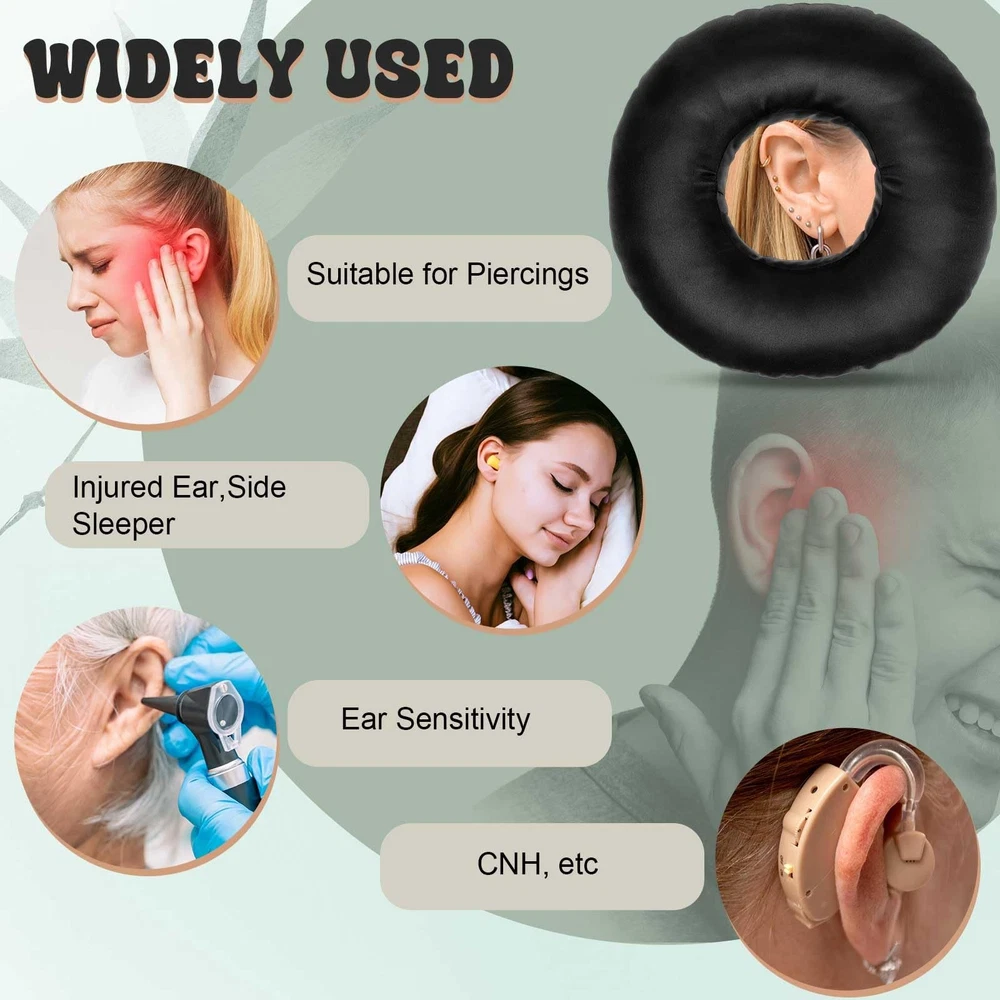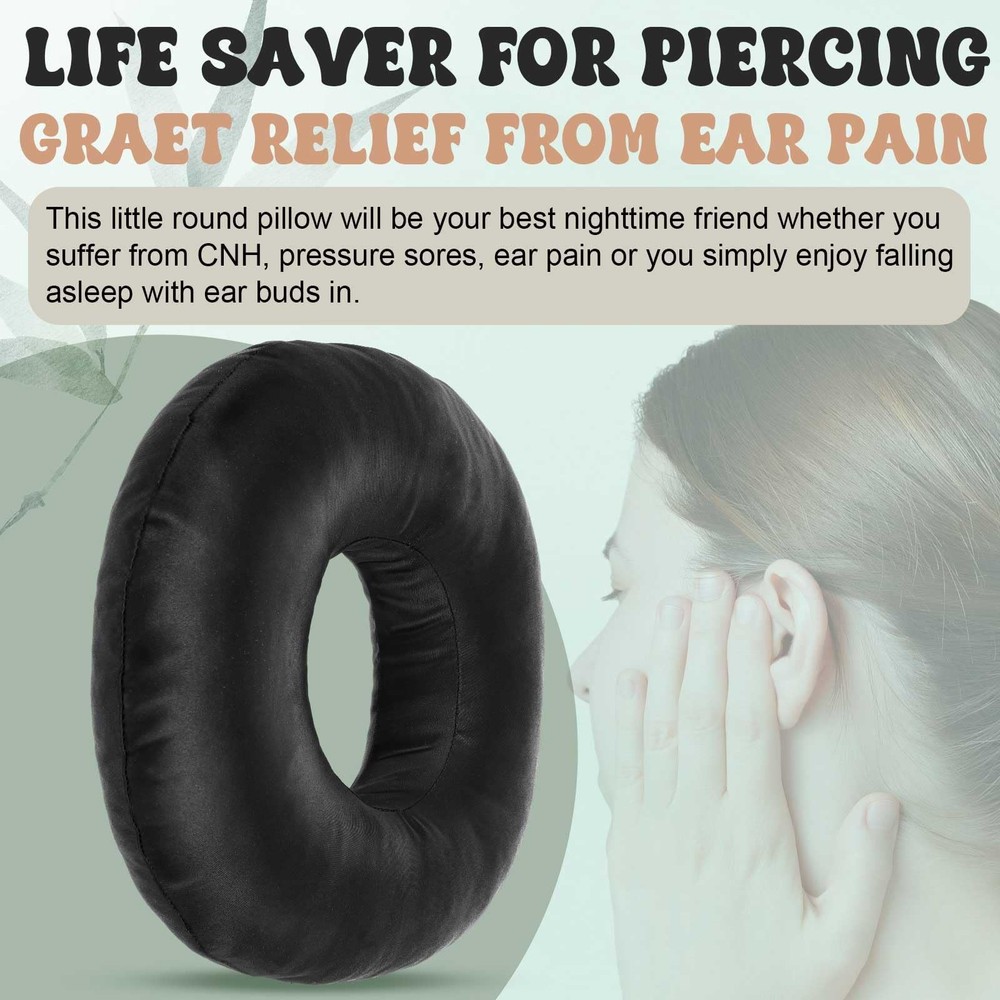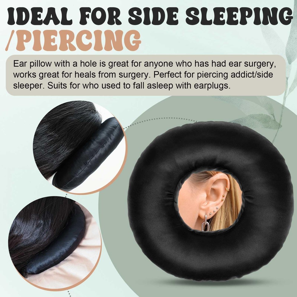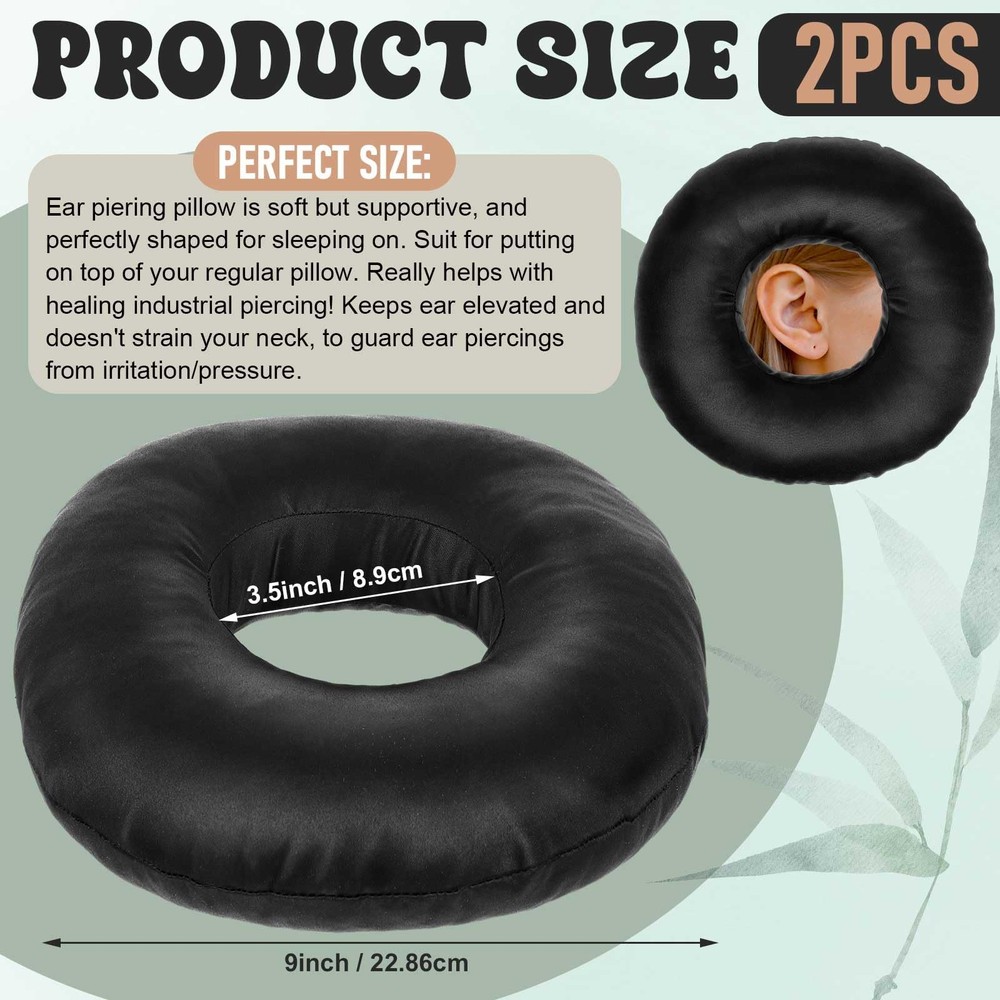 Features: The ear pillows donut can be easily cleaned by hand or in a washing machine with cold water due to its special shape and beautiful black color. It encourages you to maintain maximum hygiene and extend the pillow's longevity. Featuring dimensions of about 11 x 11 x 3.2 inches/ 28 x 28 x 8 cm, it doesn't occupy too much space in your bag or bed, making it a convenient and practical companion for your healing journey. Given its design and comfortable material, this ear hole piecing pillow is absolutely necessary for travel. Specifications: Inner material: polyester, satin Color: black Size: about 11 x 11 x 3.2 inches/ 28 x 28 x 8 cm Package includes: 2 x Ear hole piecing pillows Notes: Manual measurement, please allow slight errors on size. The color may exist a slight difference due to different screen displays. Our product is not suitable for sensitive skin. Test whether there is any allergy on a small part of your skin before use. Please stop applying if there is any discomfort. It is recommended not to use our product continuously, and please be careful to gently remove the product to avoid skin injury. Dual Pack Ear Piercing Pillows: these 2 pieces satin ear hole piecing pillows are ideal for anyone with newly pierced ears seeking relief and quicker healing; The polyester filled pillows relieve ear pain by preventing friction and irritation during sleep, leading to a reduction in redness and no headaches upon waking; For ear cartilage, cochlear studs or ear lobe piercings, these pillows support comfortable sleep and reduce pressure on the ear piercings for effective healing The Nighttime Companion for Piercing Enthusiasts: ideal for those with multiple ear piercings or those who prefer sleeping on their side, this ear pillows donut reduces pain and caters to newly pierced ears immaculately; Ideal for those recovering from ear surgery, wearers of earrings, aids or even ear pain sufferers; Not just for pierced ear enthusiasts and side sleepers, but also for those who prefer sleeping with earplugs in The Healing Ear Piercing Pillow: whether you suffer from bedsores, or earaches, this ear piercing pillow is sure to become your bedtime friend; Its doughnut shape and central opening allow for a comfortable resting place, reducing the pain of friction or compression; Plus, it's for back sleepers who like tying their hair in a ponytail or bun Experience Comfort with Polyester Fill: this ear hole piecing pillow for side sleep provides soft, cloud like luxury for undisturbed sleep every night; Its reliable polyester filling does not deflect under pressure; Moreover, the pillow's design prevents direct contact between the ear and bed surface, preventing headaches or neck pain making your ear piercing journey more comfortable Designed with an Adjustable Strength: this piecing pillow is light but durable, shaped to accommodate the ear, and provides ample support for the head; The pillow's side zipper allows for effortless removal of excess filling to adjust to your liking; Sized to not occupy much space on your bed or travel bag, this black pillow can also support injured piercings, prevent neck strain, and reduces irritation/pressure on your piercing while adding to your comfort