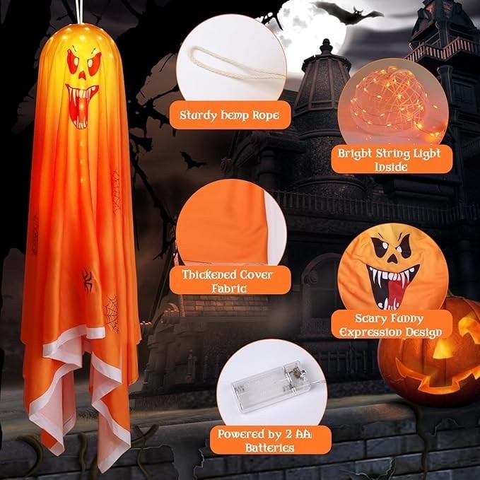 About this item đ»ăHalloween Decoration Lightsă FUNIAO Halloween Ghost Decorative Lights Set includes a 23.9in and 53.2in Halloween ghosts, 2 sizes meet your different decorating idea, made of high quality cloth cover, and bright string of lights, catch the eye of your neighbors. Its scary expression design add Halloween atmosphere to your home. đ»ăSpooky and Attractive Ghost Ornamentsă Outdoor Halloween ghost decorations are made of high quality materials, 2 string lights powered by 2 AA batteries (Batteries NOT included), create sparkle and shine Halloween vibe. The plastic head frames and white fabric pieces create the ultimate ghostly atmosphere even not light up. Perfect for indoor and outdoor Halloween decorations. đ»ăPerfect Ghost Prop Decorationă Easy to assemble, 2 sizes to meet your different decorating needs. Simply cover the cloth on the plastic shell and hang it to create an impressive Halloween spooky haunted house. đ»ăClassic Halloween Ghostsă With sturdy twine at the top, you can easily hang them on the wall, front door, patio, lawn, garden, ceiling, yard, outdoor tree, and anywhere else for a chic Halloween atmosphere.