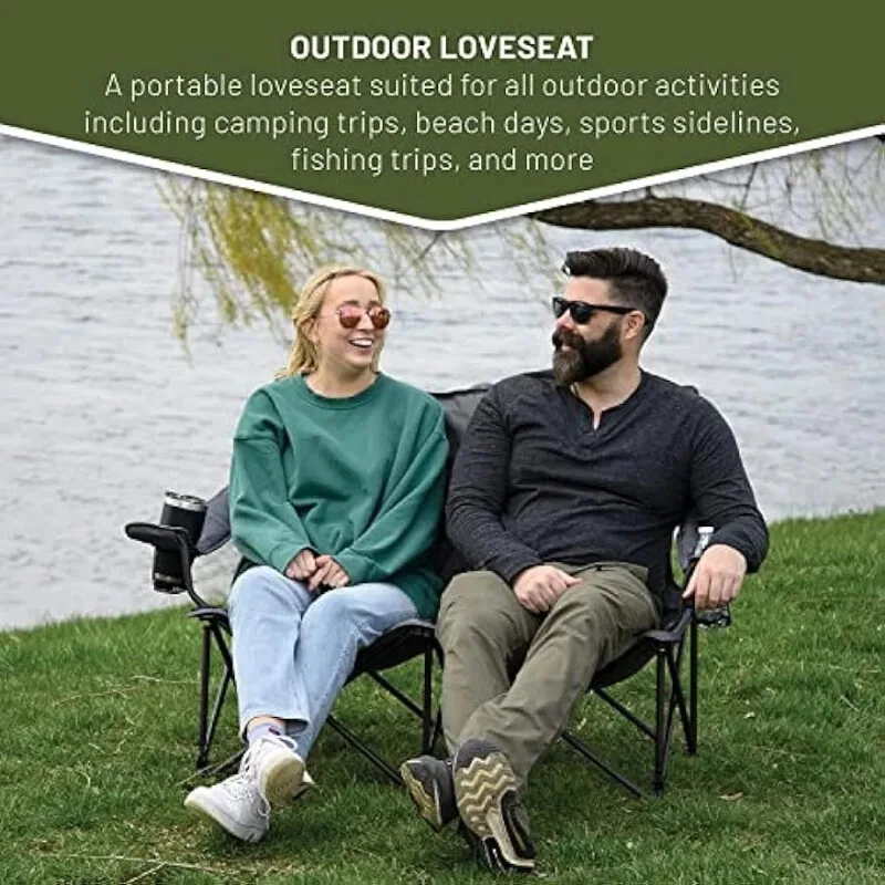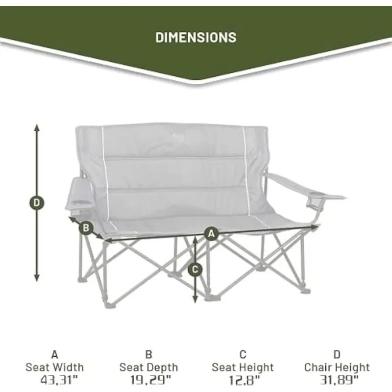 Color Grey Product Dimensions 17.7"D x 41.3"W x 33.1"H Size Support Up to 500 lbs, Back Style Solid Back About this item DOUBLE CAMPING CHAIR - Double chair is ideal for couples or friends who want to sit together. Portable outdoor loveseat design meets the needs of 2 person outdoors while being very easy to transport and store LOWER HEIGHT DESIGN - This camping couch is typically lower in seat height than traditional camping chairs, which allows for a more relaxed seating position, that is ideal for people who want to sit close to the ground and feel more connected to nature while camping LIGHTWEIGHT CAMPING LOVESEAT- The lawn chairs folding feature a lightweight and durable steel frame that provides enough sturdy support, 10.8 lbs lightweight and portable design for easy transportation and storage in outdoors scenarios DIMENSIONS- The camping couch's set up size is 17.72" x 41.34" x 32.28", folding size is 11.02" x 9.45" x 32.28". Max load is 500 lbs.Versatile design can be used as a lawn chair, camping couch, outdoor chair, or sports chair for adult in a variety of activities MANUFACTURER'S WARRANTY- Timber Ridge camping chair offers 1 year warranty, no matter double camping chair is damaged during use or in the process of transportation, the after-sales team is ready to serve you