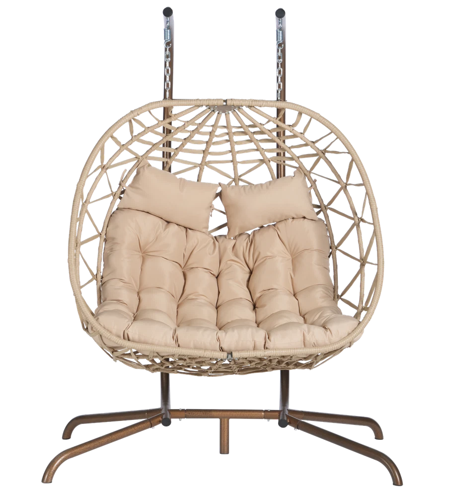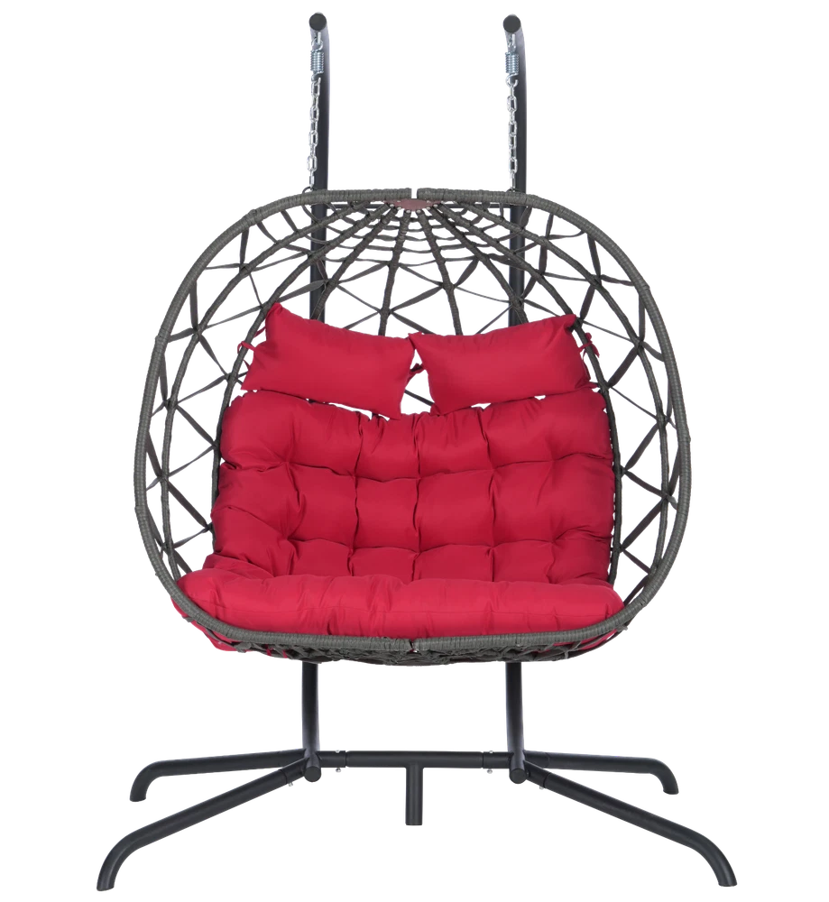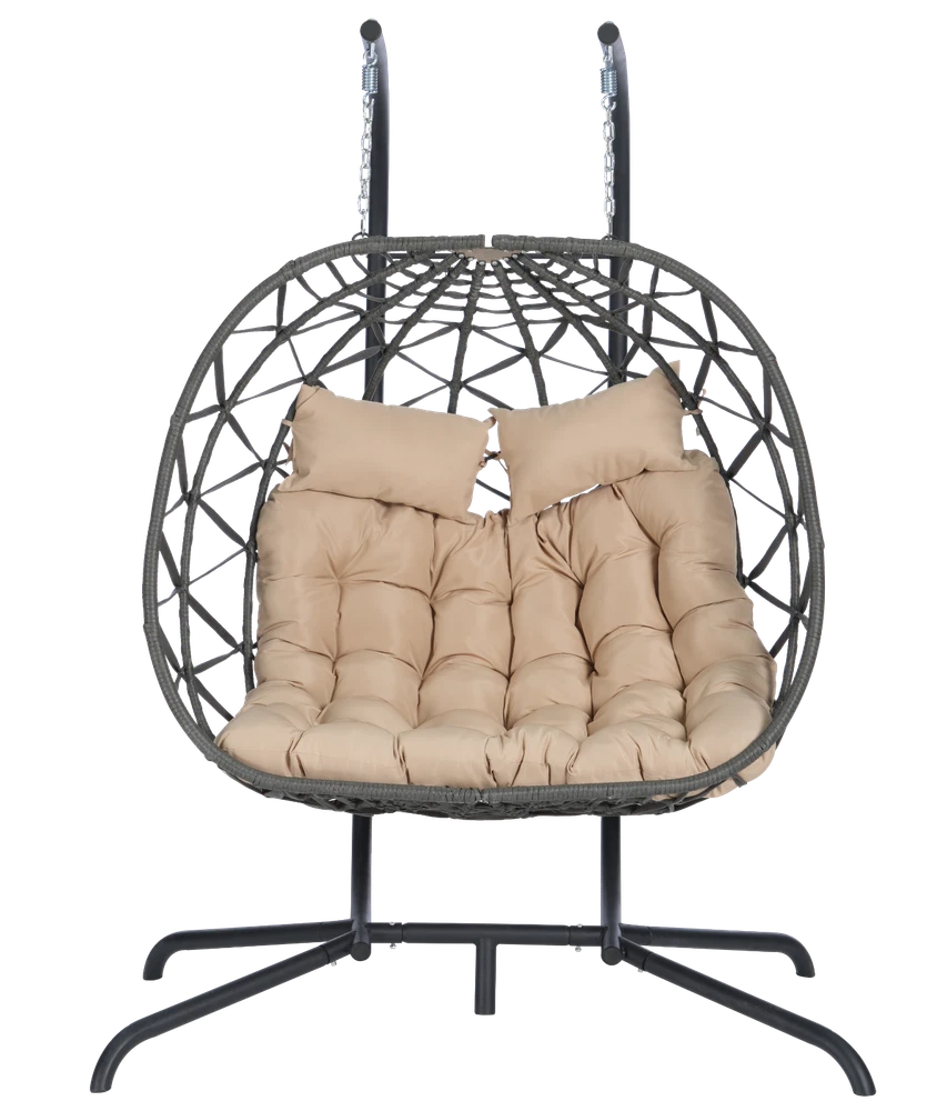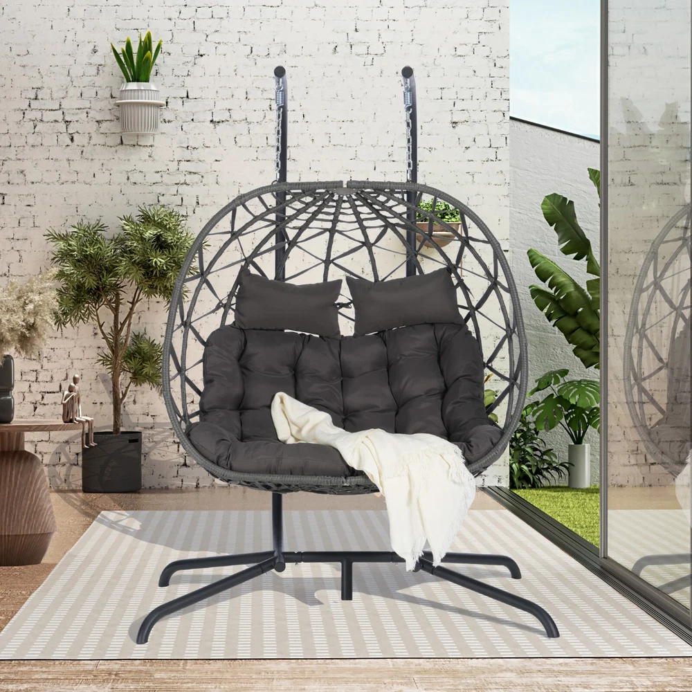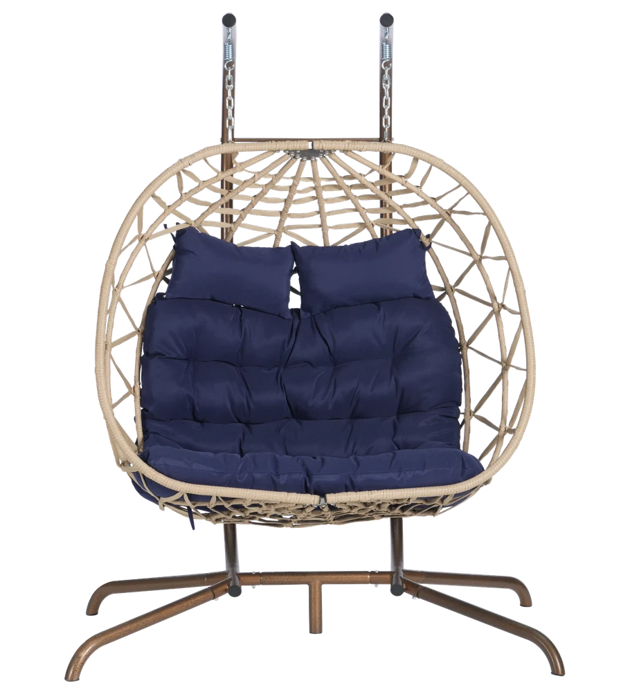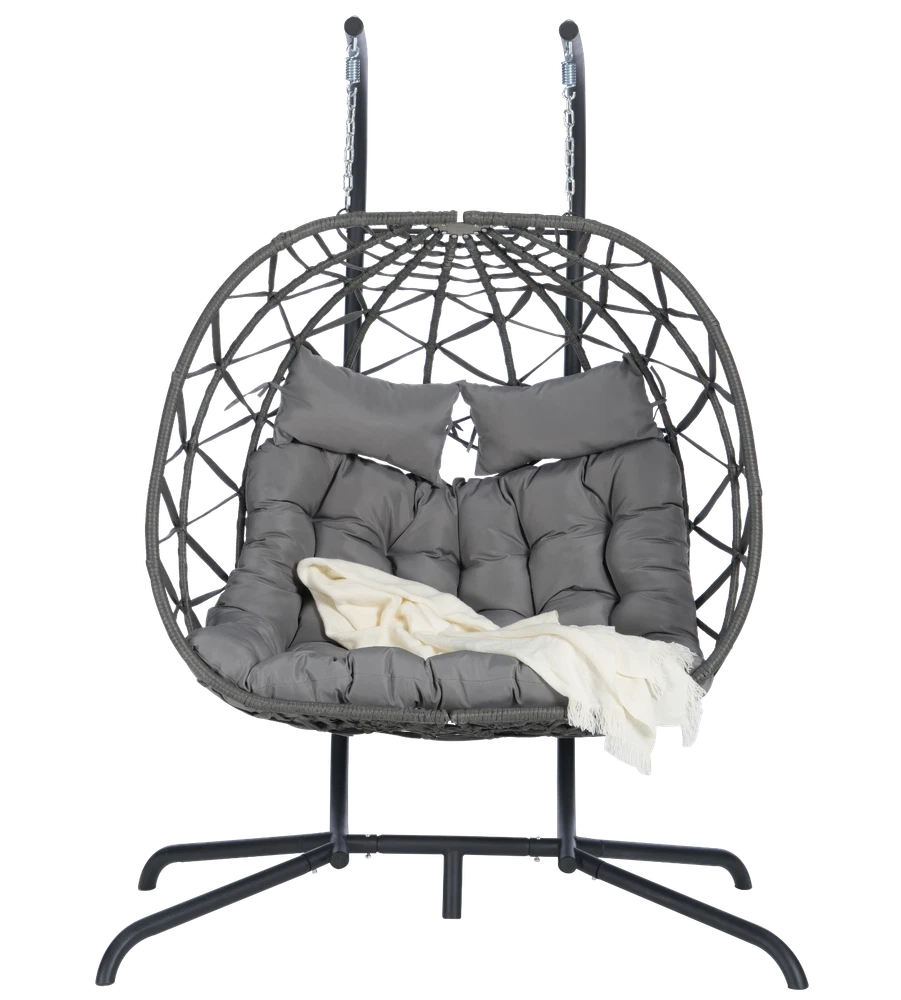 Description: This egg swing chair that fits 2 people comfortably was built to last in the outdoors with its strong durable iron frame it will be perfect for all weathers. Sit in luxurious comfort while surrounded by the peace and beauty of your backyard, or enjoy a good book indoors with this comfortable hanging chair. The seat cushions are made of premium polyester fabric and filled with cotton, it is soft and comfortable. The chair is crafted from wicker rattan, it is UV-Resistant, rust resistance and weather-resistant. Metal stand ensure the stability and safety for you and your family. Features: 1.High-quality durable iron frame, UV-Resistant, & rust resistance great for outdoor use 2.Hand-woven and handcrafted Wicker material by outstanding craftsmen 3.Cushion made from outdoor fabric and filled with soft Cotton, breathable design 4.Supported by a stand constructed from strong and durable iron 5.Fits 2 people and enough space for any position that you like 6.Iron Spreader Bar Included 7.Simple Assembly Required Specifications: Product Type: Egg Chair Style: Modern Seating Capacity: 2 Chair Frame Color: Dark Gray, Light Yellow Cushion Color: Dark Gray, Blue, Light Gray, Red, Khahi Frame Material: Iron Chair Material: Rattan With Stand: Yes Cushions Included:Yes Cushion Material: Polyester Fabric Seat Fill Material: Cotton Assembly Required: Yes Additional Tools Required: All Tools Included Est. Assembly Time: 30 Mins Weight Capacity: 600 lbs Dimension: 58.66"L x 38.18"W x 75.19"H Weight: 78 lb Number of Packages: 1 Package Included: 1x Egg Chair 2x Cushions 1x Stand 1x Hardware Bag 1x Instruction