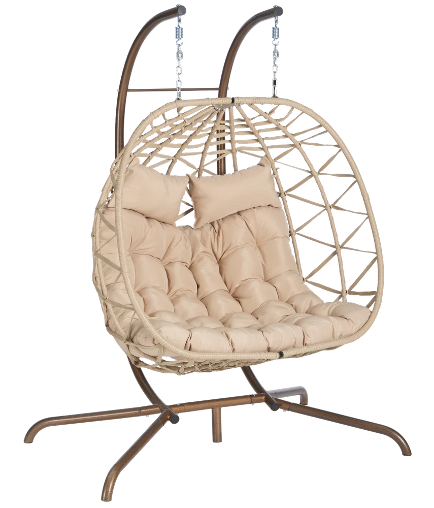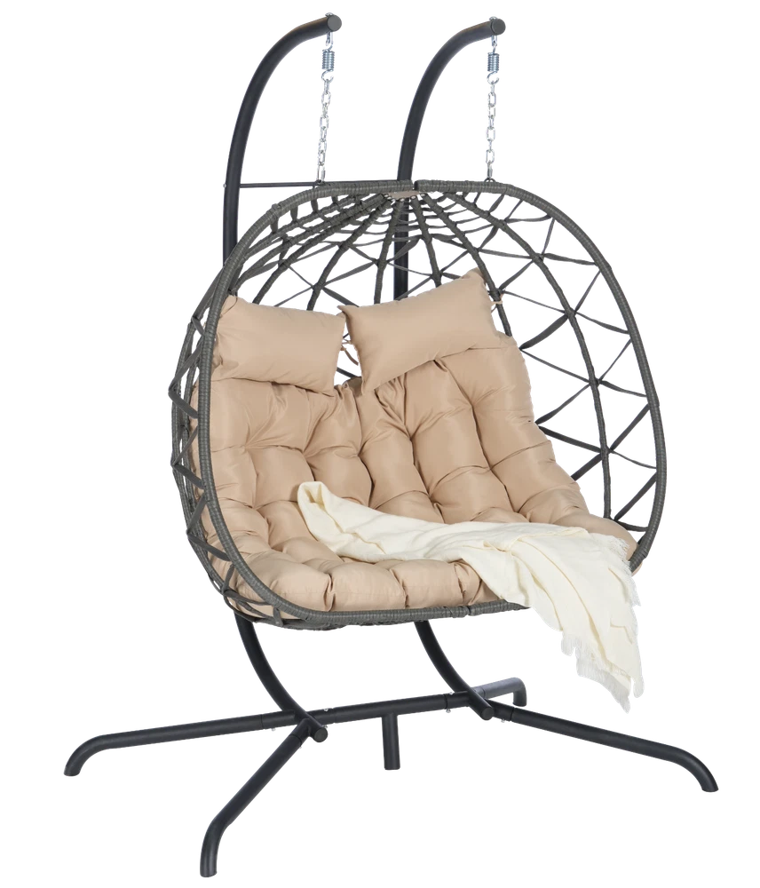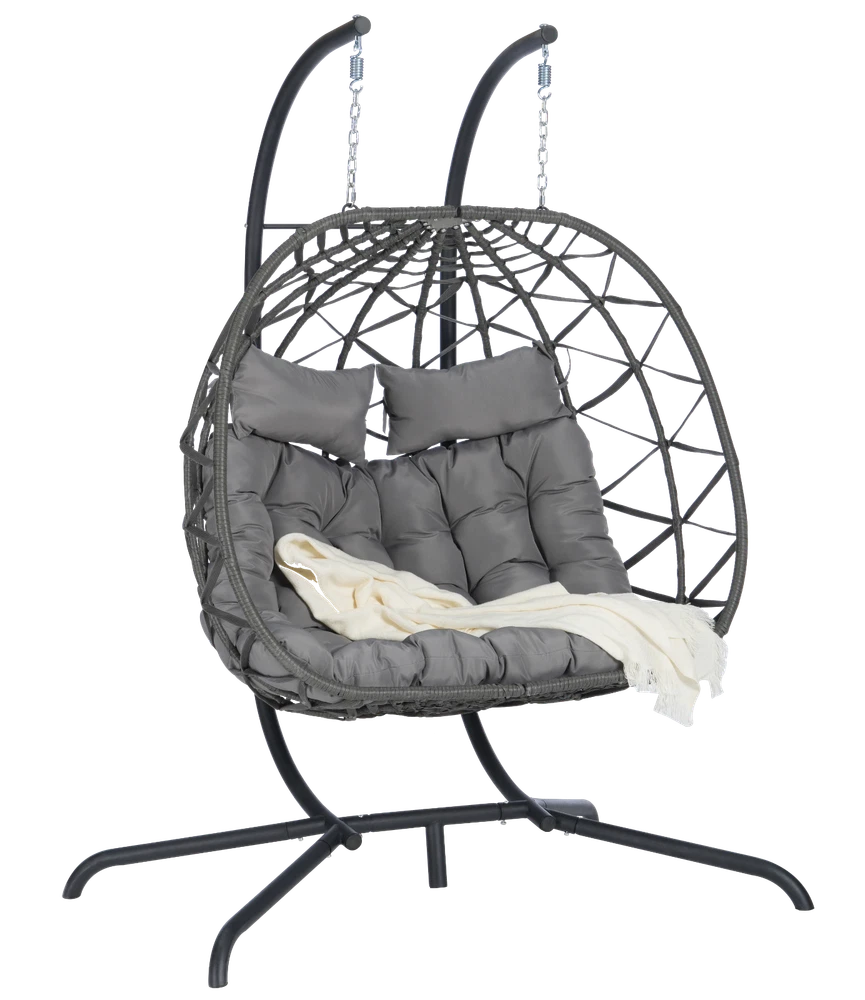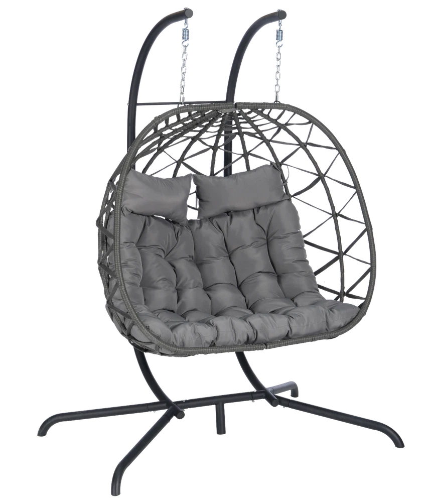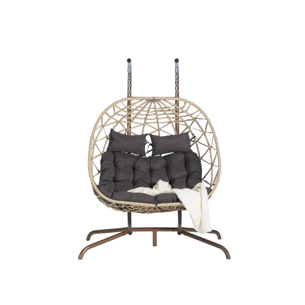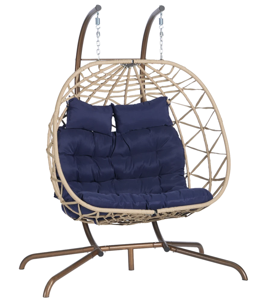 Description: This egg swing chair that fits 2 people comfortably was built to last in the outdoors with its strong durable iron frame it will be perfect for all weathers. Sit in luxurious comfort while surrounded by the peace and beauty of your backyard, or enjoy a good book indoors with this comfortable hanging chair. The seat cushions are made of premium polyester fabric and filled with cotton, it is soft and comfortable. The chair is crafted from wicker rattan, it is UV-Resistant, rust resistance and weather-resistant. Metal stand ensure the stability and safety for you and your family. Features: 1.High-quality durable iron frame, UV-Resistant, & rust resistance great for outdoor use 2.Hand-woven and handcrafted Wicker material by outstanding craftsmen 3.Cushion made from outdoor fabric and filled with soft Cotton, breathable design 4.Supported by a stand constructed from strong and durable iron 5.Fits 2 people and enough space for any position that you like 6.Iron Spreader Bar Included 7.Simple Assembly Required Specifications: Product Type: Egg Chair Style: Modern Seating Capacity: 2 Chair Frame Color: Dark Gray, Light Yellow Cushion Color: Dark Gray, Blue, Light Gray, Red, Khahi Frame Material: Iron Chair Material: Rattan With Stand: Yes Cushions Included:Yes Cushion Material: Polyester Fabric Seat Fill Material: Cotton Assembly Required: Yes Additional Tools Required: All Tools Included Est. Assembly Time: 30 Mins Weight Capacity: 600 lbs Dimension: 58.66"L x 38.18"W x 75.19"H Weight: 78 lb Number of Packages: 1 Package Included: 1x Egg Chair 2x Cushions 1x Stand 1x Hardware Bag 1x Instruction
