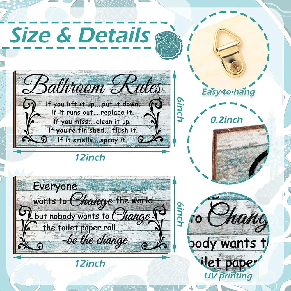 2 Pieces Funny Teal Bathroom Signs Beach Theme Wall Decor Chic Style Product Details Color: Chic Style Brand: Jetec Material: Wood Theme: Words & Quotes Recommended Uses For Product: Property What you will get: the package contains 2 pieces of funny bathroom signs and swivel loop hangers, each of them measures approx. 12 x 6 x 0.2 inches, a suitable size for you to decorate your home, and there are bathroom rules and to be change on it, all of them are bathroom themes, to make your visitors feel warm and comfortable Widespread applications: there are lots of places where you can hang your ocean theme beach bathroom decors: bathroom walls, furniture mantels, patio, front porch, living room, fences, and so on, it would be a nice home decoration for your relaxing bathroom, it depends on where you want to hang it, what's more, you can hang it single or set Reliable material and UV printing: the decors use reliable wooden construction, to make sure you can use it for years and years, also wooden decors have no bad smelling compared with PVC material, what's more, our UV printing technology makes the letters and color clear and stable, it won't change color or disappear under the sunshine Easy to use: there are 2 swivel loop hangers equipped on your package, it's the most convenient and widespread way to install it, the only thing you need to do is put it on where you want to hang, whether you hang or remove, there is no scratching to your home Nice gift idea: we always send presents to people around us to show our feelings about them, sending the bohemian decor wall tapestries to your family, neighbors or friends as daily gifts is a brilliant idea, and it also can fully express your appreciation and enthusiasm to them, what's more, when they look at the wall, they will remember you