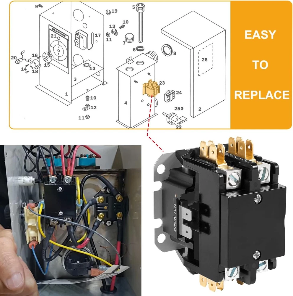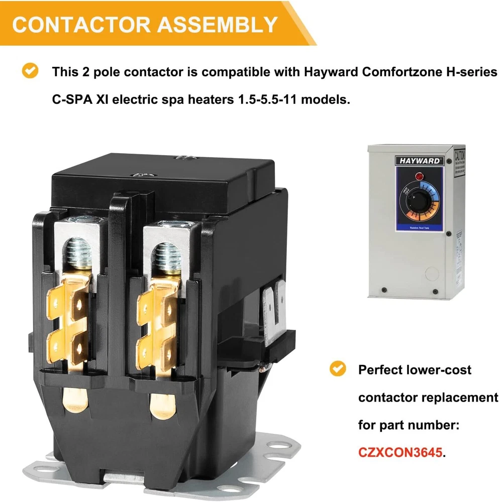 2 Pole Contactor Assembly 220V 50/60Hz for Hayward Comfortzone H-Series C-SPA 【Perfect Compatibility】 This 2 pole contactor is compatible with Hayward Comfortzone H-series C-SPA XI electric spa heaters 1.5-5.5 -11 models. 【Direct Replacement】 Perfect lower-cost contactor replacement for part number: CZXCON3645. 【Product Specification】 Coil Voltage: 200/240V AC, Work Frequency: 50~60Hz, Pole: 2 pole, Fully enclosed body. 【Durable Material】 Made of high quality copper, steel and long-lasting plastic for sturdy and durable. Good wear, corrosion and rust resistance, high and low teperature resistance. Professionally manufactured for meeting or exceeding for the OEM quality standard, keeping good performance. 【100% Satisfaction Guarantee】 The Team aims to provide you the best products and services. We support 30 days returns and 12 months warranty. Please feel free to contact us if you have any question. Product Description Product Specification Direct Replacement Application Product Dimension 1.All Payments must be Confirmed (Shipping and billing addresses must match) Payment is required within 7 days from the date of the auction ending. 2.We accept PayPal, MasterCard, Visa, American Express, Discover and etc payment. 1.Orders will be ship out within 1 business days via USPS, Or UPS . (Orders from Saturdays, Sundays or holidays will process on next business day and will be ship within 24 hours. ) 2.All of the items are shipped from our Warehouse in USA.It will take about 3 to 5 business days to you. 3.Any defective items received can be replaced or refunded. Please contact us with the item number, eBay ID and defect description. 1.100% Satisfaction Guarantee: If you're not 100% satisfied with our items, simply return it for a full refund in 60 days (Items must be in new condition and in original package). Kindly please feel free to contact us before return. 2.Return or Replacements: Support 12 months' Warranty. All product will be tested in 100% before delivery. If the item is was damaged in transit, kindly please contact us for a replacement or refund (Excluding contrived damage or misuse). Any question, please don’t hesitate to let us know. We try our best to reply to your emails as soon as possible, due to high volume of daily incoming emails, we may not be able to reply your emails immediately. Please allow 24 hours for us to response. your understanding and patience is much appreciated!