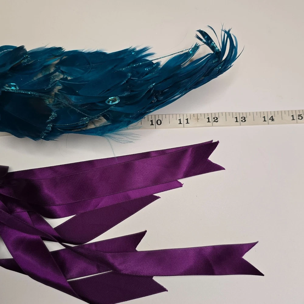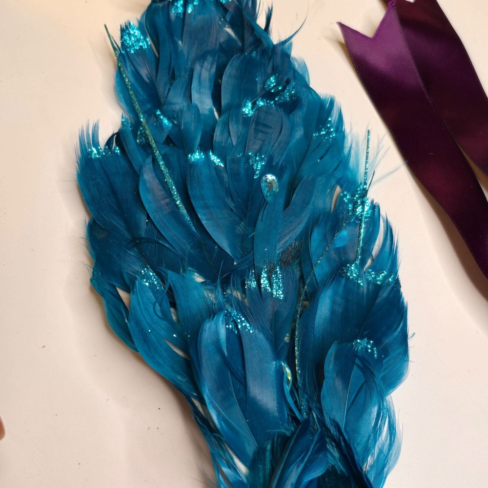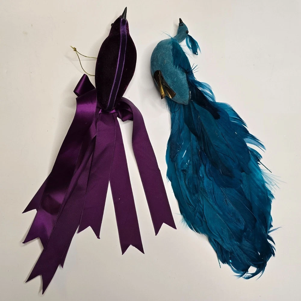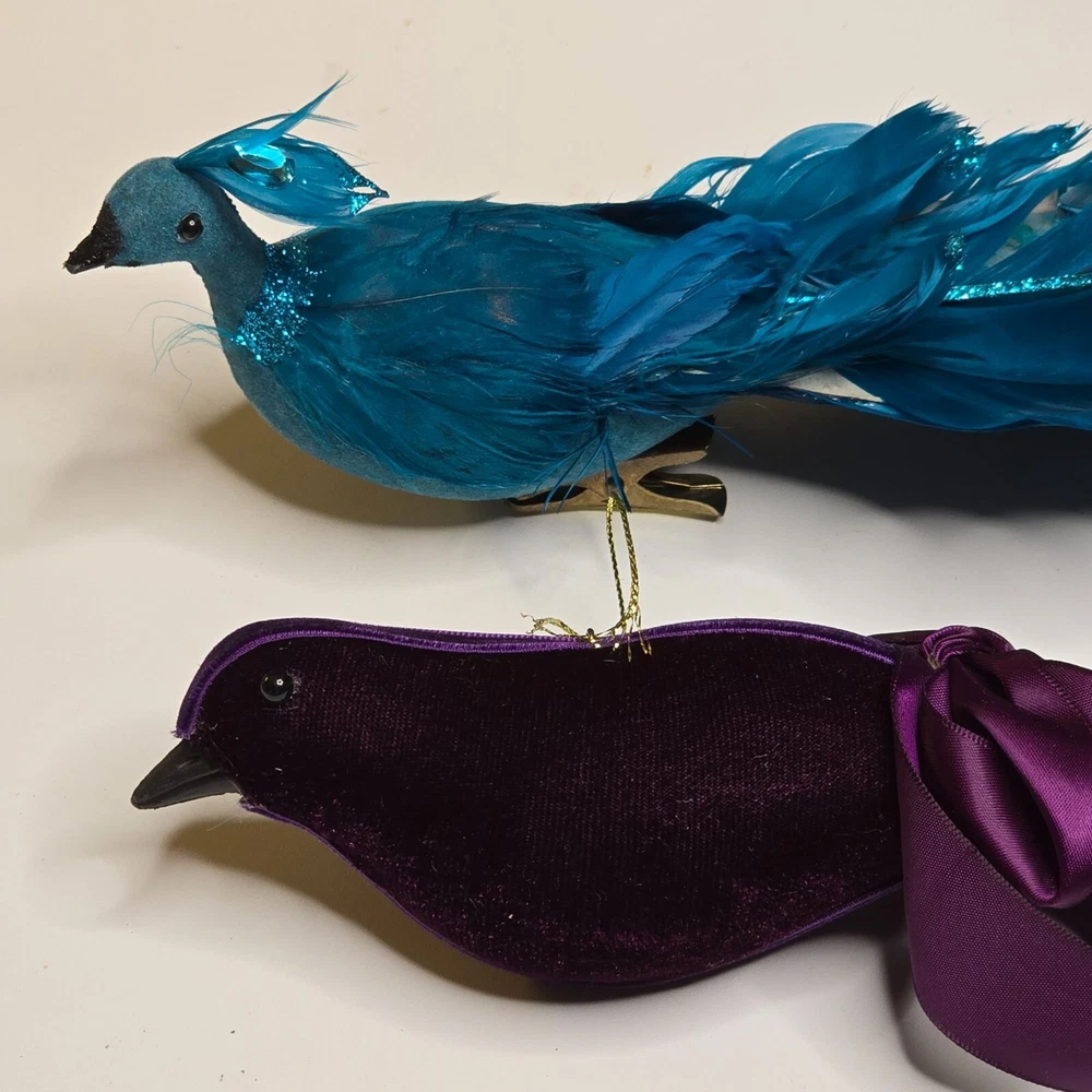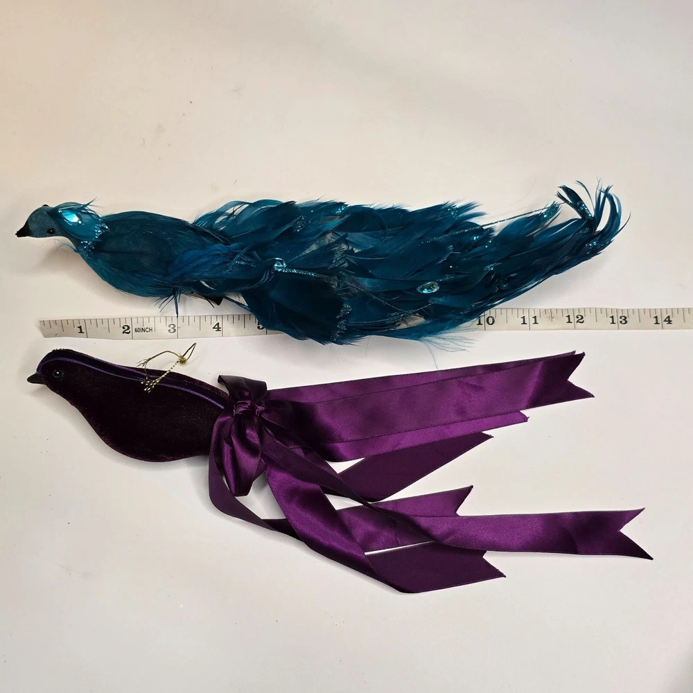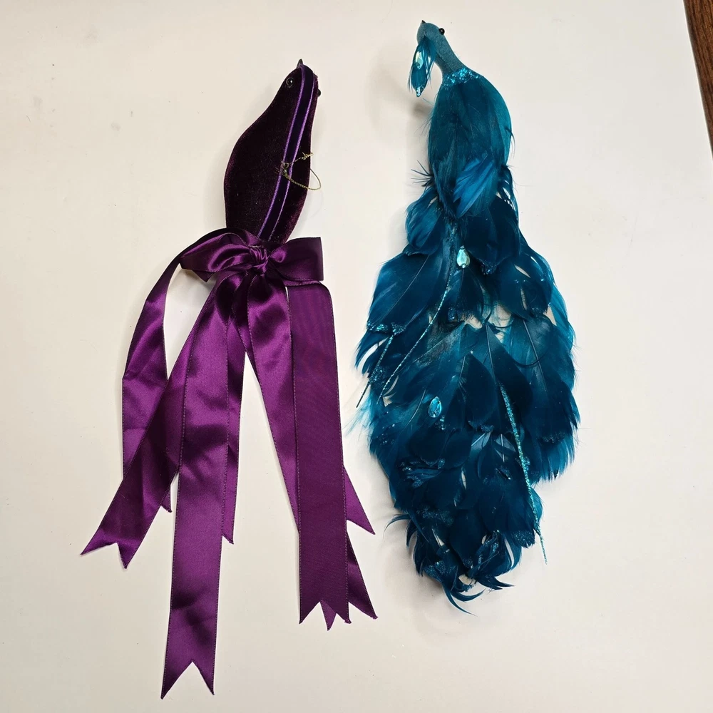 Enhance your home decor with these elegant bird ornaments. Featuring a teal peacock adorned with feathers and glitter, and a purple velvet bird with a satin ribbon, they provide a sophisticated touch to any setting. Ideal for display on mantels, shelves, or as part of a festive arrangement. • Teal glitter accents • Satin ribbon ties • Velvet fabric detail • Lightweight design Features: • Decorative Bird Ornaments, Christmas Birds Size: Approx 12" Condition: Pre-Owned Good Good Condition Gently Used No Clips Please be sure review all photos and description closely before purchasing, thank you! Smoke free work space Please read the description for further details and measurements, Thank you!