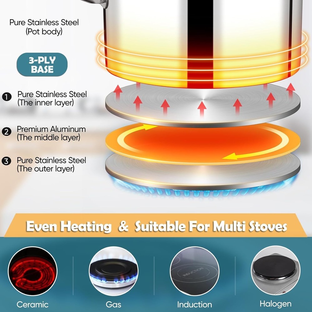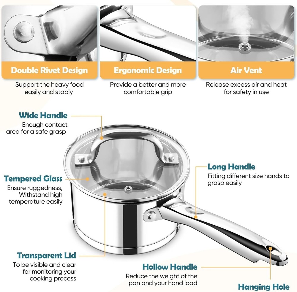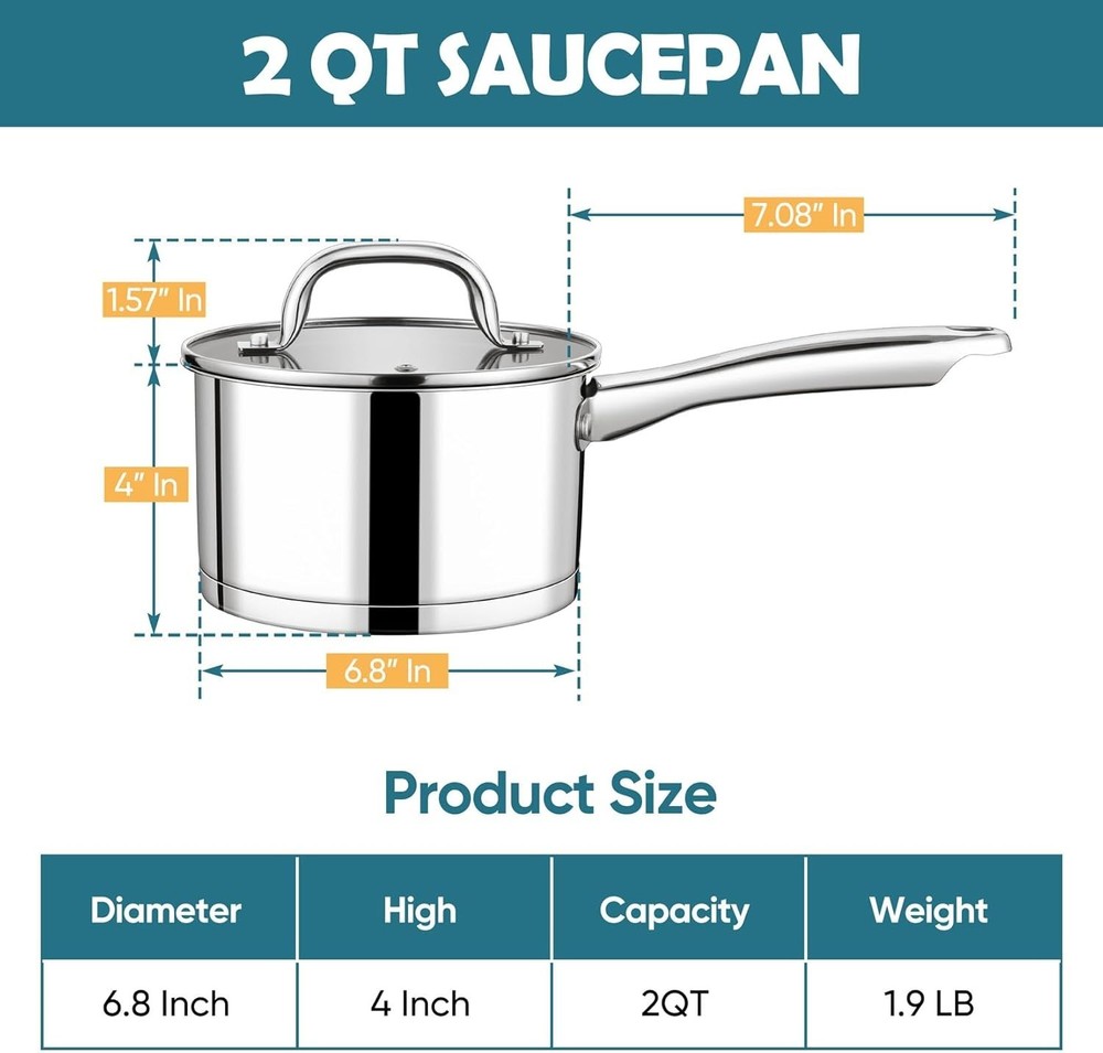 About this item 【Healthy Material & Exquisite Craft】P&P CHEF 2 qt saucepan with lid is made of food grade stainless steel and premium tempered glass without any toxic or chemical materials, Help to cook healthy meals easily, Exterior mirrored surface always retain its shine, 90° pot side adds an attractive and elegant outlook, Matches with different styles of kitchens, Firmly welded handle ensures the overall good quality and durability 【Thoughtful User-Centric Design】2 qt sauce pan has one ergonomic pot handle and wide lid handle to provide a comfortable gripping, The long and hollow pot handle allows different sizes of the hand to grasp firmly and lighten your hand load, Faster dissipate heat than the solid pot handle, Lid with a vent is used for releasing excess air and heat from the pot for safety use, Transparent cover making you clearly see the progress of cooking 【Tri-ply Base for Multi Stoves】The small pot bottom with 3-Ply constructions, Pure stainless steel of outer and inner layers for rust-proof and longtime use, Core aluminium is to conduct heat faster and more even (this layer will not contact your food ), And straight side helps to increase the bottom area which is equal to heating surface, To reduce your cooking time and save energy, Making your pan work with many stovetops effectively, such as induction, gas, electric and ceramic stove etc, Say goodbye to the limitations of traditional pan 【Versatile 2 Qt Saucepan】The volume of 2 Qt saucepan is suitable to cook food for 2 people, Fitting lid helps to retain heat and quickly heat up the food in the pan, You could use the pot for warming milk, cooking pasta, simmering soup and preparing sauces, And stainless steel saucepan could be used in oven for making cake, bread etc (but lid couldn’t), From stovetop cooking to oven baking, To meet your many ways of cooking need 【Easily Clean & Save Space】Our sauce pan and lid is basically no cleaning dead corner, Overall mirror polished surface helps to reduce the risks of food sticking effectively, Making it clean easily by hand, Always keep shiny after taking out from dishwasher, To save your precious time and labor, Making cleanup hassle-free after cooking, A big hole on the handle end make you can hang up pot easily on the hook, Saving space and maintaining tidiness of your kitchen This 2 Quart Saucepan with Lid Set is a versatile and durable addition to any kitchen. Made from stainless steel with a tri-ply base, this small cooking pot is suitable for use on both electric and gas stoves. The round shape and polished silver finish make it a stylish and functional piece of cookware. With a capacity of 2 quarts, this saucepan is perfect for cooking smaller meals or sauces. The included lid and dishwasher-safe care instructions ensure easy maintenance and convenience. Made in the United States, this saucepan set is reliable and high-quality for all your cooking needs.