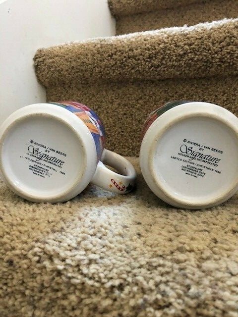 Two holiday mugs with room for ample warm drinks like cocoa, cider, coffee or tea Each has a cute design inside the mug that coincides with the wrap around print on the outside and the handle has festive detail, as well 3.25" across and 4.5" tall The Nutcracker has a tiny green spot of paint scratched off The reindeer one appears to have no imperfections. No chips or cracks but there are marks on the bottom from the spoons from stirring. SMOKE FREE HOME Bidding starts at $14.99 Winner pays $13.99 shipping PAYPAL is preferred