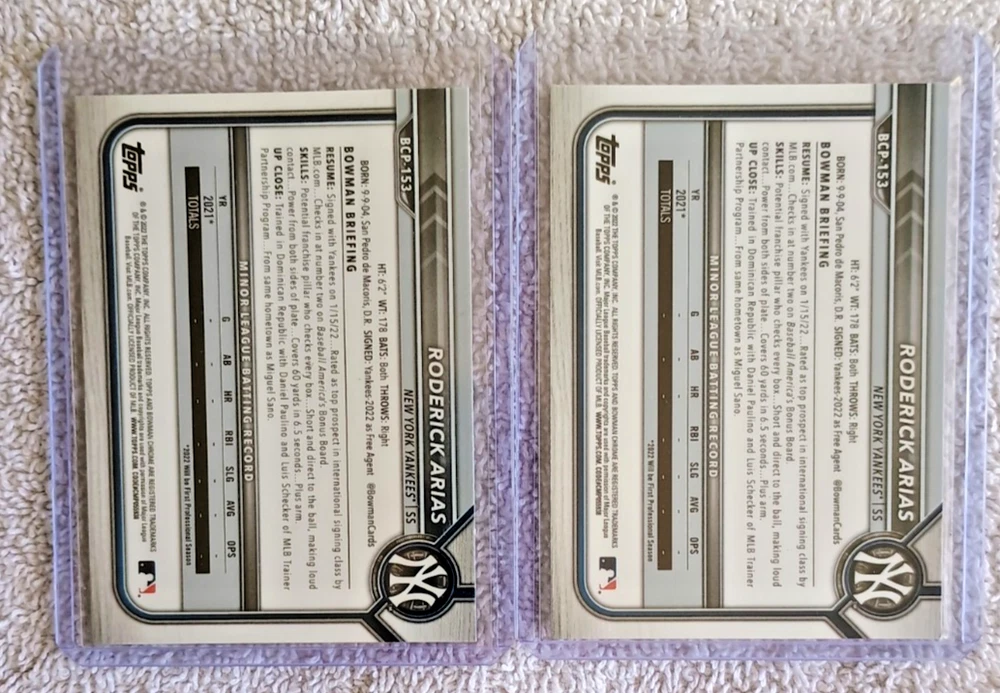 2 RODERICK ARIAS 2022 BOWMAN CHROME MEGA MOJO REFRACTOR RC LOT # BCP153 YANKEES SHIPPING WILL BE $4.99. I DO COMBINE SHIPPING FOR ADDITIONAL ITEMS PURCHASED. PLEASE CONTACT ME FOR DISCOUNTED RATES. USPS FIRST CLASS SHIPPING UNLESS OTHERWISE LISTED. I ONLY SHIP TO THE U.S. EBAY SELLER WITH 100% FEEDBACK. PLEASE VIEW MY OTHER LISTING. MONEY BACK IS GURANTED IF YOU NOT SATISFIED WITH THE RETURN OF THE ITEM OR ITEMS.