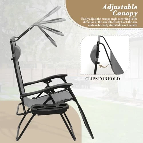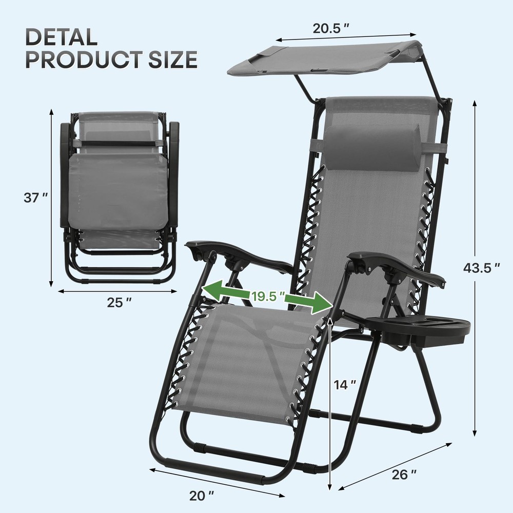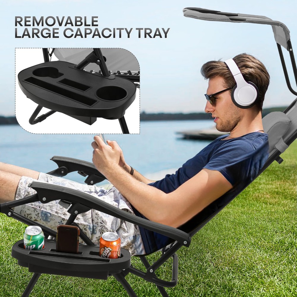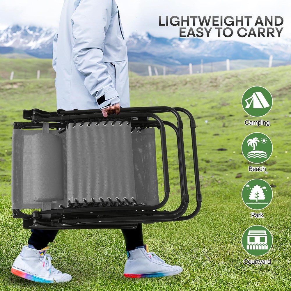 Going on an outdoor adventure? Discover the versatility of a folding chaise lounge chair! It the perfect seating companion for camping trips, picnics, sunbathing, or any other outdoor activity. Its compact design allows for easy storage and transport, making it a practical and space-saving option. Plus, with customizable features, durable construction, and a comfortable design, this chaise lounge chair delivers a convenient and relaxing seating experience for any occasion. Premium Materials: Composed of sturdy metal support and breathable mesh fabric with wear-resistant double bungee rope design enhances load-bearing and elasticity. The weight capacity of this outdoor chair set is 330 lbs. Flexible Adjustment: Featuring a lockable recline function, you can switch this beach chair’s recline to your liking when utilizing the flexible buttons. And this set of fabric lounge chairs can effectively relieve your fatigue Wide Range of Application: This foldable lawn chair can be placed in the trunk of a car and is easy to carry on outdoor trips. It can be used at the beach, poolside, courtyard, balcony, park, garden, etc. Premium Materials: Composed of sturdy metal support and breathable mesh fabric with wear-resistant double bungee rope design enhances load-bearing and elasticity. The weight capacity of this outdoor chair set is 330 lbs. Flexible Adjustment: Featuring a lockable recline function, you can switch this beach chair’s recline to your liking when utilizing the flexible buttons. And this set of fabric lounge chairs can effectively relieve your fatigue Removable Canopy and Tray: The reclining chair comes with a canopy sunshade to protect your face and eyes from the sun. And there is a headrest to relieve cervical spine pressure and a cup tray, which are all removable and can be adjusted according to your needs. Wide Range of Application: This foldable lawn chair can be placed in the trunk of a car and is easy to carry on outdoor trips. It can be used at the beach, poolside, courtyard, balcony, park, garden, etc. What You Get: 2*Lounge Chairs + 2*Canopy + 2*Tray + 2*Headrest. And the canopy can be adjusted according to different usage environments