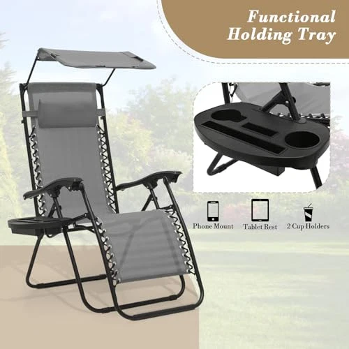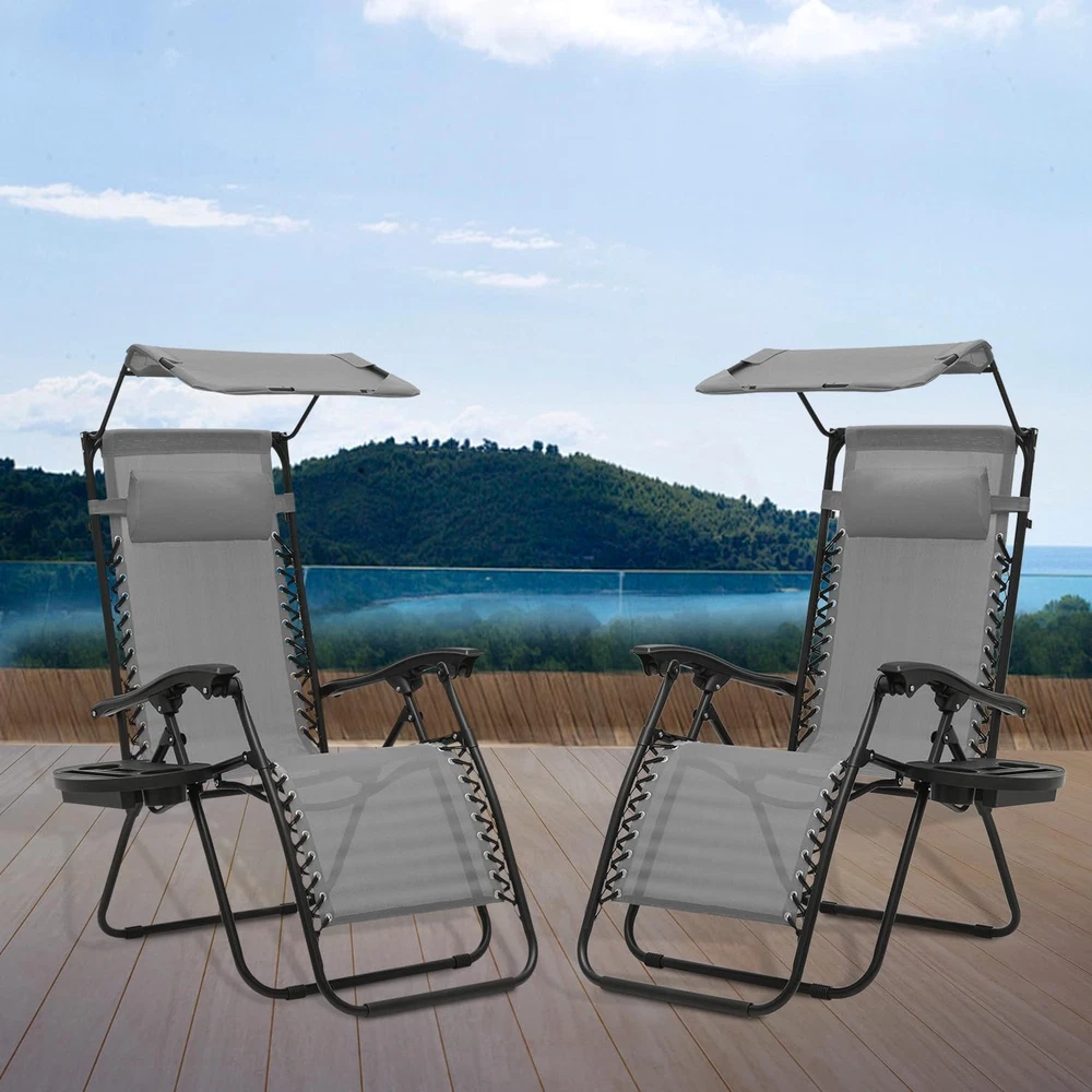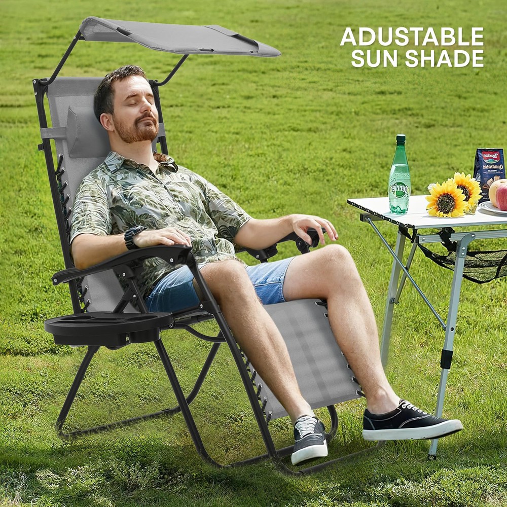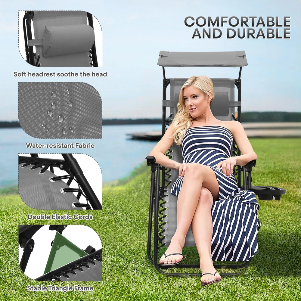 Going on an outdoor adventure? Discover the versatility of a folding chaise lounge chair! It the perfect seating companion for camping trips, picnics, sunbathing, or any other outdoor activity. Its compact design allows for easy storage and transport, making it a practical and space-saving option. Plus, with customizable features, durable construction, and a comfortable design, this chaise lounge chair delivers a convenient and relaxing seating experience for any occasion. Premium Materials: Composed of sturdy metal support and breathable mesh fabric with wear-resistant double bungee rope design enhances load-bearing and elasticity. The weight capacity of this outdoor chair set is 330 lbs. Flexible Adjustment: Featuring a lockable recline function, you can switch this beach chair’s recline to your liking when utilizing the flexible buttons. And this set of fabric lounge chairs can effectively relieve your fatigue Wide Range of Application: This foldable lawn chair can be placed in the trunk of a car and is easy to carry on outdoor trips. It can be used at the beach, poolside, courtyard, balcony, park, garden, etc. Premium Materials: Composed of sturdy metal support and breathable mesh fabric with wear-resistant double bungee rope design enhances load-bearing and elasticity. The weight capacity of this outdoor chair set is 330 lbs. Flexible Adjustment: Featuring a lockable recline function, you can switch this beach chair’s recline to your liking when utilizing the flexible buttons. And this set of fabric lounge chairs can effectively relieve your fatigue Removable Canopy and Tray: The reclining chair comes with a canopy sunshade to protect your face and eyes from the sun. And there is a headrest to relieve cervical spine pressure and a cup tray, which are all removable and can be adjusted according to your needs. Wide Range of Application: This foldable lawn chair can be placed in the trunk of a car and is easy to carry on outdoor trips. It can be used at the beach, poolside, courtyard, balcony, park, garden, etc. What You Get: 2*Lounge Chairs + 2*Canopy + 2*Tray + 2*Headrest. And the canopy can be adjusted according to different usage environments