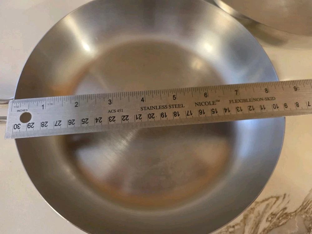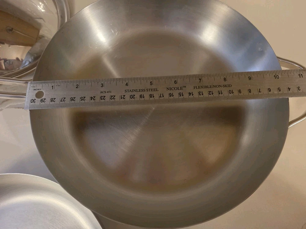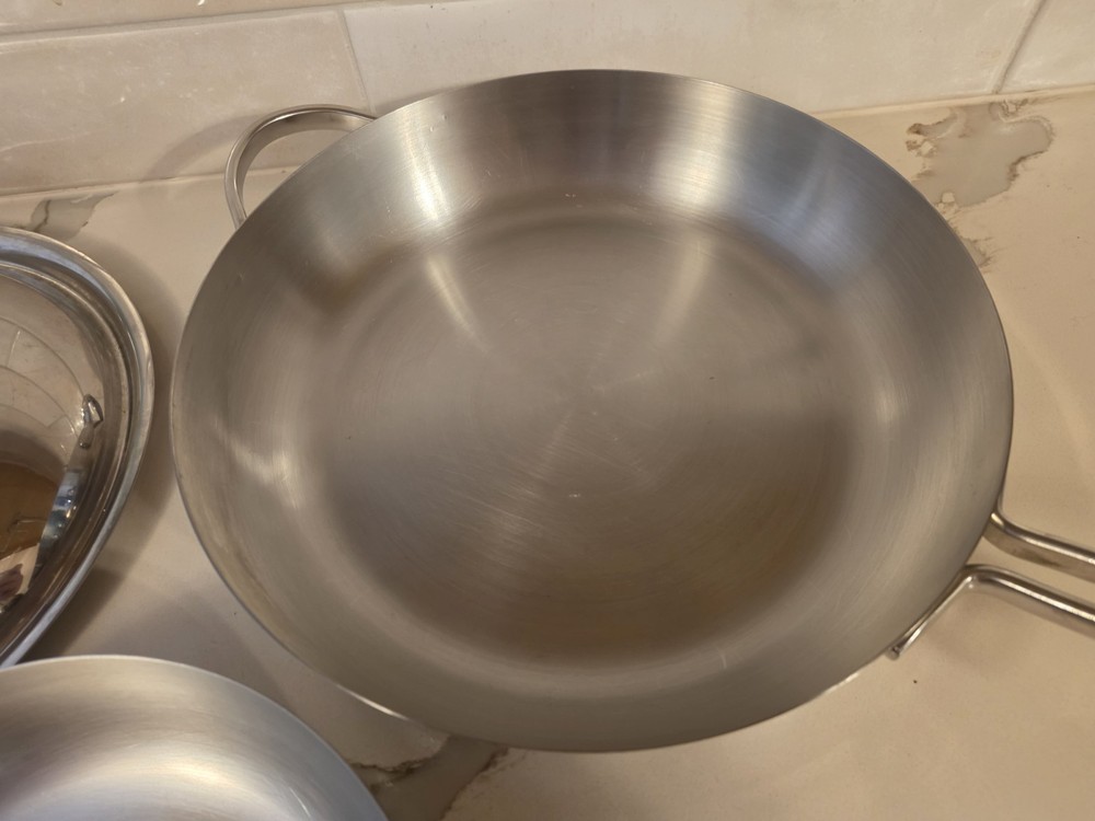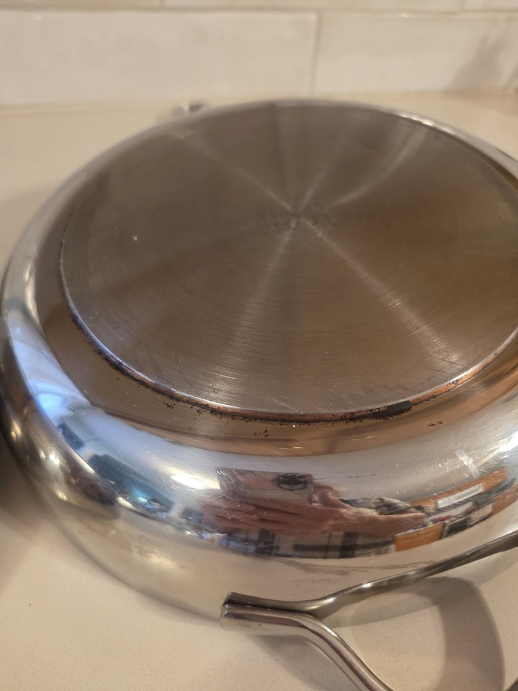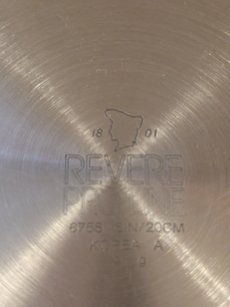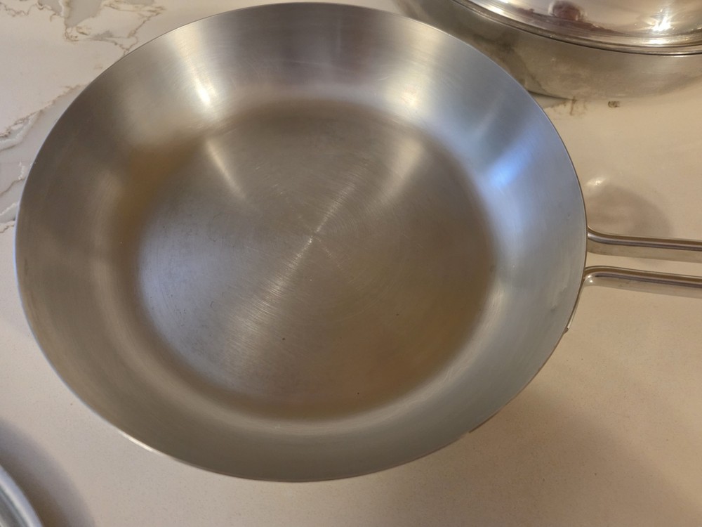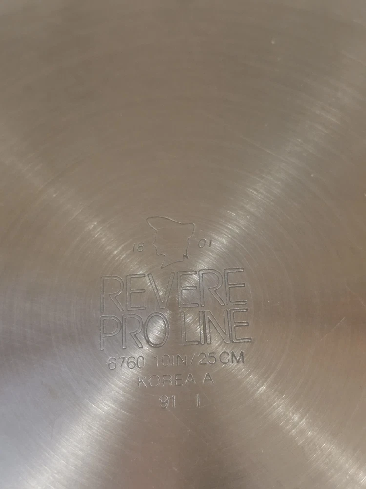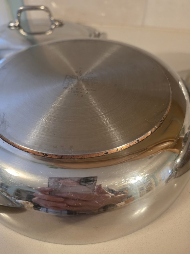 The 2 Revere Pro Line Fry Pans Skillets in stainless steel with a copper core, 8" and 10" with lids, are versatile cookware pieces suitable for use on both electric and gas stoves. This four-piece set includes two round skillets, two lids, and features a long handles for easy handling. The silver-colored pans are made of durable stainless steel with a copper core for added heat conductivity. With features like easy cleaning and dishwasher safe convenience, these skillets are a practical and stylish addition to any kitchen. Some staining around copper core and some surface scratches. Skillets sit flat 8" skillet is marked 6758 10" skillet is marked 6760 Shipping to continental US only unless