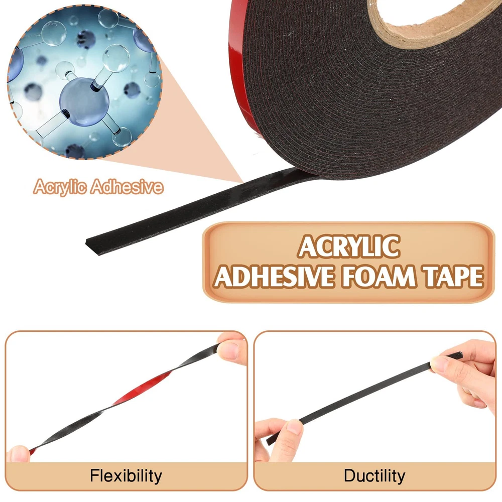 Features: A long time service: The double sided sticky tape is featured with waterproof design and applied for wide applications, which can accompany you for a long time. Nice performance: The adhesive strips can keep surfaces smooth, who can be applied to replace rivets, screws, spot welds and avoid drilling, grinding, refinishing, screwing, welding and associated clean up. Specifications: Material: foam Color: black, red Size: 1/4 inches/ 6 mm in width, about 50 ft/ 15 meter in length, 0.04 inches/ 1 mm in thickness Package includes: 2 Rolls of double stick tapes Notes: Manual measurement, please allow slight errors on size. The color may exist a slight difference due to different screen displays. What You Will Get: the package comes with 2 rolls of double stick tapes in black color with red release paper, useful helpers for your practical use and daily life, the quantity can meet your demand effectively Size Information: the foam waterproof tape is 1/4 inches/ 6 mm in width, about 50 ft/ 15 meter in length, 0.04 inches/ 1 mm in thickness, making it suitable for both indoor and outdoor use, such as kitchen and bathroom Easy Installation: this black double sided tape is easy to install, just peel off the tape and paste it to the surface of the objects, very flexible, which can also be very good to help you complete the task Versatile Use: the foam adhesive tape is an essential choice for mounting large and heavy tools, strip lights, car decorations, educational materials, posters and picture frames with durability and convenience Warm Tips: the double sided foam tape is suitable for most surfaces, including installations outdoors or in wet areas; Please keep the mounting surface dry, clean and oil free when using the tape to ensure that it is water and moisture resistant