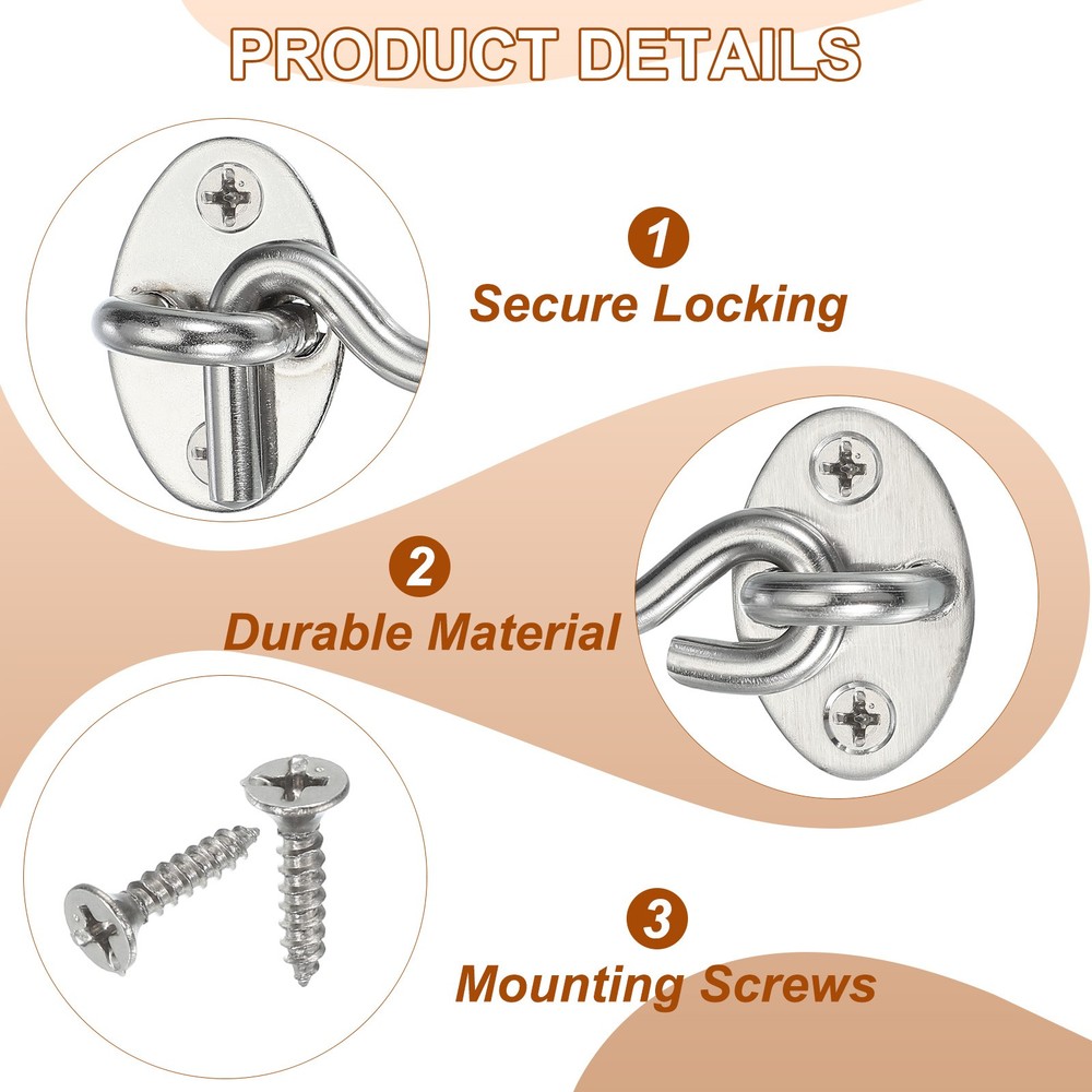 Document What is this?Hook eye latch, which is widely used in cabinets, sliding barn doors, cabin doors, swing windows, garages, sheds, gate, back doors, closet doors, front porches, fences, cabinets, shutters, alloy windows, etc., to secure the door by hooking the latch into the eye plate, thereby providing privacy and security.What will I get?The package contains 2 hook and eye latches, with 8 mounting screws. The door latch length is 8.5 cm / 3.3 inch; the mounting plate size is (W*H*Thickness): 40x21x2 mm /1.6 x 0.8 x 0.08 inch, the center distance is 27 mm / 1.1 inch, and the screw length is 15mm / 0.6 inchAre there any advantages of the product?The latch hook adopts the end hook design, which will not automatically unlock due to the push of the door, ensuring security and privacy.The stainless steel electroplating process makes the hook and eye latch durable, not easy to rust or breakage, and can be used for a long time in various weather environments.How to use it?Install the eye plate on the door frame and the hook latch on the corresponding door edge, aligning to ensure proper engagement.Close the door and hook the latch into the eye plate to secure the door in place.To unlock, simply lift the hook from the eye plate to release the door.What should I notice?Please confirm the door latch size is suitable for your door before placing an order. 2 Set Hook and Eye Latch Barn Door Lock Gate Latch 3" with Screws Silver What is this? Hook eye latch, which is widely used in cabinets, sliding barn doors, cabin doors, swing windows, garages, sheds, gate, back doors, closet doors, front porches, fences, cabinets, shutters, alloy windows, etc., to secure the door by hooking the latch into the eye plate, thereby providing privacy and security. What will I get? The package contains 2 hook and eye latches, with 8 mounting screws. The door latch length is 8.5 cm / 3.3 inch; the mounting plate size is (W*H*Thickness): 40x21x2 mm /1.6 x 0.8 x 0.08 inch, the center distance is 27 mm / 1.1 inch, and the screw length is 15mm / 0.6 inch Are there any advantages of the product? The latch hook adopts the end hook design, which will not automatically unlock due to the push of the door, ensuring security and privacy. The stainless steel electroplating process makes the hook and eye latch durable, not easy to rust or breakage, and can be used for a long time in various weather environments. How to use it? Install the eye plate on the door frame and the hook latch on the corresponding door edge, aligning to ensure proper engagement. Close the door and hook the latch into the eye plate to secure the door in place. To unlock, simply lift the hook from the eye plate to release the door. What should I notice? Please confirm the door latch size is suitable for your door before placing an order. Hot Item Payment 1.We accept eBay payment . 2.Payment must be received within 7 business days of auction closing. Shipping 1.We ship to your eBay or Paypal address. Please make sure your eBay and Paypal address is correct before you pay. 2.Items will be shipped within 1-3 business day when we received payment. 3.Delivery time depends on destination and other factors. Description Policy 2 Set Hook and Eye Latch Barn Door Lock Gate Latch 3" with Screws Silver What is this? Hook eye latch, which is widely used in cabinets, sliding barn doors, cabin doors, swing windows, garages, sheds, gate, back doors, closet doors, front porches, fences, cabinets, shutters, alloy windows, etc., to secure the door by hooking the latch into the eye plate, thereby providing privacy and security. What will I get? The package contains 2 hook and eye latches, with 8 mounting screws. The door latch length is 8.5 cm / 3.3 inch; the mounting plate size is (W*H*Thickness): 40x21x2 mm /1.6 x 0.8 x 0.08 inch, the center distance is 27 mm / 1.1 inch, and the screw length is 15mm / 0.6 inch Are there any advantages of the product? The latch hook adopts the end hook design, which will not automatically unlock due to the push of the door, ensuring security and privacy. The stainless steel electroplating process makes the hook and eye latch durable, not easy to rust or breakage, and can be used for a long time in various weather environments. How to use it? Install the eye plate on the door frame and the hook latch on the corresponding door edge, aligning to ensure proper engagement. Close the door and hook the latch into the eye plate to secure the door in place. To unlock, simply lift the hook from the eye plate to release the door. What should I notice? Please confirm the door latch size is suitable for your door before placing an order. Hot Item Payment 1.We accept eBay payment . 2.Payment must be received within 7 business days of auction closing. Shipping 1.We ship to your eBay or Paypal address. Please make sure your eBay and Paypal address is correct before you pay. 2.Items will be shipped within 1-3 business day when we received payment. 3.Delivery time depends on destination and other factors.