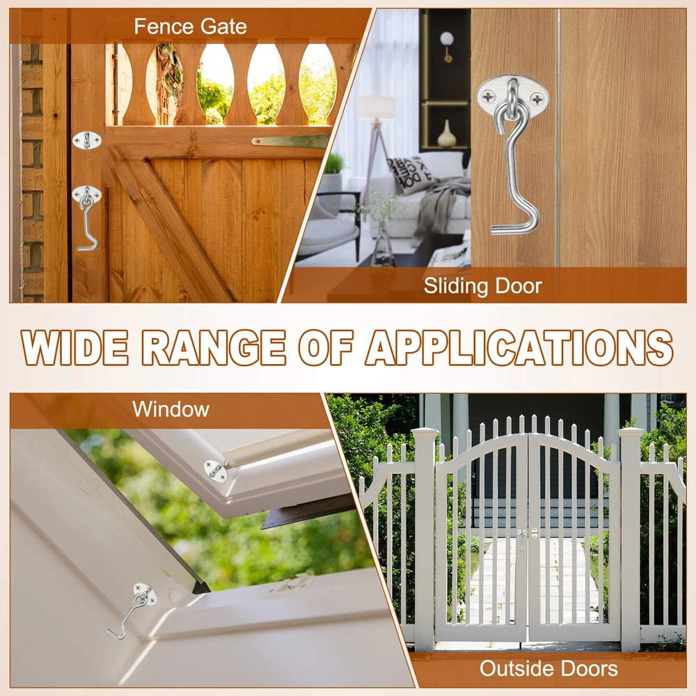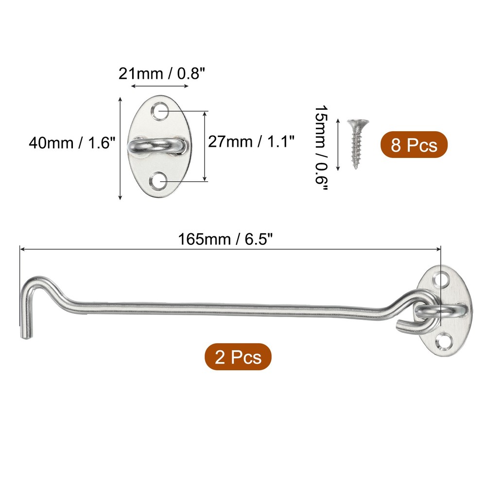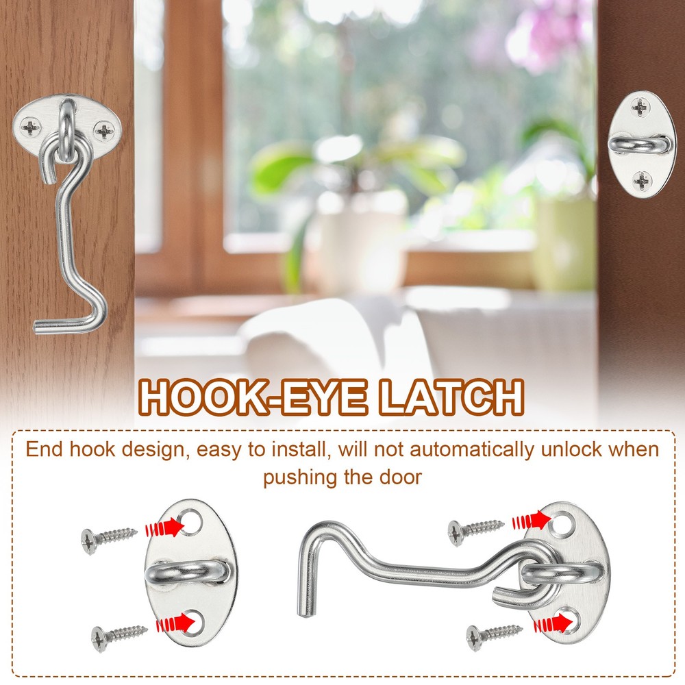 Document What is this?Hook eye latch, which is widely used in cabinets, sliding barn doors, cabin doors, swing windows, garages, sheds, gate, back doors, closet doors, front porches, fences, cabinets, shutters, alloy windows, etc., to secure the door by hooking the latch into the eye plate, thereby providing privacy and security.What will I get?The package contains 2 hook and eye latches, with 8 mounting screws. The door latch length is 16.5 cm / 6.5 inch; the mounting plate size is (W*H*Thickness): 40x21x2 mm /1.6 x 0.8 x 0.08 inch, the center distance is 27 mm / 1.1 inch, and the screw length is 15mm / 0.6 inchAre there any advantages of the product?The latch hook adopts the end hook design, which will not automatically unlock due to the push of the door, ensuring security and privacy.The stainless steel electroplating process makes the hook and eye latch durable, not easy to rust or breakage, and can be used for a long time in various weather environments.How to use it?Install the eye plate on the door frame and the hook latch on the corresponding door edge, aligning to ensure proper engagement.Close the door and hook the latch into the eye plate to secure the door in place.To unlock, simply lift the hook from the eye plate to release the door.What should I notice?Please confirm the door latch size is suitable for your door before placing an order. 2 Set Hook and Eye Latch Barn Door Lock Gate Latch 6" with Screws Silver What is this? Hook eye latch, which is widely used in cabinets, sliding barn doors, cabin doors, swing windows, garages, sheds, gate, back doors, closet doors, front porches, fences, cabinets, shutters, alloy windows, etc., to secure the door by hooking the latch into the eye plate, thereby providing privacy and security. What will I get? The package contains 2 hook and eye latches, with 8 mounting screws. The door latch length is 16.5 cm / 6.5 inch; the mounting plate size is (W*H*Thickness): 40x21x2 mm /1.6 x 0.8 x 0.08 inch, the center distance is 27 mm / 1.1 inch, and the screw length is 15mm / 0.6 inch Are there any advantages of the product? The latch hook adopts the end hook design, which will not automatically unlock due to the push of the door, ensuring security and privacy. The stainless steel electroplating process makes the hook and eye latch durable, not easy to rust or breakage, and can be used for a long time in various weather environments. How to use it? Install the eye plate on the door frame and the hook latch on the corresponding door edge, aligning to ensure proper engagement. Close the door and hook the latch into the eye plate to secure the door in place. To unlock, simply lift the hook from the eye plate to release the door. What should I notice? Please confirm the door latch size is suitable for your door before placing an order. Hot Item Payment 1.We accept eBay payment . 2.Payment must be received within 7 business days of auction closing. Shipping 1.We ship to your eBay or Paypal address. Please make sure your eBay and Paypal address is correct before you pay. 2.Items will be shipped within 1-3 business day when we received payment. 3.Delivery time depends on destination and other factors. Description Policy 2 Set Hook and Eye Latch Barn Door Lock Gate Latch 6" with Screws Silver What is this? Hook eye latch, which is widely used in cabinets, sliding barn doors, cabin doors, swing windows, garages, sheds, gate, back doors, closet doors, front porches, fences, cabinets, shutters, alloy windows, etc., to secure the door by hooking the latch into the eye plate, thereby providing privacy and security. What will I get? The package contains 2 hook and eye latches, with 8 mounting screws. The door latch length is 16.5 cm / 6.5 inch; the mounting plate size is (W*H*Thickness): 40x21x2 mm /1.6 x 0.8 x 0.08 inch, the center distance is 27 mm / 1.1 inch, and the screw length is 15mm / 0.6 inch Are there any advantages of the product? The latch hook adopts the end hook design, which will not automatically unlock due to the push of the door, ensuring security and privacy. The stainless steel electroplating process makes the hook and eye latch durable, not easy to rust or breakage, and can be used for a long time in various weather environments. How to use it? Install the eye plate on the door frame and the hook latch on the corresponding door edge, aligning to ensure proper engagement. Close the door and hook the latch into the eye plate to secure the door in place. To unlock, simply lift the hook from the eye plate to release the door. What should I notice? Please confirm the door latch size is suitable for your door before placing an order. Hot Item Payment 1.We accept eBay payment . 2.Payment must be received within 7 business days of auction closing. Shipping 1.We ship to your eBay or Paypal address. Please make sure your eBay and Paypal address is correct before you pay. 2.Items will be shipped within 1-3 business day when we received payment. 3.Delivery time depends on destination and other factors.