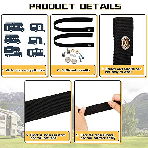 Return Policy Fast Delivery Trusted seller 2 Sets RV Sliding Door Straps with Button Snap 18 Inch RV Pocket Camper Door Straps for Pontoon Boat Ladder Accessories, Black Product Description Complete Set: the package includes 2 pieces of RV door straps, 2 pieces of stainless steel mount screws with decorative screw caps, and 2 pieces of stainless steel snap base stud screws, sufficient to use, replace what you have, or keep as a spare Widely Applicable: the door strap can serve well as a holdback for RV pocket doors, RV sliding doors, folding doors, camper doors, shower curtains, boat ladders and so on, practical and versatile Use with Confidence: made of quality polyester webbing material, the door security strap is strong and reliable, abrasion resistant, not easy to wear, tear or break, can withstand outdoor environments, serving you for a long time High Strength: the RV sliding door straps measure about 46 cm/ 18 inches in length, 2.5 cm/ 1 inches in width, with a minimum breaking strength of 4000lb /17.8 kN, will not fade, discolor or bleed even in water Necessary Assistant: the RV pocket door straps are designed to keep sliding doors in the open position while traveling, so you don't need to worry about doors slamming into each other while going down the road Shipping Returns Payment Shipping Shipping is FREE to all addresses other than APO/PO boxes in the lower 48 states. All our stock ships from US-based warehouses. Shipped via USPS or UPS (depending on location and package weight) Unless stated otherwise, all orders will ship within 24-72 hours of your payment being processed. Check our feedback to see the great reviews of FAST shipping we offer. Returns Seller does not accept returns Payment We currently accept payment via eBay managed payments only. Once payment is cleared, we will dispatch your shipment within 1-3 business days. Please refer to the "Shipping" tab for more information regarding shipping speed to your destination.