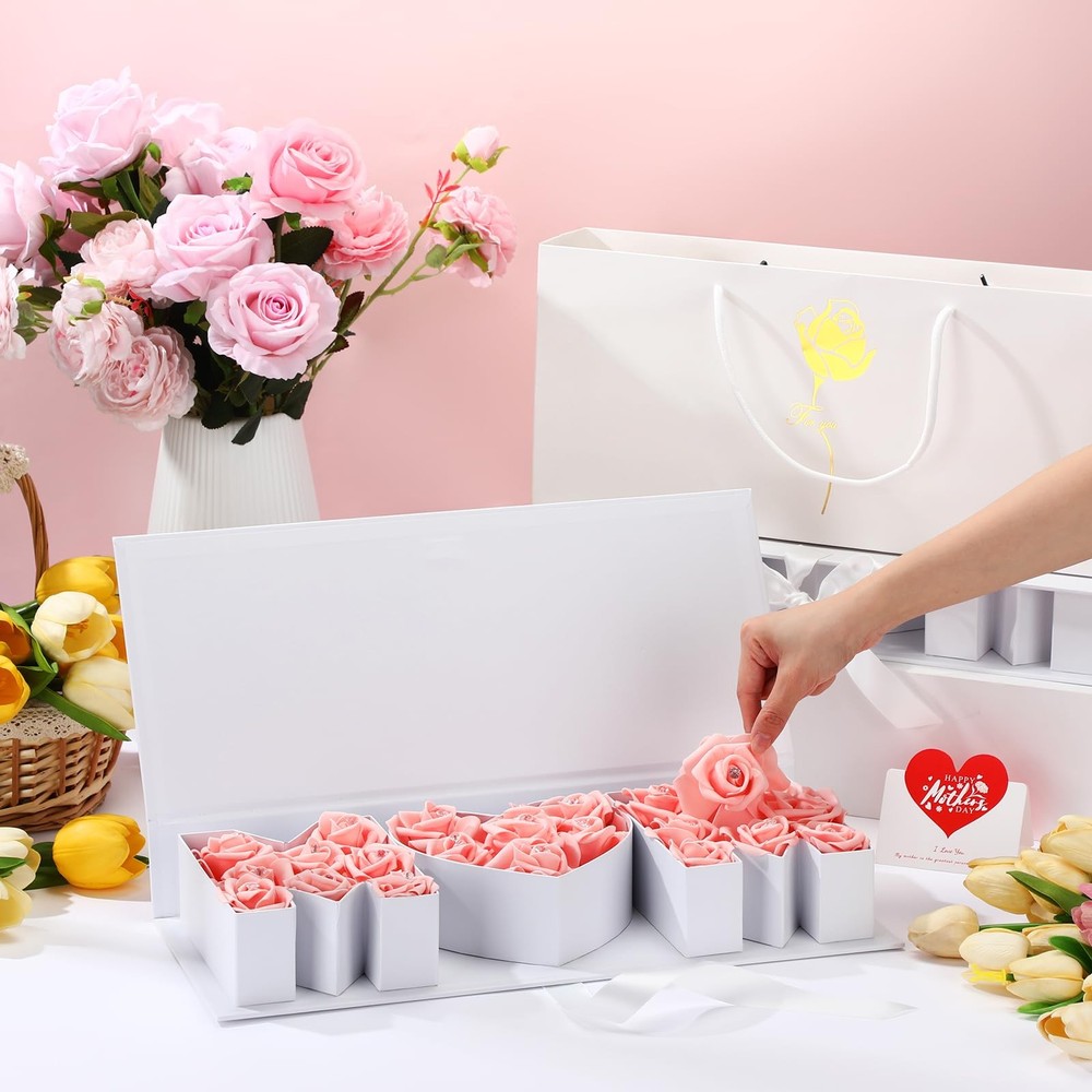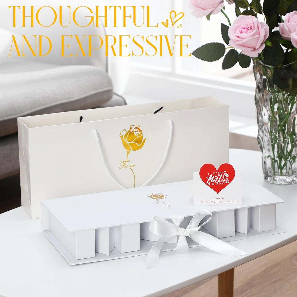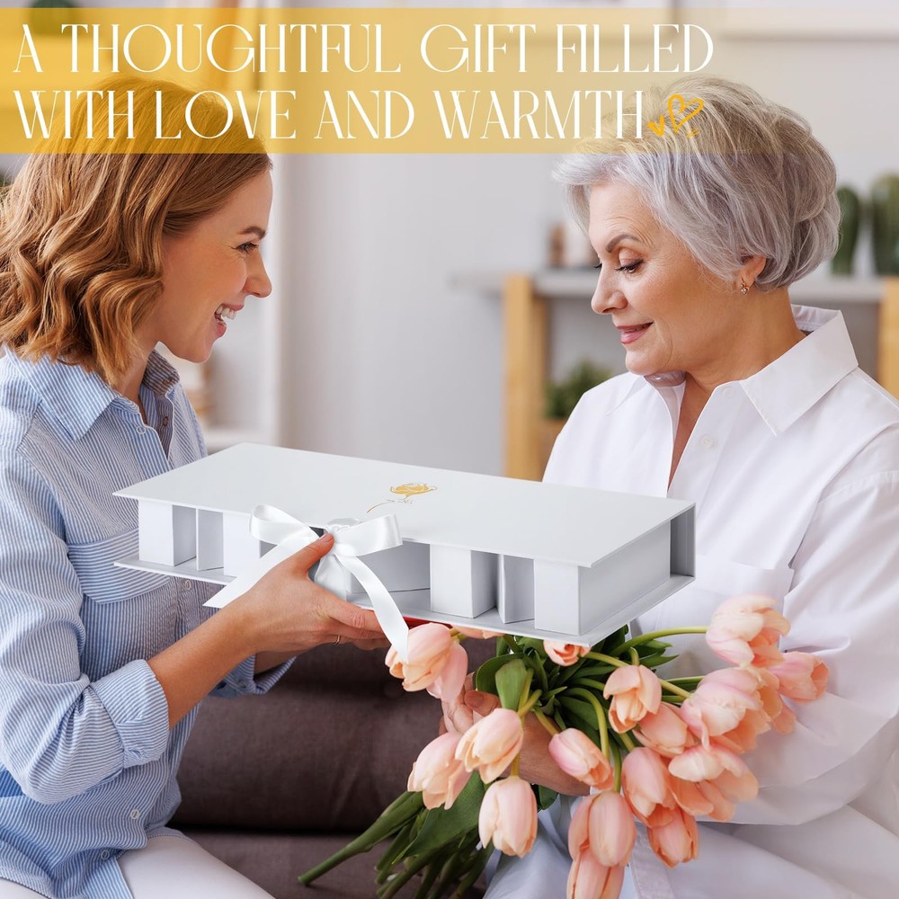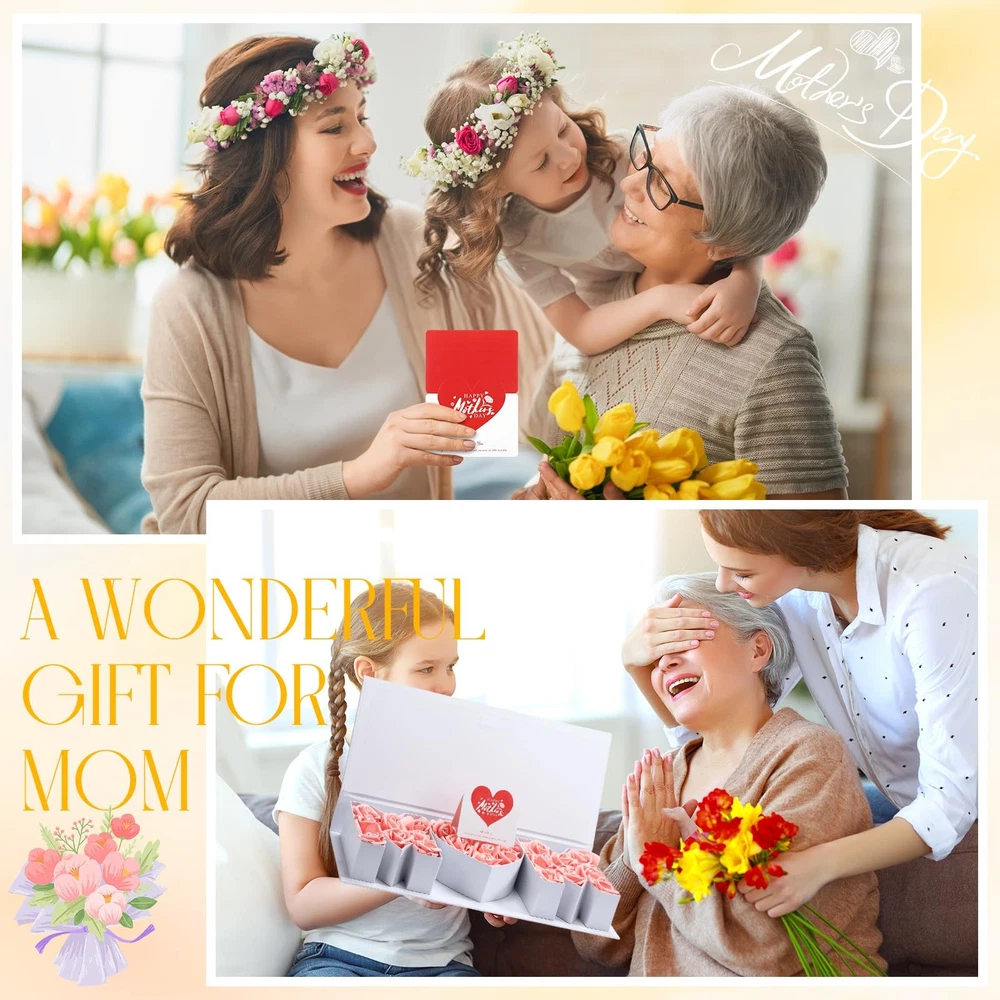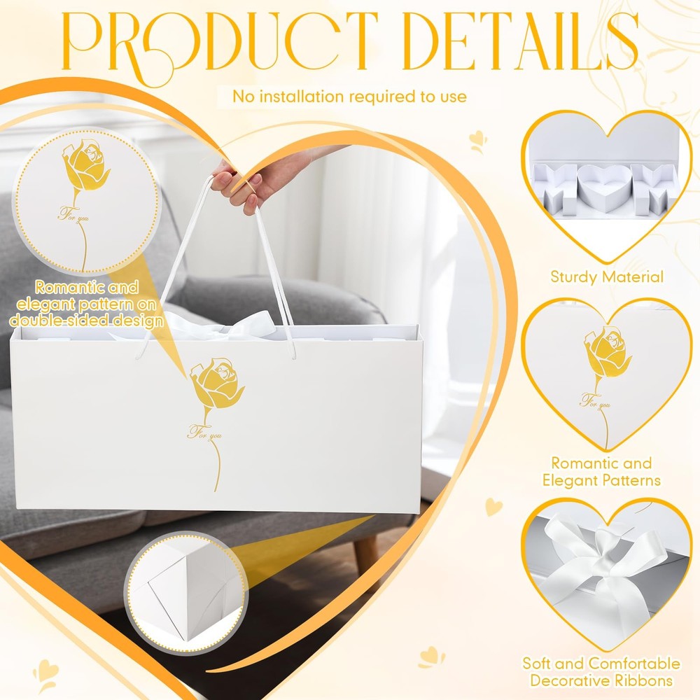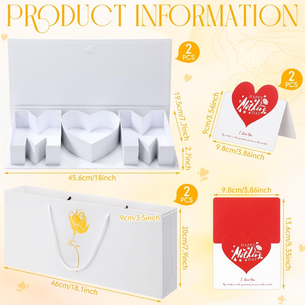 Features: The sophisticated "MOM" letter design doubles as a decorative centerpiece. Whether used as a gift or part of a celebration setup, these boxes add a stylish and heartfelt touch to any table or display These flower gift boxes invite you to add a personal touch. Whether you fill them with handmade crafts, unique keepsakes, or specially curated items, the customizable space allows you to create a memorable gift for your mom Specifications: Material: paper Color: white Size: Letter gift box: 18 x 7.7 x 2.7 inches Gift bag: 18.1 x 7.9 x 3.5 inches Package includes: 2 x Mom flower box 2 x Gift bags 2 x Greeting cards Notes: Manual measurement, please allow slight errors on size. The color may exist a slight difference due to different screen displays. Creative Flower Gift Box: contains 2 elegant "MOM" letter shaped flower boxes with 2 matching exquisite gift bags and 2 greeting cards; The creative and thoughtful combination means you no longer need to buy additional packaging bags; And its elegant MOM letter shape gives a delicate feeling, suitable for DIY Mother's Day gifts Practical Size: the size of the "MOM" letter gift box provides ample space for your gifts, and the cardboard letters box measures about 18 x 7.7 x 2.7 inches (with ribbon), the gift bag measures about 18.1 x 7.9 x 3.5 inches, and are ideal for a variety of gifts, from flowers to chocolates Sturdy and Quality: the empty mom flower box and gift bag are made of sturdy cardboard with a smooth surface that is easy to clean; You can put flowers, food or souvenirs in the box and write your blessings, making it a thoughtful gift designed specifically for mom; Paired with a gift bag of the same style, exactly show your love Thoughtful Gift: these Mother's Day gift boxes are carefully considered, with every detail incorporated into the exquisite design, which contains love and warmth; The included MOM letter and ribbon add a touch of elegance and enhance the visual appeal, these boxes are an impressive way to express your sincere feelings Versatile Application: in addition to flowers, these charming mom letter boxes can also hold other gifts such as candies, snacks, cosmetics and toys, suitable for giving your loved ones an exquisite surprise gift