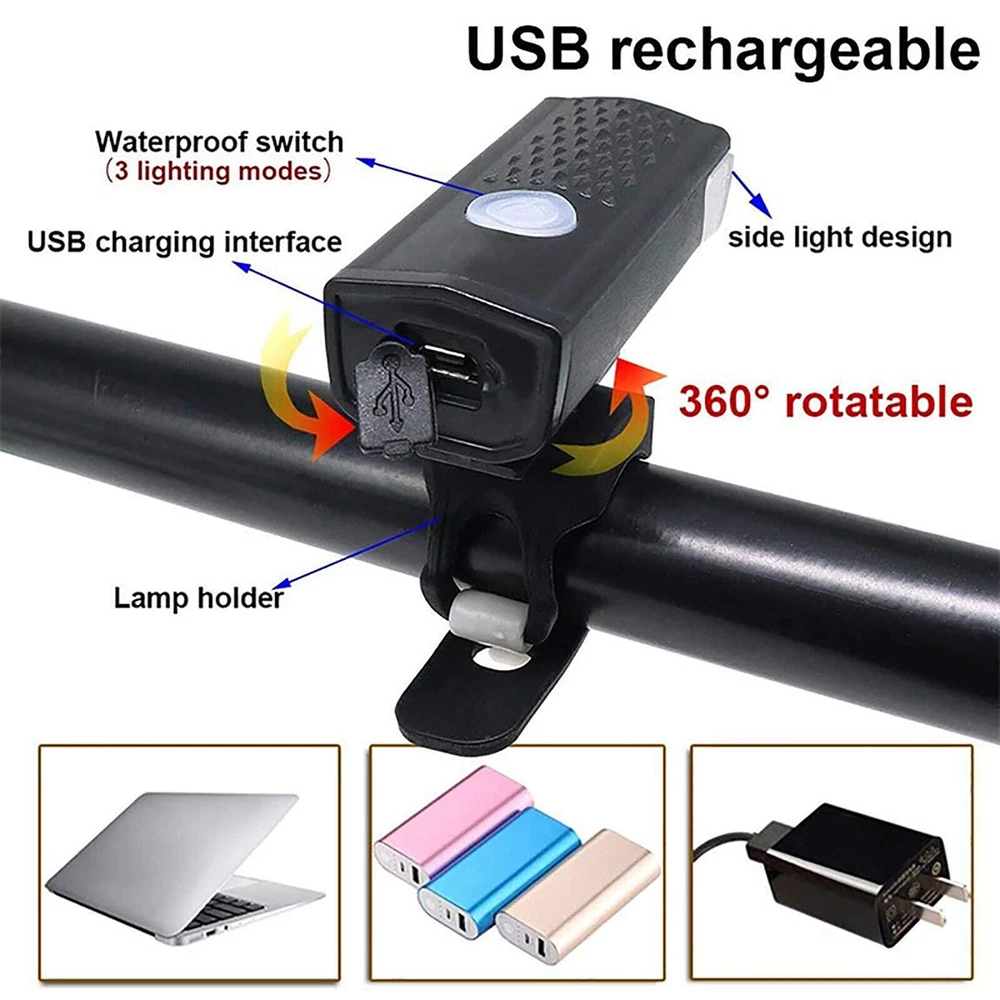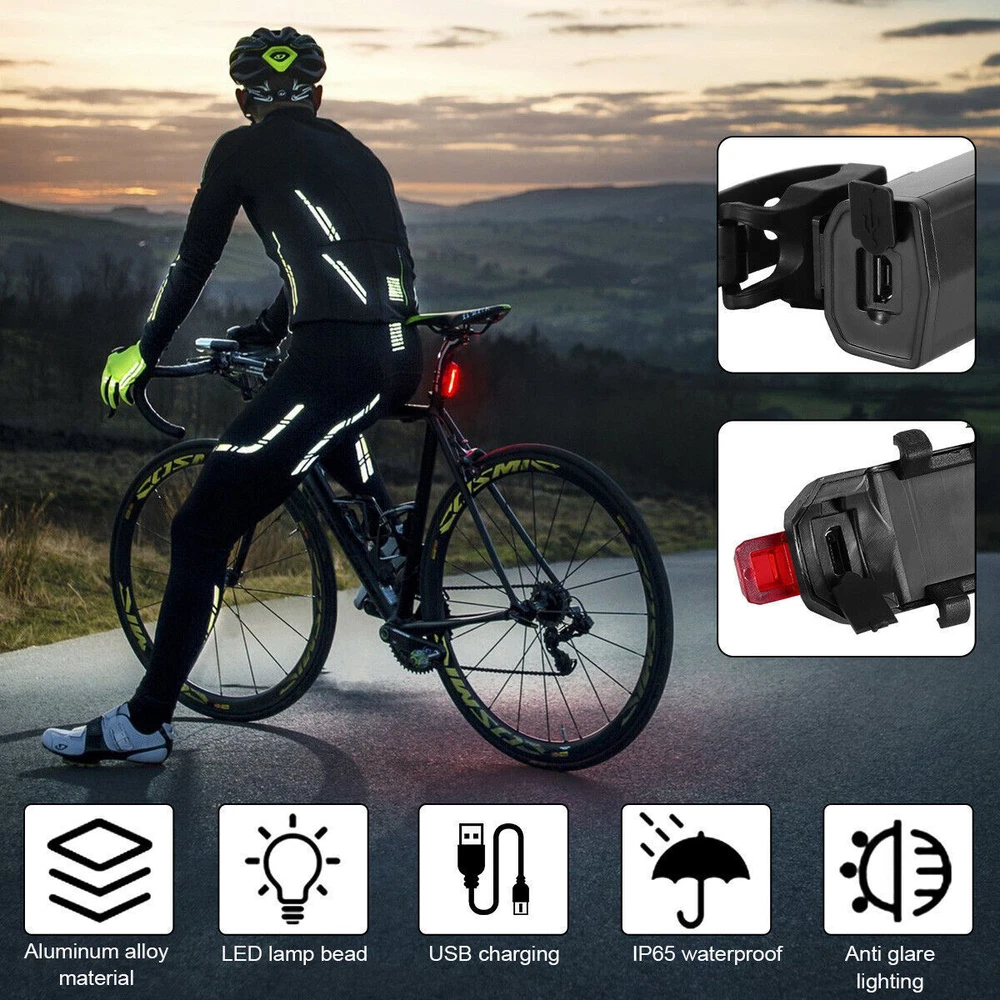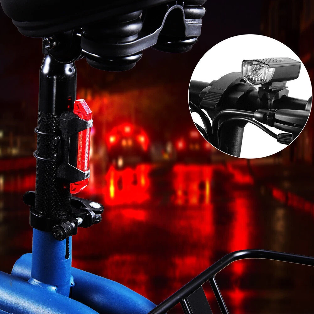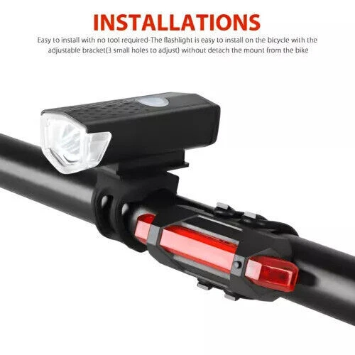 Product Description Product Features: Super Bright Bike Lights: Include Front Cycling Light and Back Light Front light has 3 modes-High/Low/Flashing,torch light with bike clamp, Button switch. Special designed light beam produces powerful lumen and generates a brilliant floodlight for Large area without wasting energy. USB rechargeable: Built in Rechargeable Li-ion battery, easily charged from your computer or any device with a USB port. 360º Visibility: Safety set for riding at night.Both a headlight and a tail light making your bicycle stand out with unmatched 360º visibility so you and your loved ones are safer in any low light conditions. Durable bike lights-Durable aluminum body, shock-resistance endure rough handling. Do not be afraid of the rough road. Waterproof: IP65-rated water resistant and designed for use in heavy rain and outside riding. Mini design ,lightweight,space-saving. A perfect gift for yourself or friend Installations: Easy to install with no tool required The fla shlight is easy to install on the bicycle with the adjusta ble bracket(3 small holes to adjust) without detach the mount from the bike. Specification: Condition: 100% Brand New and High Quality ! Type: Bicycle Light Materials: Aluminum alloy+Rubber Color: Black headlight+Red tail light Charging Method: USB Rechargeable Headlight Light Modes: (High/Low/Flashing) Taillight Light Modes: (Slide-Flashing-Always on) Waterproof Rate: IP65 Power Indicator: Battery Indicator LED flashes when battery power is low giving you time to lower light mode and conserve power. Mode Memory Function: returns to the mode last selected before powering down. Application: for cycling, hiking, camping, or any outdoor activity Package Includes: 2 x Front Light 2 x Back Light 4 x USB Cable 4 x O-ring Payment Shipping Returns Contact Us All Modes of Payment are acceptable,such as Apple pay, Google pay, PayPal, credit card, etc. We will deliver the items to you within the processing time. Please provide us your correct receiving address (include house number, Street name) , so that we can ship the order to you as soon as possible! If you need us to ship the items by other way, please feel free to contact us. Thanks! Please check your shipping address carefully before checkout, it can't be changed if order completed. If you are not satisfied with your purchasing, you can return the product and get a full refund. But we will not responsible for the shipping and people damaged. You can return a product for up to 30 days from the date you’ve purchased it. Please contact us to confirm the return address before you return the items. Incorrect/Faulty/Damaged Items: Please contact us to arrange for the return via eBay messaging or one of the numbers above. NO postage will be refunded unless agreed upon in email or writing prior to returning. Monday to Friday 9:00 am to 6:00 pm. We do not work holidays . If you send email to us,In our working hours will be resumed within 24 hours. If you we are not satisfied with the product or service ,please contact me and don't give us negative or natural feedback,We must give you a satisfactory solution. Payment All Modes of Payment are acceptable,such as Apple pay, Google pay, PayPal, credit card, etc. Shipping We will deliver the items to you within the processing time. Please provide us your correct receiving address (include house number, Street name) , so that we can ship the order to you as soon as possible! If you need us to ship the items by other way, please feel free to contact us. Thanks! Please check your shipping address carefully before checkout, it can't be changed if order completed. Returns If you are not satisfied with your purchasing, you can return the product and get a full refund. But we will not responsible for the shipping and people damaged. You can return a product for up to 30 days from the date you’ve purchased it. Please contact us to confirm the return address before you return the items. Incorrect/Faulty/Damaged Items: Please contact us to arrange for the return via eBay messaging or one of the numbers above. NO postage will be refunded unless agreed upon in email or writing prior to returning. Contact Us Monday to Friday 9:00 am to 6:00 pm. We do not work holidays . If you send email to us,In our working hours will be resumed within 24 hours. If you we are not satisfied with the product or service ,please contact me and don't give us negative or natural feedback,We must give you a satisfactory solution. powered by