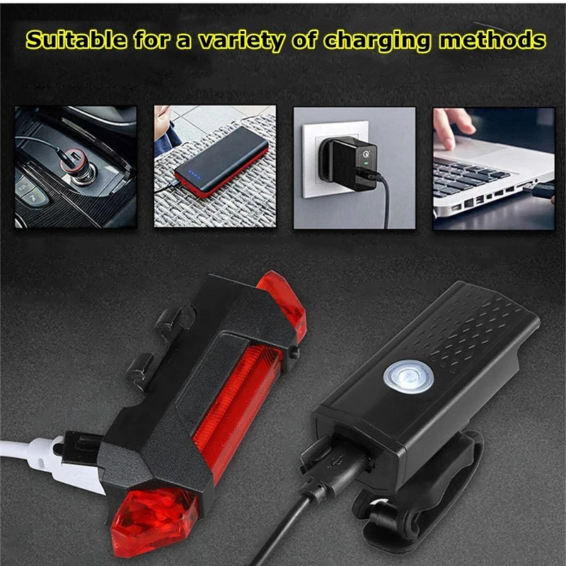 Product Features: Super Bright Bike Lights: Include Front Cycling Light and Back Light Front light has 3 modes-High/Low/Flashing,torch light with bike clamp, Button switch. Special designed light beam produces powerful lumen and generates a brilliant floodlight for Large area without wasting energy. USB rechargeable: Built in Rechargeable Li-ion battery, easily charged from your computer or any device with a USB port. 360º Visibility: Safety set for riding at night.Both a headlight and a tail light making your bicycle stand out with unmatched 360º visibility so you and your loved ones are safer in any low light conditions. Durable bike lights-Durable aluminum body, shock-resistance endure rough handling. Do not be afraid of the rough road. Waterproof: IP65-rated water resistant and designed for use in heavy rain and outside riding. Mini design ,lightweight,space-saving. A perfect gift for yourself or friend Installations: Easy to install with no tool required The fla shlight is easy to install on the bicycle with the adjusta ble bracket(3 small holes to adjust) without detach the mount from the bike. Specification: Condition: 100% Brand New and High Quality ! Type: Bicycle Light Materials: Aluminum alloy+Rubber Color: Black headlight+Red tail light Charging Method: USB Rechargeable Headlight Light Modes: (High/Low/Flashing) Taillight Light Modes: (Slide-Flashing-Always on) Waterproof Rate: IP65 Power Indicator: Battery Indicator LED flashes when battery power is low giving you time to lower light mode and conserve power. Mode Memory Function: returns to the mode last selected before powering down. Application: for cycling, hiking, camping, or any outdoor activity Package Includes: 2 x Front Light 2 x Back Light 4 x USB Cable 4 x O-ring